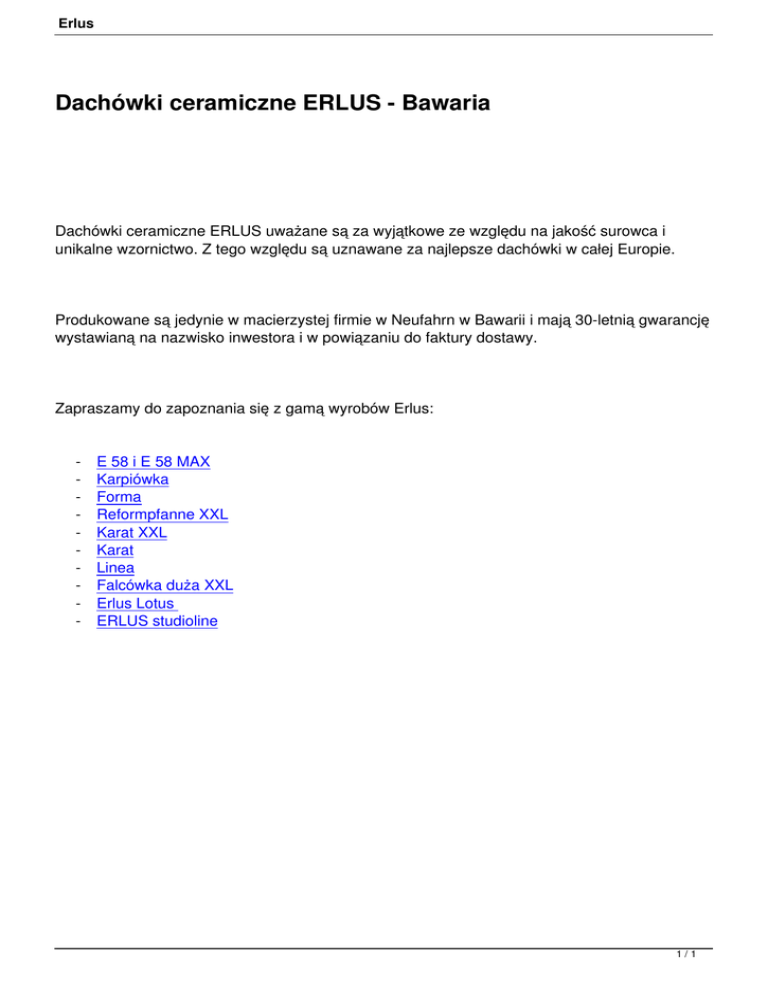 Erlus Dachówki ceramiczne ERLUS - Bawaria Dachówki ceramiczne ERLUS uważane są za wyjątkowe ze względu na jakość surowca i unikalne wzornictwo. Z tego względu są uznawane za najlepsze dachówki w całej Europie. Produkowane są jedynie w macierzystej firmie w Neufahrn w Bawarii i mają 30-letnią gwarancję wystawianą na nazwisko inwestora i w powiązaniu do faktury dostawy. Zapraszamy do zapoznania się z gamą wyrobów Erlus: - E 58 i E 58 MAX Karpiówka Forma Reformpfanne XXL Karat XXL Karat Linea Falcówka duża XXL Erlus Lotus ERLUS studioline 1/1