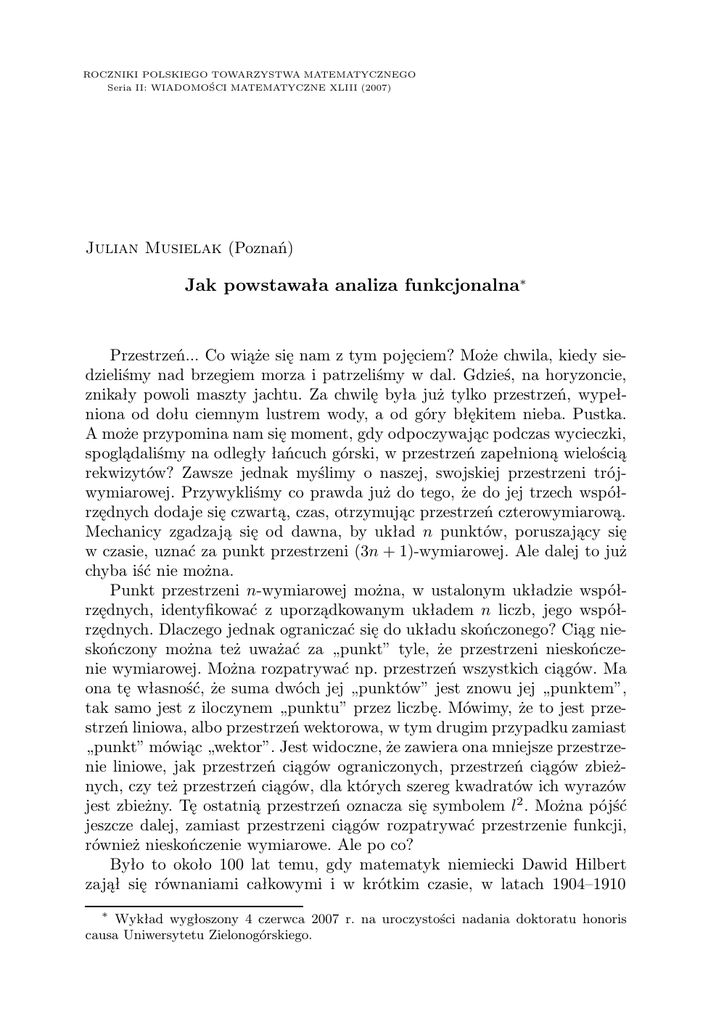 ROCZNIKI POLSKIEGO TOWARZYSTWA MATEMATYCZNEGO Seria II: WIADOMOŚCI MATEMATYCZNE XLIII (2007) Julian Musielak (Poznań) Jak powstawała analiza funkcjonalna∗ Przestrzeń... Co wiąże się nam z tym pojęciem? Może chwila, kiedy siedzieliśmy nad brzegiem morza i patrzeliśmy w dal. Gdzieś, na horyzoncie, znikały powoli maszty jachtu. Za chwilę była już tylko przestrzeń, wypełniona od dołu ciemnym lustrem wody, a od góry błękitem nieba. Pustka. A może przypomina nam się moment, gdy odpoczywając podczas wycieczki, spoglądaliśmy na odległy łańcuch górski, w przestrzeń zapełnioną wielością rekwizytów? Zawsze jednak myślimy o naszej, swojskiej przestrzeni trójwymiarowej. Przywykliśmy co prawda już do tego, że do jej trzech współrzędnych dodaje się czwartą, czas, otrzymując przestrzeń czterowymiarową. Mechanicy zgadzają się od dawna, by układ n punktów, poruszający się w czasie, uznać za punkt przestrzeni (3n + 1)-wymiarowej. Ale dalej to już chyba iść nie można. Punkt przestrzeni n-wymiarowej można, w ustalonym układzie współrzędnych, identyfikować z uporządkowanym układem n liczb, jego współrzędnych. Dlaczego jednak ograniczać się do układu skończonego? Ciąg nieskończony można też uważać za „punkt” tyle, że przestrzeni nieskończenie wymiarowej. Można rozpatrywać np. przestrzeń wszystkich ciągów. Ma ona tę własność, że suma dwóch jej „punktów” jest znowu jej „punktem”, tak samo jest z iloczynem „punktu” przez liczbę. Mówimy, że to jest przestrzeń liniowa, albo przestrzeń wektorowa, w tym drugim przypadku zamiast „punkt” mówiąc „wektor”. Jest widoczne, że zawiera ona mniejsze przestrzenie liniowe, jak przestrzeń ciągów ograniczonych, przestrzeń ciągów zbieżnych, czy też przestrzeń ciągów, dla których szereg kwadratów ich wyrazów jest zbieżny. Tę ostatnią przestrzeń oznacza się symbolem l2 . Można pójść jeszcze dalej, zamiast przestrzeni ciągów rozpatrywać przestrzenie funkcji, również nieskończenie wymiarowe. Ale po co? Było to około 100 lat temu, gdy matematyk niemiecki Dawid Hilbert zajął się równaniami całkowymi i w krótkim czasie, w latach 1904–1910 ∗ Wykład wygłoszony 4 czerwca 2007 r. na uroczystości nadania doktoratu honoris causa Uniwersytetu Zielonogórskiego. 100 J. M u s i e l a k Prof. Julian Musielak podczas uroczystości ogłosił na ten temat 6 prac w czasopiśmie Nachrichten der Wissenschaften, Universität Göttingen [11]. W tym samym czasie 2 prace na ten sam temat napisał inny matematyk niemiecki, Erhard Schmidt. W ten sposób powstała teoria Hilberta-Schmidta równań całkowych. Opierała się ona na wynikach, dotyczących przestrzeni l2 ciągów oraz odpowiadającej jej przestrzeni L2 funkcji całkowalnych z kwadratem. Fundamentalne okazało się traktowanie tych klas jako przestrzeni o pewnych własnościach geometrycznych, jak długość wektora czy kąt między wektorami. Wspomniane przestrzenie zostały nazwane przestrzeniami Hilberta i rychło znalazły ważne zastosowania. Wspomnę o dwóch z nich. Jedno dotyczy teorii prawdopodobieństwa, interpretowanego jako miara unormowana do jedynki w klasie zdarzeń losowych. Okazało się, że wariancja zmiennej losowej wyraża się za pomocą pewnej całki, więc zmienna ta jest punktem przestrzeni Hilberta. Drugie z zastosowań dotyczy klasycznej mechaniki kwantowej, w której funkcja stanu jest punktem przestrzeni unitarnej, czyli przestrzeni Hilberta pozbawionej aksjomatu zupełności. W centrum zainteresowania znajdują się operatory w przestrzeni funkcji stanu. Okazuje się, że słynna zasada nieoznaczoności Heisenberga w odniesieniu do operatorów położenia i pędu sprowadza się do pewnej nierówności, wynikającej z zespolonej postaci nierówności Schwarza. Jak powstawała analiza funkcjonalna 101 Od lewej: prof. Julian Musielak, dziekan Wydziału Matematyki, Informatyki i Ekonometrii UZ prof. Andrzej Cegielski, Rektor UZ prof. Czesław Osękowski Do badań w tym kierunku dołączył w latach 1907–1913 ([17]–[20]) młody matematyk węgierski, Fryderyk Riesz, który w badaniach Hilberta zastąpił kwadrat potęgą p ≥ 1, rezygnując tym samym z pojęcia kąta. Teorię równań całkowych Hilberta–Schmidta zastąpił teorią operatora liniowego, nazwaną teorią Riesza. Niezależnie od tego, w czterech pracach ([8],[9]) z lat 1904– 1907 badania abstrakcyjnych przestrzeni liniowych podjął francuski matematyk Maurice Fréchet. Wreszcie w roku 1914 niemiecki matematyk Felix Hausdorff opublikował dzieło „Grundzüge der Mengenlehre” [10], wprowadzając i rozwijając teorię przestrzeni metrycznych. Tym można zamknąć okres powstawania nowego kierunku badań w matematyce, który zresztą nie nosił wówczas nazwy analiza funkcjonalna. Z inicjatywy Frécheta, kierunek ten nazywano teorią operacji liniowych. W okresie pierwszej wojny światowej nie ukazała się żadna istotna dla nowej dziedziny publikacja. Po wojnie badania zostały podjęte na nowo. Podstawowym problemem było stworzenie optymalnej definicji przestrzeni. Powinna ona mieć dwie cechy. Po pierwsze, winna opierać się na możliwie prostym systemie aksjomatów, dających się łatwo zinterpretować geometrycznie. Po drugie, winna prowadzić do wielu niebanalnych zastosowań w różnych dziedzinach matematyki, także poza tak zw. matematyką czystą. Udało się to zrobić we Lwowie, mieście o dużych tradycjach w Polsce, która właśnie odzyskała niepodległość. Łączą się z tym dwa wielkie nazwiska: Hugona Steinhausa i Stefana Banacha. Można by powiedzieć, że Steinhaus wynalazł Banacha, 102 J. M u s i e l a k a Banach wynalazł właściwe podejście do teorii operacji liniowych. Stało się to już w jego pracy doktorskiej, opublikowanej we roku 1922 w Fundamenta Mathematica [1]. Tytuł tej pracy Banacha, „Sur les opérations dans les ensembles abstrait
