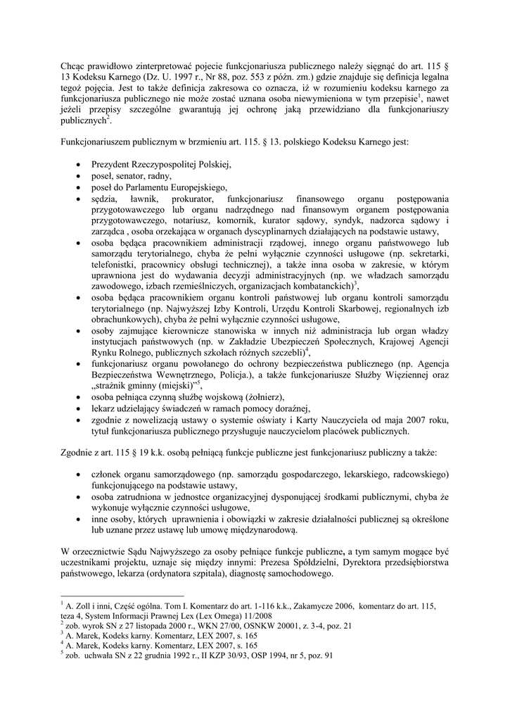 Chcąc prawidłowo zinterpretować pojecie funkcjonariusza publicznego należy sięgnąć do art. 115 § 13 Kodeksu Karnego (Dz. U. 1997 r., Nr 88, poz. 553 z późn. zm.) gdzie znajduje się definicja legalna tegoż pojęcia. Jest to także definicja zakresowa co oznacza, iż w rozumieniu kodeksu karnego za funkcjonariusza publicznego nie może zostać uznana osoba niewymieniona w tym przepisie1, nawet jeżeli przepisy szczególne gwarantują jej ochronę jaką przewidziano dla funkcjonariuszy publicznych2. Funkcjonariuszem publicznym w brzmieniu art. 115. § 13. polskiego Kodeksu Karnego jest: Prezydent Rzeczypospolitej Polskiej, poseł, senator, radny, poseł do Parlamentu Europejskiego, sędzia, ławnik, prokurator, funkcjonariusz finansowego organu postępowania przygotowawczego lub organu nadrzędnego nad finansowym organem postępowania przygotowawczego, notariusz, komornik, kurator sądowy, syndyk, nadzorca sądowy i zarządca , osoba orzekająca w organach dyscyplinarnych działających na podstawie ustawy, osoba będąca pracownikiem administracji rządowej, innego organu państwowego lub samorządu terytorialnego, chyba że pełni wyłącznie czynności usługowe (np. sekretarki, telefonistki, pracownicy obsługi technicznej), a także inna osoba w zakresie, w którym uprawniona jest do wydawania decyzji administracyjnych (np. we władzach samorządu zawodowego, izbach rzemieślniczych, organizacjach kombatanckich)3, osoba będąca pracownikiem organu kontroli państwowej lub organu kontroli samorządu terytorialnego (np. Najwyższej Izby Kontroli, Urzędu Kontroli Skarbowej, regionalnych izb obrachunkowych), chyba że pełni wyłącznie czynności usługowe, osoby zajmujące kierownicze stanowiska w innych niż administracja lub organ władzy instytucjach państwowych (np. w Zakładzie Ubezpieczeń Społecznych, Krajowej Agencji Rynku Rolnego, publicznych szkołach różnych szczebli)4, funkcjonariusz organu powołanego do ochrony bezpieczeństwa publicznego (np. Agencja Bezpieczeństwa Wewnętrznego, Policja.), a także funkcjonariusze Służby Więziennej oraz „strażnik gminny (miejski)”5, osoba pełniąca czynną służbę wojskową (żołnierz), lekarz udzielający świadczeń w ramach pomocy doraźnej, zgodnie z nowelizacją ustawy o systemie oświaty i Karty Nauczyciela od maja 2007 roku, tytuł funkcjonariusza publicznego przysługuje nauczycielom placówek publicznych. Zgodnie z art. 115 § 19 k.k. osobą pełniącą funkcje publiczne jest funkcjonariusz publiczny a także: członek organu samorządowego (np. samorządu gospodarczego, lekarskiego, radcowskiego) funkcjonującego na podstawie ustawy, osoba zatrudniona w jednostce organizacyjnej dysponującej środkami publicznymi, chyba że wykonuje wyłącznie czynności usługowe, inne osoby, których uprawnienia i obowiązki w zakresie działalności publicznej są określone lub uznane przez ustawę lub umowę międzynarodową. W orzecznictwie Sądu Najwyższego za osoby pełniące funkcje publiczne, a tym samym mogące być uczestnikami projektu, uznaje się między innymi: Prezesa Spółdzielni, Dyrektora przedsiębiorstwa państwowego, lekarza (ordynatora szpitala), diagnostę samochodowego. 1 A. Zoll i inni, Część ogólna. Tom I. Komentarz do art. 1-116 k.k., Zakamycze 2006, komentarz do art. 115, teza 4, System Informacji Prawnej Lex (Lex Omega) 11/2008 2 zob. wyrok SN z 27 listopada 2000 r., WKN 27/00, OSNKW 20001, z. 3-4, poz. 21 3 A. Marek, Kodeks karny. Komentarz, LEX 2007, s. 165 4 A. Marek, Kodeks karny. Komentarz, LEX 2007, s. 165 5 zob. uchwała SN z 22 grudnia 1992 r., II KZP 30/93, OSP 1994, nr 5, poz. 91