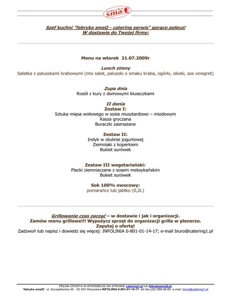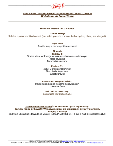 _____________________________________________________________________________________ _____________________________________________________________________________________ Szef kuchni "fabryka smaQ - catering serwis" gorąco poleca! W dostawie do Twojej firmy: Menu na wtorek 21.07.2009r Lunch zimny Sałatka z paluszkami krabowymi (mix sałat, paluszki o smaku kraba, ogórki, oliwki, sos vinegret) Zupa dnia Rosół z kury z domowymi kluseczkami II dania Zestaw I: Sztuka mięsa wołowego w sosie musztardowo – miodowym Kasza gryczana Buraczki zasmażane Zestaw II: Indyk w otulinie jogurtowej Ziemniaki z koperkiem Bukiet surówek Zestaw III wegetariański: Placki ziemniaczane z sosem meksykańskim Bukiet surówek Sok 100% owocowy: pomarańcz lub jabłko (0,2L) Grillowanie czas zacząć – w dostawie i jak i organizacji. Zamów menu grillowe!!! Wypożycz sprzęt do organizacji grilla w plenerze. Zapytaj o ofertę! Zadzwoń lub napisz i dowiedz się więcej: INFOLINIA 0-801-01-14-17; e-mail [email protected] PEŁNA OFERTA W INTERNECIE NA STRONIE catering1.pl lub fabrykasmaQ.pl “fabryka smaQ” ul. Szczęśliwicka 40 02-353 Warszawa INFOLINIA 0-801-01-14-17 tel./fax.(22) 589-36-95 e-mail: [email protected]