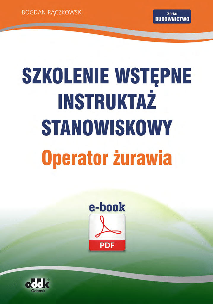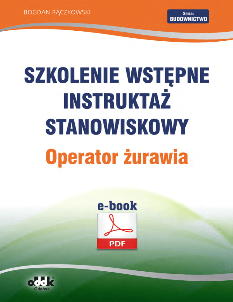 (C) ODDK. Plik jest własnością Wydawnictwa ODDK Gdańsk, sierpień 2012, ISBN 978-83-7804-417-8 Szkolenie wstępne Instruktaż stanowiskowy OPERATOR ŻURAWIA pod red. Bogdana Rączkowskiego Zgodnie z rozporządzeniem Ministra Gospodarki i Pracy z dnia 27 lipca 2004 r. w sprawie szkolenia w dziedzinie bezpieczeństwa i higieny pracy (Dz.U. Nr 180, poz. 1860 ze zm.) Ośrodek Doradztwa i Doskonalenia Kadr Sp. z o.o. Gdańsk 2012 Copyright by Ośrodek Doradztwa i Doskonalenia Kadr Sp. z o.o. (C) ODDK. Plik jest własnością Wydawnictwa ODDK Gdańsk, sierpień 2012, ISBN 978-83-7804-417-8 B. Rączkowski, Instruktaż stanowiskowy. Operator żurawia SPIS TREŚCI Wprowadzenie. . . . . . . . . . . . . . . . . . . . . . . . . . . . . . . . . . . . . . . . . . . . . . . . . . . 4 Instruktaż stanowiskowy – zasady ogólne. . . . . . . . . . . . . . . . . . . . . . . . . . . . . 5 Ramowy program instruktażu stanowiskowego . . . . . . . . . . . . . . . . . . . . . . . . 8 Szczegółowy program szkolenia . . . . . . . . . . . . . . . . . . . . . . . . . . . . . . . . . . . . 9 Szczegółowy program szkolenia na stanowisku pracy operator żurawia Wymagania ogólne dla pomieszczenia, stanowiska pracy i pracownika . . . . . . . 14 Zagrożenia na stanowisku pracy i sposoby ochrony przed zagrożeniami. Sprzęt ochrony osobistej . . . . . . . . . . . . . . . . . . . . . . . . . . . . . . . . . . . . . . . . . . . . . 18 Zasady bezpiecznej pracy na stanowisku operatora żurawia . . . . . . . . . . . . . . . . 20 Przepisy prawne . . . . . . . . . . . . . . . . . . . . . . . . . . . . . . . . . . . . . . . . . . . . . . . . 26 Polskie Normy . . . . . . . . . . . . . . . . . . . . . . . . . . . . . . . . . . . . . . . . . . . . . . . . . 27 Copyright by Ośrodek Doradztwa i Doskonalenia Kadr Sp. z o.o. 3 (C) ODDK. Plik jest własnością Wydawnictwa ODDK Gdańsk, sierpień 2012, ISBN 978-83-7804-417-8 B. Rączkowski, Instruktaż stanowiskowy. Operator żurawia WPROWADZENIE Wprowadzenie Wprowadzenie Podstawę prawną szkolenia pracowników w zakresie bezpieczeństwa i higieny pracy stanowi art. 2373 k.p. i wydane na podstawie art. 2375 k.p. rozporządzenie Ministra Gospodarki i Pracy z dnia 27 lipca 2004 r. w sprawie szkolenia w dziedzinie bezpieczeństwa i higieny pracy (Dz.U. Nr 180, poz. 1860 ze zm.). Instruktaż stanowiskowy jest częścią szkolenia wstępnego (poprzedza go instruktaż ogólny), a zatem pracownik, uczeń lub praktykant muszą go odbyć przed dopuszczeniem do pracy na danym stanowisku. Cel, zakres i ilość godzin szkolenia zostały określone w programie ramowym w rozporządzeniu. Na poszczególnych stanowiskach należy obowiązkowo opanować szczegółowe programy instruktażu. W zalecanym dla szkoleń opracowaniu przedstawiamy wzorcowy program szczegółowy dla stanowiska pracy – operator żurawia. Dokładnie omawiamy ogólne wymagania dla tego stanowiska, typowe zagrożenia i zasady bezpiecznej pracy oraz ochrony przed zagrożeniami. Copyright by Ośrodek Doradztwa i Doskonalenia Kadr Sp. z o.o. 4 (C) ODDK. Plik jest własnością Wydawnictwa ODDK Gdańsk, sierpień 2012, ISBN 978-83-7804-417-8 B. Rączkowski, Instruktaż stanowiskowy. Operator żurawia Stanowisko pracy Przez stanowisko pracy rozumie się przestrzeń pracy wraz z wyposażeniem w środki i przedmioty pracy, w której pracownik lub zespół pracowników wykonuje pracę. Racjonalna organizacja stanowiska roboczego powinna zapewnić bezpieczne i łatwe wykonywanie pracy poprzez odpowiednią ochronę przed czynnikami niebezpiecznymi (urazowymi), szkodliwymi i uciążliwymi (hałas, wibracja, zapylenie, oświetlenie, mikroklimat, duże i zbędne obciążenie pracownika). Dla operatora żurawia stanowiskiem pracy będzie kabina operatora oraz miejsce podnoszenia i przemieszczania ładunków. Żuraw jest to dźwignica, której konstrukcja nośna, tj. wysięgnik, pozwala na przemieszczanie ładunku w płaszczyźnie poziomej, pionowej lub pionowej i poziomej jednocześnie. Żurawie używane są w zakładach przemysłowych, na placach budów, w portach, stoczniach, w kolejnictwie i w innych przemysłach, gdzie prowadzone są prace przeładunkowe. Ze względu na szerokie zastosowanie żurawi wynikające z potrzeb użytkowników o często specyficznych wymaganiach istnieje duża ilość typów i rodzajów żurawi o konstrukcjach dostosowanych do tych zadań. Uproszczony podział żurawi ze względu na ich cechy konstrukcyjno-użytkowe przedstawiono poniżej: l żurawie stałe, przenośne i przewoźne: – stacjonarne (słupowe, przyścienne), – przenośne, – przewoźne; l żurawie samojezdne (stacjonarne, jazda z ciężarem): – na podwoziu samochodowym, – na podwoziu gąsienicowym; l żurawie wieżowe (dolno- lub górnoobrotowe): – stacjonarne, – szynowe; l żurawie pływające. Copyright by Ośrodek Doradztwa i Doskonalenia Kadr Sp. z o.o. 15 (C) ODDK. Plik jest własnością Wydawnictwa ODDK Gdańsk, sierpień 2012, ISBN 978-83-7804-417-8 B. Rączkowski, Instruktaż stanowiskowy. Operator żurawia Operator żurawia wykonuje prace związane z przemieszczaniem z miejsca na miejsce różnych ładunków. Podstawowe czynności operatora żurawia można podzielić na etapy: l przed rozpoczęciem pracy – operator zapoznaje się z zapisami w książce dyżurów poprzedniej zmiany, sprawdza stan techniczny żurawia i działanie mechanizmów sterowniczych, l w czasie pracy – przy przemieszczaniu ładunków zwraca uwagę na prawidłowe działanie mechanizmów sterowniczych, prawidłowe mocowanie ładunków, stosowanie przepisów bezpieczeństwa i higieny pracy, l po zakończeniu pracy – wyłącza mechanizmy sterownicze, zabezpiecza żuraw przed uruchomieniem przez osoby niepowołane, przed przewróceniem, przesunięciem itp. Przestrzeń pracy żurawia Przestrzeń, w której żuraw wykonuje ruchy robocze, powinna być wolna od obiektów i przedmiotów niezwiązanych z pracą żurawia. W strefie pracy nie powinny przeb