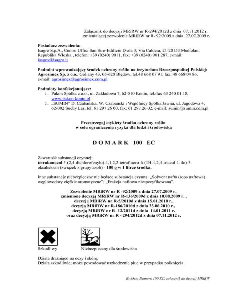 Załącznik do decyzji MRiRW nr R-294/2012d z dnia 07.11.2012 r. zmieniającej zezwolenie MRiRW nr R- 92/2009 z dnia 27.07.2009 r. Posiadacz zezwolenia: Isagro S.p.A., Centro Uffici San Siro-Edificio D-ala 3, Via Caldera, 21-20153 Mediolan, Republika Włoska , telefon: +39 (0240) 9011, fax: +39 (0240) 901 287, e-mail: [email protected] Podmiot wprowadzający środek ochrony roślin na terytorium Rzeczpospolitej Polskiej: Agrosimex Sp. z o.o., Goliany 43, 05-620 Błędów, tel.48 668 07 91, fax: 48 668 04 86, e-mail: [email protected] Podmioty konfekcjonujące: 1. Pakon Spółka z o.o., ul. Zakładowa 7, 62-510 Konin, tel./fax 63 240 01 18, www.pakon-konin.pl 2. „SUMIN” D. Czabańska, W. Czabański i Wspólnicy Spółka Jawna, ul. Jagodowa 4, 62-002 Suchy Las, tel: 61 297 26 00, fax: 61 297 26 02, e-mail: [email protected] Przestrzegaj etykiety środka ochrony roślin w celu ograniczenia ryzyka dla ludzi i środowiska D O M A R K 100 EC Zawartość substancji czynnej: tetrakonazol 5-(2,4-dichlorofenylo)-1,1,2,2-tetrafluoro-6-(1H-1,2,4-triazol-1-ilo)-3oksaheksan (związek z grupy azoli) - 100 g w 1 litrze środka. Inne substancje niebezpieczne nie będące substancją czynną: „Solwent nafta (ropa naftowa) węglowodory ciężkie aromatyczne”; „Frakcja naftowa niespecyfikowana”. Zezwolenie MRiRW nr R -92/2009 z dnia 27.07.2009 r., zmienione decyzją MRiRW nr R-136/2009d z dnia 10.08.2009 r. , decyzją MRiRW nr R-5/2010d z dnia 15.01.2010 r., decyzją MRiRW nr R-186/2010d z dnia 23.06.2010 r., decyzją MRiRW nr R- 12/2011d z dnia 14.01.2011 r. oraz decyzją MRiRW nr R - 294/2012d z dnia 07.11.2012 r. Szkodliwy Niebezpieczny dla środowiska Działa drażniąco na oczy i skórę. Działa szkodliwie; może powodować uszkodzenie płuc w przypadku połknięcia. Etykieta Domark 100 EC, załącznik do decyzji MRiRW 2 Pary mogą wywoływać uczucie senności i zawroty głowy. Działa toksycznie na organizmy wodne może powodować długo utrzymujące się niekorzystne zmiany w środowisku wodnym. Uwaga! 1. Zabrania się stosowania środka w strefach bezpośredniej ochrony ujęć wody oraz na terenie uzdrowisk, otulin parków narodowych i rezerwatów. 2. Nie zanieczyszczać wód środkiem lub jego opakowaniem. I OPIS DZIAŁANIA Środek grzybobójczy w formie koncentratu do sporządzania emulsji wodnej o działaniu systemicznym do stosowania zapobiegawczego, interwencyjnego i wyniszczającego w ochronie roślin sadowniczych, roślin ozdobnych przed chorobami oraz ogórków (pod osłonami) przed mączniakiem prawdziwym. II ZAKRES STOSOWANIA, TERMINY I DAWKI Środek stosować zapobiegawczo lub z chwilą wystąpienia pierwszych objawów chorób. 1. ROŚLINY SADOWNICZE A) JABŁOŃ parch jabłoni Zalecana dawka: 0,4 l/ha. Zalecana ilość wody: 500-750 l/ha. Ilość wody dostosować do wielkości koron drzew. Środek stosować od końca fazy kwitnienia do fazy początku czerwcowego opadania owoców, nie częściej niż 2-3 razy w sezonie. mączniak prawdziwy Zalecana dawka: 0,4 l/ha. Zalecana ilość wody: 500-750 l/ha. Ilość wody dostosować do wielkości koron drzew. Środek stosować od początku fazy kwitnienia do fazy początku czerwcowego opadania owoców, nie częściej niż 2-3 razy w sezonie. Etykieta Domark 100 EC, załącznik do zezwolenia MRiRW 3 B) TRUSKAWKA (PLANTACJE MATECZNE I PLANTACJE OWOCUJĄCE) PLANTACJE MATECZNE biała plamistość liści Zalecana dawka: 0,6 l/ha. Zalecana ilość wody: 1000 l/ha. Środek na plantacjach matecznych stosować w fazie rozwoju pędów rozłogowych i młodych roślin, nie częściej niż 2-3 razy w sezonie. • PLANTACJE OWOCUJĄCE biała plamistość liści, mączniak prawdziwy Zalecana dawka: 0,6 l/ha. Zalecana ilość wody: 600 l/ha. Środek na plantacjach owocujących stosować w fazie kwitnienia, nie częściej niż 2-3 razy w sezonie. 2. ROŚLINY WARZYWNE. A) OGÓREK (POD OSŁONAMI) mączniak prawdziwy Zalecane stężenie: 0,04% (40 ml środka w 100 litrach wody). Zalecana ilość cieczy użytkowej: 100-120 l/1000 m2. Wyższą ilość cieczy użytkowej stosować do opryskiwania roślin silnie wyrośniętych. Środek stosować profilaktycznie lub interwencyjnie po stwierdzeniu pierwszych objawów choroby, 2-3 razy co 7-10 dni. 3. ROŚLINY OZDOBNE. A) RÓŻE (W GRUNCIE) mączniak prawdziwy B) RÓŻE ( POD OSŁONAMI) czarna plamistość róż Zalecane stężenie: 0,05%. (50 ml środka w 100 litrach wody). Zalecana ilość cieczy użytkowej: • pod osłonami: 1 l/10 m2. • w gruncie: 1000 l/ha. Etykieta Domark 100 EC, załącznik do zezwolenia MRiRW 4 Środek stosować profilaktycznie lub interwencyjnie po stwierdzeniu pierwszych objawów chorób 2-3 razy co 7-14 dni. C) CHRYZANTEMA (POD OSŁONAMI) plamistość pierścieniowa Zalecane stężenie: 0,05%. (50 ml środka w 100 litrach wody). Zalecana ilość cieczy użytkowej: 1 l/10 m2. Środek stosować profilaktycznie lub interwencyjnie po stwierdzeniu pierwszych objawów choroby. UWAGI: 1. Środek stosować w temperaturze powietrza powyżej 12o C. 2. Środek stosować przemiennie z fungicydami należącymi do innych grup chemicznych. 3. Przed zastosowaniem środka na rośliny ozdobne wykonać na każdej uprawianej odmianie próbny zabieg w celu sprawdzenia, czy w ciągu 7 dni nie wystąpiły objawy uszkodzenia roślin. III OKRES KARENCJI okres od dnia ostatniego zabiegu do dnia zbioru roślin przeznaczonych do konsumpcji JABŁKA – 14 DNI, TRUSKAWKI – 7 DNI, OGÓREK (POD OSŁONAMI) – 5 DNI, RÓŻA – NIE DOTYCZY, CHRYZANTEMA – NIE DOTYCZY. IV OKRES PREWENCJI DLA PSZCZÓŁ, LUDZI I ZWIERZĄT okres zapobiegający zatruciu NIE DOTYCZY V SPORZĄDZANIE CIECZY UŻYTKOWEJ Przed przystąpieniem do sporządzania cieczy użytkowej dokładnie ustalić potrzebną jej ilość. Przed użyciem środka silnie wstrząsnąć zawartością opakowania. Odmierzoną ilość środka wlać do zbiornika opryskiwacza napełnionego częściowo wodą (z włączonym mieszadłem) i uzupełnić wodą do potrzeb