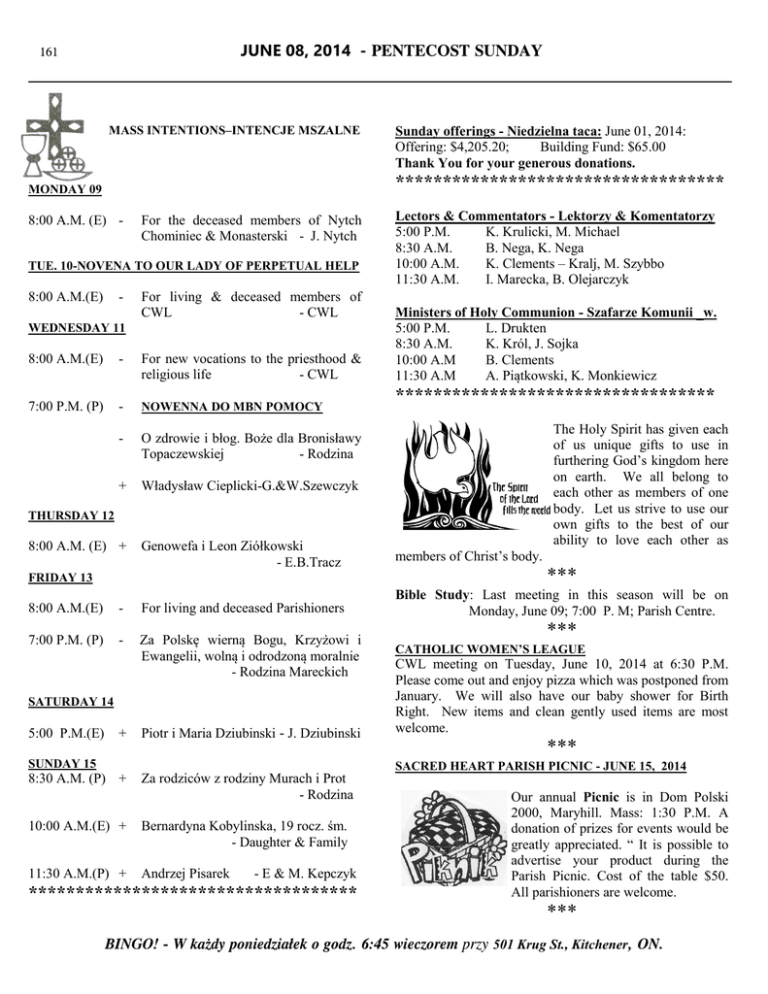 JUNE 08, 2014 - PENTECOST SUNDAY 161 MASS INTENTIONS–INTENCJE MSZALNE Sunday offerings - Niedzielna taca: June 01, 2014: Offering: $4,205.20; Building Fund: $65.00 Thank You for your generous donations. *********************************** MONDAY 09 8:00 A.M. (E) - For the deceased members of Nytch Chominiec & Monasterski - J. Nytch TUE. 10-NOVENA TO OUR LADY OF PERPETUAL HELP 8:00 A.M.(E) - For living & deceased members of CWL - CWL WEDNESDAY 11 8:00 A.M.(E) - For new vocations to the priesthood & religious life - CWL 7:00 P.M. (P) - NOWENNA DO MBN POMOCY - O zdrowie i błog. Boże dla Bronisławy Topaczewskiej - Rodzina + Władysław Cieplicki-G.&W.Szewczyk Lectors & Commentators - Lektorzy & Komentatorzy 5:00 P.M. K. Krulicki, M. Michael 8:30 A.M. B. Nega, K. Nega 10:00 A.M. K. Clements – Kralj, M. Szybbo 11:30 A.M. I. Marecka, B. Olejarczyk Ministers of Holy Communion - Szafarze Komunii w. 5:00 P.M. L. Drukten 8:30 A.M. K. Król, J. Sojka 10:00 A.M B. Clements 11:30 A.M A. Piątkowski, K. Monkiewicz ********************************** The Holy Spirit has given each of us unique gifts to use in furthering God’s kingdom here on earth. We all belong to each other as members of one body. Let us strive to use our own gifts to the best of our ability to love each other as THURSDAY 12 8:00 A.M. (E) + Genowefa i Leon Ziółkowski - E.B.Tracz members of Christ’s body. Bible Study: Last meeting in this season will be on Monday, June 09; 7:00 P. M; Parish Centre. FRIDAY 13 8:00 A.M.(E) - For living and deceased Parishioners 7:00 P.M. (P) - Za Polskę wierną Bogu, Krzyżowi i Ewangelii, wolną i odrodzoną moralnie - Rodzina Mareckich SATURDAY 14 5:00 P.M.(E) + Piotr i Maria Dziubinski - J. Dziubinski SUNDAY 15 *** *** CATHOLIC WOMEN’S LEAGUE CWL meeting on Tuesday, June 10, 2014 at 6:30 P.M. Please come out and enjoy pizza which was postponed from January. We will also have our baby shower for Birth Right. New items and clean gently used items are most welcome. *** SACRED HEART PARISH PICNIC - JUNE 15, 2014 8:30 A.M. (P) + Za rodziców z rodziny Murach i Prot - Rodzina 10:00 A.M.(E) + Bernardyna Kobylinska, 19 rocz. śm. - Daughter & Family 11:30 A.M.(P) + Andrzej Pisarek - E & M. Kepczyk *********************************** Our annual Picnic is in Dom Polski 2000, Maryhill. Mass: 1:30 P.M. A donation of prizes for events would be greatly appreciated. “ It is possible to advertise your product during the Parish Picnic. Cost of the table $50. All parishioners are welcome. *** BINGO! - W każdy poniedziałek o godz. 6:45 wieczorem przy 501 Krug St., Kitchener, ON. CZERWIEC 08, 2014 - UROCZYSTOŚĆ ZESŁANIA DUCHA ŚWIĘTEGO BABY BOTTLE CAMPAIGN FOR MARILLAC PLACE OFIARY DLA “MARILLAC PLACE” Please remember to return your bottles, full or empty, to the parish on the weekend of Father’s Day - June 15th . We will have containers at the back of the Church for you to deposit Them. Again thank you for your contribution. Na Dzień Matki Panie z Katolickiej Ligi Kobiet rozprowadzały buteleczki dziecięce. Prosimy zapełnić je swoją ofiarą i zwrócić pełne lub puste na Dzień Ojca, 15 Czerwca, 2014. Ofiary przeznaczone są dla dzieci samotnych matek. *** *** FRIDAY, JUNE 27 - Solemnity of the Sacred Heart of Jesus. This is our Parish Feast Day. *********************************** Dzisiaj czcimy Zesłanie Ducha Świętego na młody Kościół, na Kościół czasów apostolskich. Od tamtego dnia apostołowie zaczęli w rozmaitych językach głosić wielkie dzieła Boże. Duch Święty sprawił, że idąc na cały świat głosili jednego Chrystusa, udzielali jednego chrztu, w Imię jednego Chrystusa odpuszczali grzechy. To dzieło trwa w Kościele Chrystusowym aż do dnia dzisiejszego. “Wszyscy zostaliśmy napojeni jednym Duchem.” *** Ostatnie w tym sezonie spotkanie Grupy Biblijnej w poniedziałek, 09 czerwca o godz. 7:00 wieczorem w Centrum Parafialnym. *** Spotkanie Tow. Św. Józefa i Św. Jana Kantego oraz zbierających tacę (ushers) we wtorek, 10 czerwca o godz. 7:00 wieczorem w Centrum Parafialnym. *** NOWENNA DO MBN POMOCY połączona z Mszą św. w ŚRODĘ o godz. 7:00 wieczorem. W czasie Nowenny poświęcenie dewocjonalii. Spowiedź św. 6:30. *** Serdeczne podziękowanie składamy Zespołowi “Arka” za ich zaangażowanie i upiększanie Liturgii niedzielnej swoim śpiewem i muzyką. Na wakacje życzymy całemu Zespołowi wiele słonecznych dni, zasłużonego odpoczynku oraz nabrania nowych sił fizycznych jak i duchowych, aby z nowym zapałem mogli powrócić po wakacjach. Serdeczne Bóg zapłać wszystkim członkom Zespołu. *** UROCZYSTOŚĆNAJŚWIĘTSZEGO CIAŁA, PANA JEZUSA - CZERWIEC 26, 2011 - 6:00 wieczorem - 6:00 wieczorem - 6:30 wieczorem - 7:00 wieczorem. *** Doroczny PIKNIK PARAFIALNY odbędzie się w niedzielę 15-go czerwca w Domu Polskim. Msza św. będzie celebrowana o godz. 1:30 po południu. Zwracamy się z prośbą o donacje i fanty, które będą losowane na pikniku. Jak co roku będzie możliwość zareklamowania swoich wyrobów na pikniku (oprócz wyrobów spożywczych). Koszt stołu $50.00. Bardzo zachęcamy do kupna *** KRWI Bezpośrednio po Mszy św. o godz. 11:30 wyruszy procesja do 4-ch ołtarzy przygotowanych przez: 1szy - Arcyb. Matek Chrześcijańskich i Korpus Pomocniczy Pań 2-gi - Róże Żywego Różańca 3-ci - Kościół Domowy i Młodzież 4-ty - Tow. św. Józefa i św. Jana Kantego, Szkoła Polska i Harcerze. *** Do procesji zapraszamy wszystkich członków naszej wspólnoty, łącznie z organizacjami parafialnymi i polonijnymi. W tej publicznej manifestacji naszej wiary przed Chrystusem Eucharystycznym podążą dzieci I komunijne. Dziewczynki zapraszamy do sypania kwiatków a chłopców do niesienia lilijek. *** PIĄTEK- 13 CZERWIEC 2014 Różaniec w int. o powołania Adoracja Najśw. Sakramentu Spowiedź św. o godz. Msza św. I PIĄTEK, 27 – Uroczystość Najświętszego Serca Pana Jesusa - patronalne święto naszej parafii.