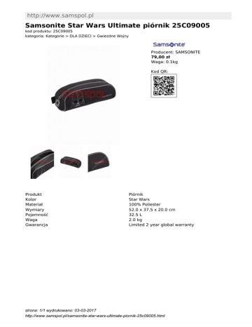 http://www.samspol.pl Samsonite Star Wars Ultimate piórnik 25C09005 kod produktu: 25C09005 kategoria: Kategorie > DLA DZIECI > Gwiezdne Wojny Producent: SAMSONITE 79,00 zł Waga: 0.1kg Kod QR: Produkt Kolor Materiał Wymiary Pojemność Waga Gwarancja Piórnik Star Wars 100% Poliester 52.0 x 37.5 x 20.0 cm 32.5 L 2.0 kg Limited 2 year global warranty strona: 1/1 wydrukowano: 03-03-2017 http://www.samspol.pl/samsonite-star-wars-ultimate-piornik-25c09005.html