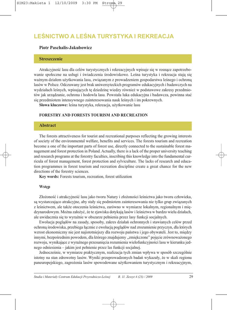 SIM23:Makieta 1 12/10/2009 3:30 PM Strona 29 LEŚNICTWO A LEŚNA TURYSTYKA I REKREACJA Piotr Paschalis-Jakubowicz Streszczenie Atrakcyjność lasu dla celów turystycznych i rekreacyjnych wpisuje się w rosnące zapotrzebowanie społeczne na usługi i świadczenia środowiskowe. Leśna turystyka i rekreacja stają się ważnym działem użytkowania lasu, związanym z prowadzeniem gospodarstwa leśnego i ochroną lasów w Polsce. Odczuwany jest brak uniwersyteckich programów edukacyjnych i badawczych na wydziałach leśnych, wpisujących tę dziedzinę wiedzy również w podstawowe zakresy przedmiotów jak urządzanie, ochrona i hodowla lasu. Powstała luka edukacyjna i badawcza, powinna stać się przedmiotem intensywnego zainteresowania nauk leśnych i im pokrewnych. Słowa kluczowe: leśna turystyka, rekreacja, użytkowanie lasu FORESTRY AND FORESTS TOURISM AND RECREATION Abstract The forests attractiveness for tourist and recreational purposes reflecting the growing interests of society of the environmental welfare, benefits and services. The forests tourism and recreation become a one of the important parts of forest use, directly connected to the sustainable forest management and forest protection in Poland. Actually, there is a lack of the proper university teaching and research programs at the forestry faculties, inscribing this knowledge into the fundamental curricula of forest management, forest protection and sylviculture. The lacks of research and education programmes in forest tourism and recreation discipline create a great chance for the new directions of the forestry sciences. Key words: Forests tourism, recreation, forest utilization Wstęp Złożoność i atrakcyjność lasu jako tworu Natury i złożoności leśnictwa jako tworu człowieka, są wystarczająco atrakcyjne, aby stały się podmiotem zainteresowania nie tylko grup związanych z leśnictwem, ale także otoczenia leśnictwa, zarówno w wymiarze lokalnym, regionalnym i międzynarodowym. Można założyć, że te zjawiska dotykają lasów i leśnictwa w bardzo wielu działach, ale uwidacznia się to wyraźnie w obszarze pełnienia przez lasy funkcji socjalnych. Ewolucja poglądów na zasady, sposoby, zakres działań ochronnych i stawianych celów przed ochroną środowiska, przebiega łącznie z ewolucją poglądów nad zrozumienie przyczyn, dla których wzrost ekonomiczny nie jest najistotniejszy dla rozwoju państwa i jego obywateli. Jest to, między innymi, bezpośrednim powodem, dla którego znajdujemy „zmiękczone” pojęcie zrównoważonego rozwoju, wynikające z wyraźnego przesunięcia rozumienia wielofunkcyjności lasu w kierunku jednego odniesienia – jakim jest pełnienie przez las funkcji socjalnej. Jednocześnie, w wymiarze praktycznym, realizacja tych zmian wpływa w sposób szczególnie istotny na stan zdrowotny lasów. Wyniki przeprowadzonych badań wykazały, że w skali regionu paneuropejskiego, zagrożenia lasów spowodowane użytkowaniem turystycznym i rekreacyjnym, Studia i Materiały Centrum Edukacji Przyrodniczo-Leśnej R. 11. Zeszyt 4 (23) / 2009 29 SIM23:Makieta 1 12/10/2009 3:30 PM Strona 30 są po chorobach powodujących zamieranie lasów, gradacjach owadów i masowego występowania grzybów chorobotwórczych – trzecim, najpoważniejszym zagrożeniem (dane z MCPFE Report 2007). Zagrożenia te łączone są z eksploatacją zasobów runa leśnego, wzniecaniem pożarów leśnych oraz nadmiernego zagęszczenia ruchu turystycznego. Wyraźny wzrost presji turystyki i rekreacji na terenach leśnych notowany jest od dawna na wielu kontynentach, przede wszystkim Afryki, Azji Południowo- Wschodniej i Ameryki Południowej, a od kilkunastu lat – w Europie. Udział lasów w skali globalnej pełniących różne funkcje zmienia się dynamicznie i obecnie przyjmuje się, że blisko 4% ogólnej powierzchni lasów świata pełni wyłącznie funkcje socjalne – głównie dla spełnienia potrzeb rekreacyjnych i turystycznych oraz również funkcja ta jest pełniona razem z pozostałymi funkcjami (ryc. 1). Oznacza to, że leśna turystyka i rekreacja powinny być traktowane jako ważna składowa w prowadzeniu gospodarstwa leśnego i stać się jednym z działów nauki i praktyki leśnej. Ryc. 1. Funkcje lasów świata (ARC 2006, FAO 2008, Paschalis-Jakiubowicz 2009) Fig. 1. Fuctions of the world forests (ARC 2006, FAO 2008, Paschalis-Jakiubowicz 2009) Istotność leśnej turystyki i rekreacji w odniesieniu do leśnictwa Przeprowadzona analiza czynników, które mają swoje odniesienia w globalnym oddziaływaniu na lasy i leśnictwo pozwoliła na identyfikację czynników, które mają i będą miały decydujący wpływ na leśnictwo, co najmniej do końca XXI wieku. W grupie tej znajdują się zarówno czynniki o zasięgu globalnym, jak i regionalnym (Paschalis 2009): 30 Piotr Paschalis-Jakubowicz LEŚNICTWO A LEŚNA TURYSTYKA I REKREACJA. SIM23:Makieta 1 12/10/2009 3:30 PM Strona 31 ■ rozwój infrastrukturalny, ■ zmiany klimatyczne, ■ turystyka, ■ migracje, ■ decentralizacja, ■ produkcyjny kompleks rolny, ■ demokratyzacja, ■ korupcja, ■ dostępność do wody, ■ HIV-AIDS, ■ wojny i konflikty, ■ modyfikacje genetyczne, ■ choroby. Ryc. 2. Symulowane warunki do uprawiania letniej turystyki w Europie w latach 1961-1990 (po lewej stronie mapy) oraz 2071-2100 (po prawej), według scenariusza wysokiego poziomu emisji (IPCC SRES A2) (EEA 2007) Fig. 2. Simulated conditions for sumer forest tourism in Europe in 1961-1990 (lef side of the map) and in 2071-2100 (right side), according to the scenario of high emission level (IPCC SRES A2) (EEA 2007) Zauważyć należy, że część z powyżej wymienionych czynników charakteryzuje się synergicznymi powiązaniami z wieloma innymi czynnikami, a turystyka, do tej grupy należy. Wzmocnienie Studia i Materiały Centrum Edukacji Przyrodniczo-Leśnej R. 11. Zeszyt 4 (23) / 2009 31 SIM23:Makieta 1 12/10/2009 3:30 PM Strona 32 oddziaływa