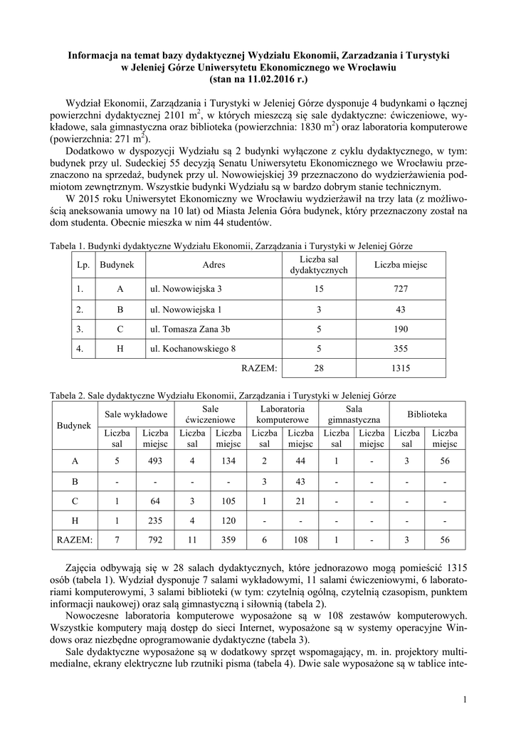 Informacja na temat bazy dydaktycznej Wydziału Ekonomii, Zarzadzania i Turystyki w Jeleniej Górze Uniwersytetu Ekonomicznego we Wrocławiu (stan na 11.02.2016 r.) Wydział Ekonomii, Zarządzania i Turystyki w Jeleniej Górze dysponuje 4 budynkami o łącznej powierzchni dydaktycznej 2101 m2, w których mieszczą się sale dydaktyczne: ćwiczeniowe, wykładowe, sala gimnastyczna oraz biblioteka (powierzchnia: 1830 m2) oraz laboratoria komputerowe (powierzchnia: 271 m2). Dodatkowo w dyspozycji Wydziału są 2 budynki wyłączone z cyklu dydaktycznego, w tym: budynek przy ul. Sudeckiej 55 decyzją Senatu Uniwersytetu Ekonomicznego we Wrocławiu przeznaczono na sprzedaż, budynek przy ul. Nowowiejskiej 39 przeznaczono do wydzierżawienia podmiotom zewnętrznym. Wszystkie budynki Wydziału są w bardzo dobrym stanie technicznym. W 2015 roku Uniwersytet Ekonomiczny we Wrocławiu wydzierżawił na trzy lata (z możliwością aneksowania umowy na 10 lat) od Miasta Jelenia Góra budynek, który przeznaczony został na dom studenta. Obecnie mieszka w nim 44 studentów. Tabela 1. Budynki dydaktyczne Wydziału Ekonomii, Zarządzania i Turystyki w Jeleniej Górze Liczba sal Lp. Budynek Adres Liczba miejsc dydaktycznych 1. A ul. Nowowiejska 3 15 727 2. B ul. Nowowiejska 1 3 43 3. C ul. Tomasza Zana 3b 5 190 4. H ul. Kochanowskiego 8 5 355 28 1315 RAZEM: Tabela 2. Sale dydaktyczne Wydziału Ekonomii, Zarządzania i Turystyki w Jeleniej Górze Sale Laboratoria Sala Sale wykładowe Biblioteka ćwiczeniowe komputerowe gimnastyczna Budynek Liczba Liczba Liczba Liczba Liczba Liczba Liczba Liczba Liczba Liczba sal miejsc sal miejsc sal miejsc sal miejsc sal miejsc A 5 493 4 134 2 44 1 - 3 56 B - - - - 3 43 - - - - C 1 64 3 105 1 21 - - - - H 1 235 4 120 - - - - - - RAZEM: 7 792 11 359 6 108 1 - 3 56 Zajęcia odbywają się w 28 salach dydaktycznych, które jednorazowo mogą pomieścić 1315 osób (tabela 1). Wydział dysponuje 7 salami wykładowymi, 11 salami ćwiczeniowymi, 6 laboratoriami komputerowymi, 3 salami biblioteki (w tym: czytelnią ogólną, czytelnią czasopism, punktem informacji naukowej) oraz salą gimnastyczną i siłownią (tabela 2). Nowoczesne laboratoria komputerowe wyposażone są w 108 zestawów komputerowych. Wszystkie komputery mają dostęp do sieci Internet, wyposażone są w systemy operacyjne Windows oraz niezbędne oprogramowanie dydaktyczne (tabela 3). Sale dydaktyczne wyposażone są w dodatkowy sprzęt wspomagający, m. in. projektory multimedialne, ekrany elektryczne lub rzutniki pisma (tabela 4). Dwie sale wyposażone są w tablice inte1 raktywne SmartBoard. Największe sale wykładowe (aula w budynku A może pomieścić 240 osób, aula w budynku H - 235 osób) wyposażone są w nowoczesny elektroniczny system prezentacji obrazu i dźwięku. Studenci Wydziału mają zapewniony swobodny dostęp do komputerów i sieci Internet. Na holu w budynku A i H przygotowanych jest 8 ogólnodostępnych zestawów komputerowych. Dodatkowo wszystkie budynki wyposażone są w sieć WiFi (system UniFi) dostępną dla pracowników i studentów Wydziału. Tabela 3. Laboratoria komputerowe i ich wyposażenie Sala Powierzchnia (m2) Liczba stanowisk komputerowych Oprogramowanie systemowe 1A 55,80 23 Windows 7 Prof. 64 bit 34A 58,00 21 Windows 7 Prof. 64 bit 10 Windows Vista Business 32 bit – 5 sztuk Windows XP Home – 5 sztuk 5B 24,57 7B 44,75 17 Windows 7 Prof 64 bit – 1 sztuka Windows Vista Business 32 bit – 16 sztuk 12B 35,55 16 Windows Vista Business 32 bit 21 Windows 7 Prof 64 bit – 6 sztuk Windows Vista Home Basic 64 bit – 15 sztuk 114C 52,00 Oprogramowanie dydaktyczne Badania operacyjne R ver. 3.2.2 Prognozy ver. 1.01 Microsoft Office 2013 Std Microsoft Business Solutions-Navision demo Insert ver. 1.28 SP2 HF1 demo Symfonia ver.2013.1d demo El-dok + konto pocztowe Gretl SAP ver. 7.1 Badania operacyjne R ver. 3.2.2 Prognozy ver. 1.01 Microsoft Office 2013 Std Microsoft Office 2000 Prof – tylko Access Microsoft Business Solutions-Navision demo Insert ver. 1.28 SP2 HF1 demo El-dok + konto pocztowe Badania operacyjne R ver. 3.2.2 Prognozy ver. 1.01 Microsoft Office 2000 Prof Microsoft Business Solutions-Navision demo Badania operacyjne R ver. 3.2.2 Prognozy ver. 1.01 Microsoft Office 2010 Std Microsoft Office 2000 Prof – tylko Access Microsoft Business Solutions-Navision demo Insert ver. 1.28 SP2 HF1 demo Statistica ver. 12.5 Badania operacyjne R ver. 3.2.2 Prognozy ver. 1.01 Microsoft Office 2010 Std Microsoft Office 2000 Prof – tylko Access Microsoft Business Solutions-Navision demo Insert ver. 1.28 SP2 HF1 demo El-dok LiveViewer – obsługa projektora Badania operacyjne R ver. 3.2.2 Prognozy ver. 1.01 Microsoft Office 2000 Prof Microsoft Business Solutions-Navision demo Insert ver. 1.28 SP2 HF1 demo El-dok 2 Tabela 4. Dodatkowe wyposażenie sal dydaktycznych Tablica biała 11 Tablica zielona 22 Ekran elektryczny 21 Rzutnik pisma 12 Projektor multimedialny 21 Tablica interaktywna SmartBoard 2 System elektronicznej obsługi ob2 razu i dźwięku Rolety materiałowe 8 Żaluzje pionowe 13 3