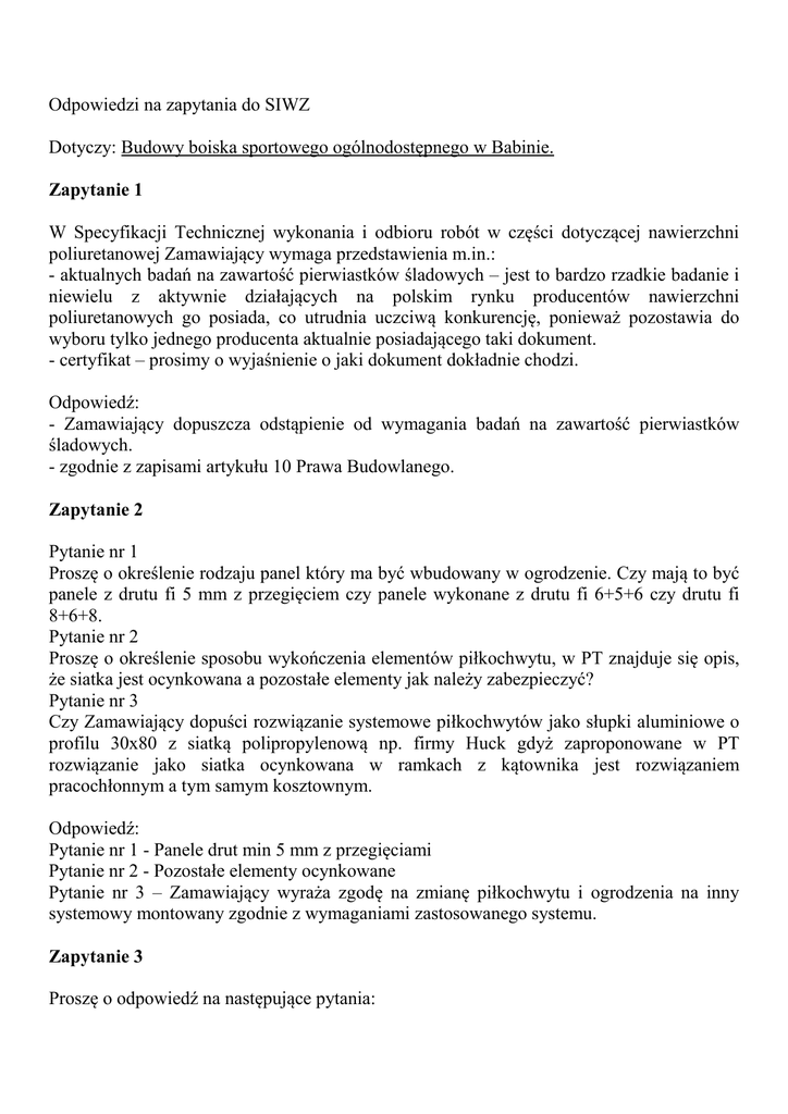 Odpowiedzi na zapytania do SIWZ Dotyczy: Budowy boiska sportowego ogólnodostępnego w Babinie. Zapytanie 1 W Specyfikacji Technicznej wykonania i odbioru robót w części dotyczącej nawierzchni poliuretanowej Zamawiający wymaga przedstawienia m.in.: - aktualnych badań na zawartość pierwiastków śladowych – jest to bardzo rzadkie badanie i niewielu z aktywnie działających na polskim rynku producentów nawierzchni poliuretanowych go posiada, co utrudnia uczciwą konkurencję, ponieważ pozostawia do wyboru tylko jednego producenta aktualnie posiadającego taki dokument. - certyfikat – prosimy o wyjaśnienie o jaki dokument dokładnie chodzi. Odpowiedź: - Zamawiający dopuszcza odstąpienie od wymagania badań na zawartość pierwiastków śladowych. - zgodnie z zapisami artykułu 10 Prawa Budowlanego. Zapytanie 2 Pytanie nr 1 Proszę o określenie rodzaju panel który ma być wbudowany w ogrodzenie. Czy mają to być panele z drutu fi 5 mm z przegięciem czy panele wykonane z drutu fi 6+5+6 czy drutu fi 8+6+8. Pytanie nr 2 Proszę o określenie sposobu wykończenia elementów piłkochwytu, w PT znajduje się opis, że siatka jest ocynkowana a pozostałe elementy jak należy zabezpieczyć? Pytanie nr 3 Czy Zamawiający dopuści rozwiązanie systemowe piłkochwytów jako słupki aluminiowe o profilu 30x80 z siatką polipropylenową np. firmy Huck gdyż zaproponowane w PT rozwiązanie jako siatka ocynkowana w ramkach z kątownika jest rozwiązaniem pracochłonnym a tym samym kosztownym. Odpowiedź: Pytanie nr 1 - Panele drut min 5 mm z przegięciami Pytanie nr 2 - Pozostałe elementy ocynkowane Pytanie nr 3 – Zamawiający wyraża zgodę na zmianę piłkochwytu i ogrodzenia na inny systemowy montowany zgodnie z wymaganiami zastosowanego systemu. Zapytanie 3 Proszę o odpowiedź na następujące pytania: 1. W dokumentacji są rozbieżności odnośnie parametrów ogrodzenia i piłkochwytów. Proszę o jednoznaczne wskazanie obowiązujących parametrów ogrodzenia i piłkochwytu tj. profile słupków ogrodzenia i piłkochwytów, grubość ścianek słupków ogrodzenia i piłkochwytów. 2. Czy Zamawiający dopuszcza możliwość zamiany projektowanego ogrodzenia i piłkochwytu na systemowe rozwiązania realizowane na obiektach sportowych np. Piłkochwyt: - osobna konstrukcja, 5m wysokości, słupy aluminiowe lub stalowe, o profilu 80x80 mm, grubość ścianki 3 mm, ocynkowane, lub ocynkowane i malowane proszkowo, słupy mocowane w tulei, fundament zgodnie ze sztuką budowlaną, skrajne słupy wzmocnione stężeniami o profilu50*30mm, wypełnienie piłkochwytu siatką polipropylenową o oczku 100x100 mm, grubość splotu 4 mm, w kolorze zielonym lub czarnym z okuciami mocującymi siatkę, rozstaw słupów dowolny Ogrodzenie: - wysokość ogrodzenia: 2,03 m; - słupki stalowe o profilu zamkniętym 60x40x2 mm, wys 2,6 m cynkowane ogniowo, lub ocynkowane ogniowo i malowane proszkowo na kolor zielony RAL 6005, montowane w rozstawieco 2,52 m; - wypełnienie z paneli kratowych o wym. 2500x2030 mm wykonanych ze spawanych punktowo stalowych prętów pionowych o śr. 5 mm oraz dwóch poziomych o śr. 6mm cynkowanych ogniowo, lub cynkowanych ogniowo i malowanych proszkowo na kolor zielony RAL 6005; - rozstaw prętów paneli 50x 200 mm; - mocowanie paneli obejmami wkręcanymi do słupów w ilości 6 szt. na słupek, - obejmy wyposażone w system amortyzujący - montaż słupków w fundamencie betonowym o wym. 0,4x0,4x0,6 m. - furtki i bramy wypełnione panelem, wyposażone w zawiasy i zamek. Odpowiedź: Pytanie nr 1 – Parametry piłkochwytu i ogrodzenia określone są w SIWZ w rozdz.III Opis przedmiotu zamówienia. Pytanie nr 2 – Zamawiający wyraża zgodę na zmianę piłkochwytu i ogrodzenia na inny systemowy montowany zgodnie z wymaganiami zastosowanego systemu. Zapytanie 4 Pyt.1: Czy inwestor jest w posiadaniu badań geologicznych ( zawierających przekroje gruntu)? Jeśli tak prosimy o ich udostępnienie. Pyt.2: Czy w przypadku braku dokumentacji geologicznej i wystąpieniu gruntów niebudowlanych oraz konieczności jego wzmocnienia, Inwestor przewiduje zwiększenie kwoty przeznaczonej na inwestycję? Pyt.3: Czy Zamawiający przewiduje roboty dodatkowe, w przypadku nieosiągnięcia ( po usunięciu gruntu zgodnie projektem) warunków gruntowych umożliwiających ułożenie nawierzchni sportowych? Pyt.4: Zamawiający żąda dołączenia do oferty kosztorysu sporządzonego na podstawie przedmiarów robót, jednocześnie ustalając wynagrodzenie jako ryczałtowe. Prosimy o informację czy dla Wykonawcy, przy wycenie w/w inwestycji, wiążący będzie przedmiar czy projekt wykonawczy/opis do projektu? Pyt.5: Prosimy o potwierdzenie czy ilości składowe w załączonym przedmiarze są zgodne ze stanem faktycznym prac przewidzianych przy wykonaniu w/w inwestycji? Pyt.6: Przedmiar oraz opis projektu nie uwzględnia odwodnienia boiska, prosimy o korektę lub potwierdzenie, że Zamawiający nie przewiduje odwodnienia boiska oraz bieżni. Pyt.7: Czy Zamawiający zgodzi się na zamianę rodzaju piłkochwytu na system lepszy i powszechnie stosowany z siatki polipropylenowej wys. 4 m? Odpowiedź: Pytanie 1. – Na etapie projektu informacje geotechniczne zebrano na podstawie odkrywek. Nie były one zebrane w dokument. Pytanie 2. – Nie przewiduje się zwiększenia kwoty na inwestycję. Pytanie 3. - Nie przewiduje się robót dodatkowych. Pytanie 4. – Odpowiedź zawarta jest w SIWZ na stronie 4 po danych dotyczących ogrodzenia i stronie 8 rozdział X punkt 9. Cena powinna obejmować wszystkie roboty niezbędne do wykonania zadania. Pytanie 5. - Odpowiedź zawarta jest w SIWZ na stronie 4 po danych dotyczących ogrodzenia i stronie 8 rozdział X punkt 9. Cena powinna obejmować wszystkie roboty niezbędne do wykonania zadania. Pytanie 6. – Odwodnienie powierzchniowe na teren przyległy. Nie przewiduje się odwodnienia drenażem. Informacja o odwodnieniu zawarta jest w projekcie budowlanym pkt.