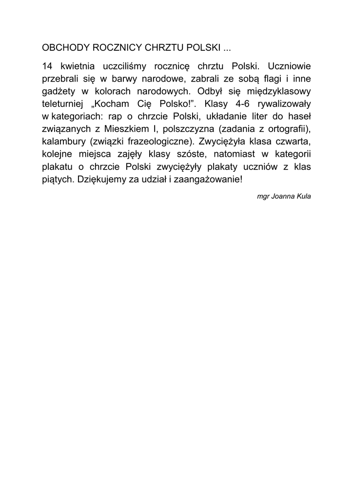 OBCHODY ROCZNICY CHRZTU POLSKI ... 14 kwietnia uczciliśmy rocznicę chrztu Polski. Uczniowie przebrali się w barwy narodowe, zabrali ze sobą flagi i inne gadżety w kolorach narodowych. Odbył się międzyklasowy teleturniej „Kocham Cię Polsko!”. Klasy 4-6 rywalizowały w kategoriach: rap o chrzcie Polski, układanie liter do haseł związanych z Mieszkiem I, polszczyzna (zadania z ortografii), kalambury (związki frazeologiczne). Zwyciężyła klasa czwarta, kolejne miejsca zajęły klasy szóste, natomiast w kategorii plakatu o chrzcie Polski zwyciężyły plakaty uczniów z klas piątych. Dziękujemy za udział i zaangażowanie! mgr Joanna Kula