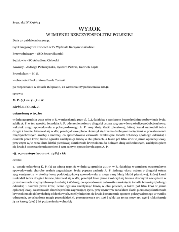 Sygn. akt IV K 96/14 WYROK W IMIENIU RZECZYPOSPOLITEJ POLSKIEJ Dnia 27 października 2014r. Sąd Okręgowy w Gliwicach w IV Wydziale Karnym w składzie : Przewodniczący – SSO Sewer Skumiał Sędziowie - SO Arkadiusz Cichocki Ławnicy - Jadwiga Pieluszyńska, Ryszard Pietraś, Gabriela Kajda Protokolant – M. S. w obecności Prokuratora Pawła Tomaki po rozpoznaniu w dniach 16 lipca; 8, 22 września; 27 października 2014r. sprawy: K. P. (1) ur. (...) w R. córki Z. i G. zd. J. oskarżoną o to, że: w dniu 22 grudnia 2013 roku w R. w mieszkaniu przy ul. (...), działając z zamiarem bezpośrednim pozbawienia życia, zabiła A. P. w ten sposób, że zadała A. P. uderzenie nożem o długości ostrza 19,5 cm w lewą okolicę podobojczykową, wskutek czego spowodowała u pokrzywdzonego A. P. ranę kłutą klatki piersiowej, której kanał uszkodził żebra drugie i trzecie, kierował się w dół, przebijał lewe płuco i kończył się trzema drobnymi nacięciami w przestrzeniach międzyżebrowych szóstej i siódmej, co spowodowało całkowite zamknięcie światła tchawicy (dolnego odcinka) i oskrzeli przez krew, liczne ogniska zachłyśnięć krwią w obu płucach, a także pół litra krwi w jamie opłucnej lewej, przy czym w/w rana kłuta klatki piersiowej skutkowała krwotokiem do dolnych dróg oddechowych, zachłyśnięciem się krwią i ostatecznie uduszeniem i tym samym spowodowała zgon A. P.. -tj. o przestępstwo z art. 148 § 1 kk orzeka: 1. uznaje oskarżoną K. P. (1) za winną tego, że w dniu 22 grudnia 2013r. w R. działając w zamiarze ewentualnym spowodowania choroby realnie zagrażającej życiu poprzez zadanie A. P. jednego ciosu nożem o długości ostrza 19,5 centymetra w okolicę lewą podobojczykową spowodowała u niego ranę kłutą klatki piersiowej, której kanał uszkodził żebra drugie i trzecie, kierował się w dół, przebijał lewe płuco i kończył się trzema drobnymi nacięciami w przestrzeniach międzyżebrowych szóstej i siódmej, co spowodowało całkowite zamknięcie światła tchawicy (dolnego odcinka) i oskrzeli przez krew, liczne ogniska zachłyśnięć krwią w obu płucach, a także pół litra krwi w jamie opłucnej lewej, co stanowiło chorobę realnie zagrażającą życiu, przy czym w/w rana kłuta klatki piersiowej skutkowała krwotokiem do dolnych dróg oddechowych, zachłyśnięciem się krwią i ostatecznie zgonem pokrzywdzonego w wyniku uduszenia, co oskarżona mogła przewidzieć, tj. przestępstwa z art. 156 § 3 kk i za to na mocy art. 156 § 3 kk skazuje ją na karę 5 (pięć ) lat pozbawienia wolności; 2. na mocy art. 63 § 1 kk zalicza oskarżonej na poczet orzeczonej kary okres rzeczywistego pozbawienia wolności od dnia 22 grudnia 2013r. do dnia 27 października 2014r.; 3. na mocy art. 44 § 2 kk orzeka środek karny w postaci przepadku dowodu rzeczowego w postaci noża zapisanego pod numerem 19/14 księgi przechowywanych przedmiotów tut. Sądu, natomiast na mocy art. 230 § 2 kpk zwraca oskarżonej piżamę dwuczęściową i resztki odzieży zapisane pod tym samym numerem księgi przechowywanych przedmiotów; 4. zasądza od Skarbu Państwa na rzecz Kancelarii Adwokackiej B. H. kwotę 1549,80 zł (jeden tysiąc pięćset czterdzieści dziewięć i 80/100), w tym 23 % podatku VAT, tytułem nieopłaconej dotychczas pomocy prawnej udzielanej z urzędu oskarżonej w postępowaniu przygotowawczym i sądowym; 5. na mocy art. 624 § 1 kpk zwalnia oskarżoną od uiszczenia kosztów sądowych. Sygn. akt IV K 96/14 UZASADNIENIE Prokuratura Rejonowa w Rudzie Śląskiej oskarżyła K. P. (1) o to, w dniu 22 grudnia 2013 roku w R. w mieszkaniu przy ul. (...), działając z zamiarem bezpośrednim pozbawienia życia, zabiła A. P. w ten sposób, że zadała A. P. uderzenie nożem o długości ostrza 19,5 cm w lewą okolicę podobojczykową, wskutek czego spowodowała u pokrzywdzonego A. P. ranę kłutą klatki piersiowej, której kanał uszkodził żebra drugie i trzecie, kierował się w dół, przebijał lewe płuco i kończył się trzema drobnymi nacięciami w przestrzeniach międzyżebrowych szóstej i siódmej, co spowodowało całkowite zamknięcie światła tchawicy (dolnego odcinka) i oskrzeli przez krew, liczne ogniska zachłyśnięć krwią w obu płucach, a także pół litra krwi w jamie opłucnej lewej, przy czym w/w rana kłuta klatki piersiowej skutkowała krwotokiem do dolnych dróg oddechowych, zachłyśnięciem się krwią i ostatecznie uduszeniem i tym samym spowodowała zgon A. P. -tj. o przestępstwo z art. 148 § 1 kk. Przytoczenie w tym miejscu zarzutu in extenso jest konieczne z uwagi na poczynione przez Sąd ustalenia, korektę opisu czynu i zmianę jego kwalifikacji prawnej. Rodzina P. (ojciec i dwoje dorosłych dzieci – K. i A.) zamieszkiwała w R. przy ulicy (...), z tym że pobyt A. P. bywał tam tylko okresowo tolerowany (nie miał nawet kluczy od domu). Wszyscy domownicy mieli problem alkoholowy, na podłożu którego dochodziło (najczęściej pomiędzy rodzeństwem) do awantur ( zeznania sąsiadów: A. K. k – 399v, 400, 19; M. Ż. k – 400, 400v, 174; M. S. k- 400v, 308; E. K. k – 416v, 171v; G. K. k – 417, 173v; kwestionariusz wywiadu środowiskowego 134 do 136), w trakcie których wielokrotnie była wzywana Policja, najczęściej przez K. P. (1) ( wykaz interwencji za rok 2013 k - 389-392, 410-412, 5-7). Relatywnie niewielki stopień intensywności tych zajść (wyzwiska, przepychanki, szarpanina – bez powodowania obrażeń) skutkował pouczeniami lub zabieraniem A. P. na izbę wytrzeźwień, natomiast nie były w ostatnich latach prowadzone dalsze czynności procesowe. W dniu 22 grudnia 2013r. oskarżona, znajdująca się już pod wpływem alkoholu, udała się rano z sąsiadką – K. G. (zeznania k – 374v, 375, 17, 18) – na przedświąteczne zakupy. W sklepie kobiety zakupiły również piwo, które miały wypić w mieszkaniu Pani G. z ojcem oskarżonej – Z. P. (skorzystał z 