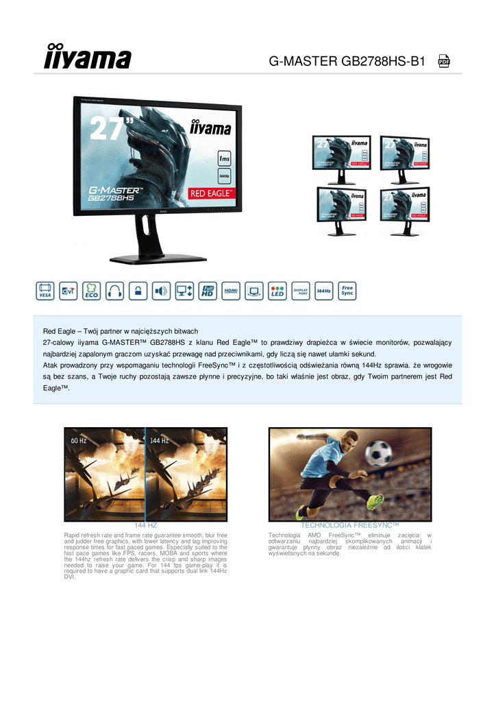 G-MASTER GB2788HS-B1 Red Eagle – Twój partner w najcięższych bitwach 27-calowy iiyama G-MASTER™ GB2788HS z klanu Red Eagle™ to prawdziwy drapieżca w świecie monitorów, pozwalający najbardziej zapalonym graczom uzyskać przewagę nad przeciwnikami, gdy liczą się nawet ułamki sekund. Atak prowadzony przy wspomaganiu technologii FreeSync™ i z częstotliwością odświeżania równą 144Hz sprawia. że wrogowie są bez szans, a Twoje ruchy pozostają zawsze płynne i precyzyjne, bo taki właśnie jest obraz, gdy Twoim partnerem jest Red Eagle™. 144 HZ TECHNOLOGIA FREESYNC™ Rapid refresh rate and frame rate guarantee smooth, blur free and judder free graphics, with lower latency and lag improving response times for fast paced games. Especially suited to the fast pace games like FPS, racers, MOBA and sports where the 144hz refresh rate delivers the crisp and sharp images needed to raise your game. For 144 fps game-play it is required to have a graphic card that supports dual link 144Hz DVI. Technologia AMD FreeSync™ eliminuje zacięcia w odtwarzaniu najbardziej skomplikowanych animacji i gwarantuje płynny obraz niezależnie od ilości klatek wyświetlanych na sekundę. 1. CHARAKTERYSTYKA OBRAZU PRZEKĄTNA EKRANU 27"; 68.6cm PANEL TN LED MAKS. POWIERZCHNIA ROBOCZA (WYS. X SZER.) 336.2 x 597.6 mm; 13.2" x 23.5" CZAS REAKCJI 1 ms KONTRAST 1000 : 1 typowy KONTRAST 12 000 000 : 1 ACR JASNOŚĆ 300 cd/m² typowa KĄT WIDZENIA CR>10 poziomo/pionowo: 170°/ 160°; prawo/lewo: 85°/ 85°; góra/dół: 80°/ 80° WYŚWIETLANE KOLORY 16.7 mln WIELKOŚĆ PLAMKI (PION. X POZ.) 0.311 x 0.311 mm ROZDZIELCZOŚĆ FIZYCZNA Full HD 1080p (VGA @60Hz, HDMI @120Hz, DVI-D&DisplayPort @144Hz), 1920 x 1080 ( 2.1 megapiksela) CZĘSTOTLIWOŚĆ POZIOMA DVI/DP: 30 - 160 KHz CZĘSTOTLIWOŚĆ PIONOWA DVI/DP: 55 - 145 Hz SYNCHRONIZACJA Separate Sync FORMAT OBRAZU 16 : 9 2. INTERFEJSY CYFROWE WEJŚCIE SYGNAŁU DVI-D, HDMI, DisplayPort HDCP tak WYJŚCIE SŁUCHAWKOWE tak WYJŚCIA wyjście słuchawkowe 3. WŁAŚCIWOŚCI KOMPATYBILNOŚĆ Z APPLE Wszystkie monitory iiyama są kompatybilne z komputerami Apple Macintosh. PLUG & PLAY VESA DDC2B™ przy pomocy On-Screen-Display w 10 językach (EN, FR, DE, NL, PL, IT, CZ, RU, JP, REGULACJA PARAMETRÓW Chiński(tradycyjny i uproszczony) i 5 przycisków (Power, Wybierz/ Wejście sygnału, W górę/ Audio, W dól/ i-Style Colour, Menu) obraz (kontrast, jasność, OD, ACR, ECO, głębia czerni, zakres HDMI RGB, format obrazu, ostrość, technologia X-Res), wybór wejścia sygnału, regulacje audio (głośność, wycisz, cyfrowe audio), kolor, PARAMETRY REGULOWANE język, ustawienia OSD (pozycja pozioma, pozycja pionowa, przezroczystość, czas wygaszania menu OSD), ustawienia (zapisz ustawienia użytkownika, FreeSync, redukcja niebieskiego światła, logo startowe, LED, informacje, przywróć ustawienia fabryczne) GŁOŚNIKI 2 x 2.5 W (Stereo) ZABEZPIECZENIE PRZED KRADZIEŻĄ kompatybilny z Kensington-lock™ CERTYFIKATY CE, TÜV-Bauart, CU, VCCI-B, PSE EKSTRA współpracuje z technologią FreeSync™ STOPKA Z REGULACJĄ WYSOKOŚCI tak REGULACJA WYSOKOŚCI 130 mm KĄT OBROTU 90°; 45° w lewo; 45° w prawo KĄT POCHYLENIA 17° w górę; -° w dół STANDARD VESA 100 x 100 mm KOLOR czarny 4. AKCESORIA STEROWNIKI AKCESORIA W ZESTAWIE Windows 95 / 98 / 2000 / ME / XP / Vista/ 7/ 8/ 10 kabel zasilający, kabel DVI-D (dual-link), kabel DisplayPort, kabel Audio, skrócona instrukcja obsługi, instrukcja bezpieczeństwa 5. ZARZĄDZANIE ENERGIĄ ZASILANIE AC 100 - 240 V, 50 / 60 Hz ZASILACZ wewnętrzny ZUŻYCIE ENERGII 35 W typowo; maks. 0.5 W w trybie Power management ZARZĄDZANIE ENERGIĄ VESA DPMS, ENERGY STAR® 6. KLASA ENERGETYCZNA (EU) KLASA EFEKTYWNOŚCI ENERGETYCZNEJ B PRZEKĄTNA OBSZARU WIDOCZNEGO 61 cm; 24"; (segment 24'') Zgodnie z rozporządzeniem (EU) 1062/2010. *W oparciu o telewizor pracujący 4 godziny dziennie przez 365 dni w roku. Rzeczywiste zużycie zależy od faktycznego użytkowania. 7. WYMIARY / WAGA WYMIARY (SZER. X WYS. X GŁ.) 643.5 x 412 (542) x 230 mm WAGA 6.9 kg Wszystkie znaki towarowe zastrzeżone. Pomyłki i wprowadzanie zmian zastrzeżone. Specyfikacje produktów mogą ulec zmianie bez wcześniejszego zawiadomienia. Wszystkie monitory LCD iiyama są zgodne z normą ISO-9241-307:2008 określającą liczbę i rodzaj defektów matrycy. © IIYAMA CORPORATION ( ). ALL RIGHTS RESERVED.