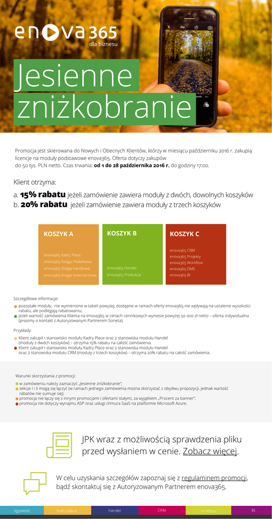 dla biznesu Jesienne zniżkobranie Promocja jest skierowana do Nowych i Obecnych Klientów, którzy w miesiącu październiku 2016 r. zakupią licencje na moduły podstawowe enova365. Oferta dotyczy zakupów do 50 tys. PLN netto. Czas trwania: od 1 do 28 października 2016 r. do godziny 17:00. Klient otrzyma: a. 15% rabatu jeżeli zamówienie zawiera moduły z dwóch, dowolnych koszyków b. 20% rabatu jeżeli zamówienie zawiera moduły z trzech koszyków KOSZYK B KOSZYK A KOSZYK C enova365 CRM enova365 Kadry Płace enova365 Projekty enova365 Księga Podatkowa enova365 Workflow enova365 Księga Handlowa enova365 Handel enova365 DMS enova365 Księga Inwentarzowa enova365 Produkcja enova365 BI Szczegółowe informacje: pozostałe moduły, nie wymienione w tabeli powyżej, dostępne w ramach oferty enova365 nie wpływają na ustalenie wysokości rabatu, ale podlegają rabatowaniu; jeżeli wartość zamówienia Klienta na enova365 w cenach cennikowych wyniesie powyżej 50 000 zł netto – oferta indywidualna (prosimy o kontakt z Autoryzowanym Partnerem Soneta); Przykłady: Klient zakupił 1 stanowisko modułu Kadry Płace oraz 2 stanowiska modułu Handel (moduły z dwóch koszyków) – otrzyma 15% rabatu na całość zamówienia. Klient zakupił 1 stanowisko modułu Kadry Płace oraz 2 stanowiska modułu Handel oraz 2 stanowiska modułu CRM (moduły z trzech koszyków) – otrzyma 20% rabatu na całość zamówienia. Warunki skorzystania z promocji: w zamówieniu należy zaznaczyć „Jesienne zniżkobranie”; sekcje I i II mogą się łączyć (w ramach jednego zamówienia można skorzystać z obydwu propozycji, jednak wartość rabatów nie sumuje się); promocja nie łączy się z innymi promocjami i ofertami stałymi, za wyjątkiem „Procent za banner”; promocja nie dotyczy wynajmu ASP oraz usługi chmura SaaS na platformie Microsoft Azure. JPK wraz z możliwością sprawdzenia pliku przed wysłaniem w cenie. Zobacz więcej. W celu uzyskania szczegółów zapoznaj się z regulaminem promocji, bądź skontaktuj się z Autoryzowanym Partnerem enova365. handel CRM BI