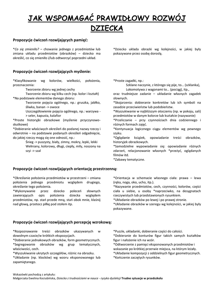 JAK WSPOMAGAĆ PRAWIDŁOWY ROZWÓJ DZIECKA Propozycje ćwiczeń rozwijających pamięć: *Co się zmieniło? – chowanie jednego z przedmiotów lub zmiana układu przedmiotów (obrazków) – dziecko ma określić, co się zmieniło i/lub odtworzyć poprzedni układ. *Dziecko układa obrazki wg kolejności, w jakiej były pokazywane przez osobę dorosłą. Propozycje ćwiczeń rozwijających myślenie: *Klasyfikowanie wg kolorów, wielkości, położenia, przeznaczenia: Tworzenie zbioru wg jednej cechy Tworzenie zbioru wg kilku cech (np. kolor i kształt) *Na podstawie elementów danego zbioru: Tworzenie pojęcia ogólnego, np.: gruszka, jabłko, śliwka, banan -> owoce Uszczegółowienie pojęcia ogólnego, np.: warzywa > seler, kapusta, kalafior *Proste historyjki obrazkowe (myślenie przyczynowoskutkowe) *Dobieranie właściwych określeń do podanej nazwy rzeczy i odwrotnie – na podstawie podanych określeń odgadnięcie, do jakiej rzeczy mogą się one odnosić, np.: Śnieg -> puszysty, biały, zimny, mokry, lepki, lekki Wełniany, kolorowy, długi, ciepły, miły, noszony na szyi -> szal *Proste zagadki, np.: Szklane naczynie, z którego się pije, to… (szklanka), Lokomotywa z wagonami to… (pociąg), itp., oraz trudniejsze zadanie – układanie własnych zagadek słownych. *Skojarzenia: dobieranie konkretów lub ich symboli na zasadzie przeciwieństw lub podobieństw. *Wyszukiwanie w najbliższym otoczeniu (np. w pokoju, sali) przedmiotów w danym kolorze lub kształcie (nazywanie) *Przeliczanie – przy czynnościach dnia codziennego i różnych formach zajęć. *Kontynuacja logicznego ciągu elementów wg pewnego szyku. *Oglądanie książek, opowiadanie treści obrazków, historyjek obrazkowych. *Samodzielne wypowiadanie się: opowiadanie różnych zdarzeń, relacjonowanie własnych *przeżyć, oglądanych filmów itd. *Zabawy tematyczne. Propozycje ćwiczeń rozwijających orientację przestrzenną: *Określanie położenia przedmiotów w przestrzeni – zmiana położenia jednego przedmiotu względem drugiego, określanie tego położenia. *Wykonywanie przez dziecko poleceń słownych zawierających opis położenia dziecka względem przedmiotów, np. stań przede mną, stań obok mnie, klaśnij nad głową, przetocz piłkę pod stołem itp. *Orientacja w schemacie własnego ciała: prawa – lewa (ręka, noga, oko, ucho, itp.). *Nazywanie przedmiotów, cech, czynności, kolorów, części ciała u siebie, u osoby *naprzeciwko, na desygnatach rzeczywistych lub przedstawionych rysunkiem. *Układanie obrazków po lewej i po prawej stronie. *Układanie obrazków w szeregu wg kolejności, w jakiej były pokazywane. Propozycje ćwiczeń rozwijających percepcję wzrokową: *Rozpoznawanie treści obrazków ukazywanych w dowolnym czasie/w krótkich ekspozycjach. *Dobieranie jednakowych obrazków, form geometrycznych. *Segregowanie obrazków wg grup tematycznych, właściwości, cech. *Wyszukiwanie ukrytych szczegółów, różnic na obrazku. *Układanie (np. klocków) wg wzoru eksponowanego lub zapamiętanego. *Puzzle, układanki, dobieranie części do całości. *Dobieranie do konturów figur takich samych kształtów figur i nałożenie ich na wzór. *Odtworzenie z pamięci eksponowanych przedmiotów i wskazanie po krótkiej przerwie miejsca, na którym leżały. *Układanie kompozycji z oddzielnych figur geometrycznych. *Kończenie zaczętych rysunków. Wskazówki pochodzą z artykułu: Małgorzata Ewelina Kociubińska, Dziecko z trudnościami w nauce - ryzyko dysleksji Trudne sytuacje w przedszkolu