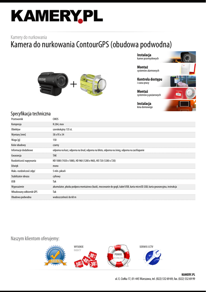 Kamery do nurkowania Kamera do nurkowania ContourGPS (obudowa podwodna) Instalacja kamer przemysłowych Montaż systemów alarmowych Kontrola dostępu i czasu pracy Montaż systemów p.pożarowych Instalacja kina domowego Specyfikacja techniczna Przetwornik CMOS Kompresja H.264, mov Obiektyw szerokokątny 135 st. Wymiary [mm] 58 x 95 x 34 Waga [g] 150 Kolor obudowy czarny Informacje dodatkowe odporna na kurz, odporna na brud, odporna na błoto, odporna na śnieg, odporna na zachlapanie Gwarancja TAK Rozdzielczość nagrywania HD 1080 (1920 x 1080), HD 960 (1280 x 960), HD 720 (1280 x 720) Dźwięk mono Maks. rozdzielczość zdjęć 5 mln. pikseli Stabilizator obrazu cyfrowy USB Tak Wyposażenie akumulator, płaska podpora montażowa (kask), mocowanie do gogli, kabel USB, karta microSD 2GB, karta gwarancyjna, instrukcja Wbudowany odbiornik GPS Tak Obudowa podwodna wodoszczelność do 60 m Naszym klientom oferujemy: WYSOKIE RABATY SERWIS CCTV POMOC TECHNICZNA KAMERY.PL ul. E. Ciołka 17, 01-445 Warszawa, tel. (022) 532 69 69, fax. (022) 532 69 99