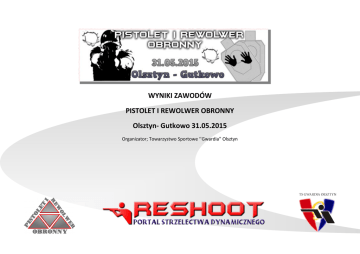 WYNIKI ZAWODÓW PISTOLET I REWOLWER OBRONNY Olsztyn- Gutkowo 31.05.2015 Organizator; Towarzystwo Sportowe ‘’Gwardia” Olsztyn L.p. Imię i nazwisko 1. Jacek Ostrzycki 2. Marek Wawrzonowski 3. Janusz Barański 4. Marcin Głuch 5. Michał Porycki 6. Radosław Krzycki 7. Piotr Surtel 8. Marcin Bienias 9. Artur Popiołek 10. Rafał Warchoł 11. Dawid Myk 12. Maciej Sułek 13. Tomasz Bajerowski 14. Jarosław Korzeniowski 15. Henryk Kulwicki 16. Dawid Pelawski 17. Szymon Szajewski Klasa sprzętowa Pistolet Standard Pistolet Standard Pistolet Standard Pistolet Standard Pistolet Standard Pistolet Standard Pistolet Standard Pistolet Standard Pistolet Standard Pistolet Standard Pistolet Standard Pistolet Standard Pistolet Standard Pistolet Standard Pistolet Standard Pistolet Standard Pistolet Standard Test klasyfikacyjny PiRO Tor nr 1 Tor nr 2 Tor nr 3 34,27 27,32 44,34 31,28 29,94 38,62 43,62 27,44 43,44 32,35 29,95 50,76 33,66 33,85 50,81 32,30 29,78 58,26 35,04 36,40 59,37 37,87 38,48 59,49 41,61 36,49 59,37 42,60 33,28 64,73 40,69 33,22 77,24 43,95 47,52 62,64 44,91 35,25 72,01 47,52 41,22 62,38 45,47 41,71 62,92 54,36 46,74 87,86 50,35 49,04 88,30 Suma Expert 105,93 Expert 99,84 Expert 114,5 Expert 113,06 Expert 118,32 As 120,34 As 130,81 As 135,84 As 137,47 AS 140,61 AS 151,15 Strzelec 154,11 Strzelec 152,17 Strzelec 151,12 Strzelec 150,01 Strzelec 188,96 Strzelec 187,96 Tor nr 4 Tor nr 5 Tor nr6 Tor nr 7 Wynik 4,81 14,68 13,69 7,86 146,97 5,22 20,25 15,30 7,06 147,67 5,44 16,39 14,88 9,05 160,26 5,10 16,41 23,81 8,10 166,48 5,60 16,81 15,01 11,29 167,03 9,80 20,42 23,87 8,59 183,02 12,80 23,20 20,14 10,16 197,11 7,25 18,00 20,92 17,24 199,25 9,35 25,33 17,16 11,96 201,27 6,24 19,48 29,32 9,42 205,07 8,70 18,12 18,42 11,59 207,98 11,17 18,07 19,07 11,21 213,63 10,75 22,41 22,39 11,02 218,74 7,95 29,15 21,42 11,03 220,67 6,73 31,57 28,32 14,42 231,14 8,86 25,81 18,38 11,73 253,74 15,40 32,53 23,07 12,85 271,54 L.p. Imię i nazwisko 1. Jacek Ostrzycki 2. Radosław Krzycki 3. Rafała Warchoł 4. Artur Popiołek 5. Andrzej Sapryka 6. Piotr Onych Nagrody Fair Play: Tomasz Bajerowski Marek Wawrzonowski Klasa sprzętowa Pistolet Dużego Kalibru Pistolet Dużego Kalibru Pistolet Dużego Kalibru Pistolet Dużego Kalibru Pistolet Dużego Kalibru Pistolet Dużego Kalibru Test klasyfikacyjny PiRO Tor nr 1 Tor nr 2 Tor nr 3 Suma 35,12 33,98 54,93 45,91 28,27 56,31 58,38 36,53 58,67 49,35 36,25 62,53 45,43 37,94 77,90 As 124,03 As 130,49 Strzelec 153,58 Strzelec 148,13 Strzelec 161,27 ---------- --------- --------- --------- Tor nr 4 Tor nr 5 Tor nr6 Tor nr 7 Wynik 7,01 12,36 13,79 8,39 165,58 19,01 15,61 19,56 8,66 193,33 9,71 18,54 20,82 11,87 214,52 7,99 29,02 17,90 13,92 216,96 7,32 15,95 27,00 10,82 222,36 13,02 19,85 -------- 14,67 47,54