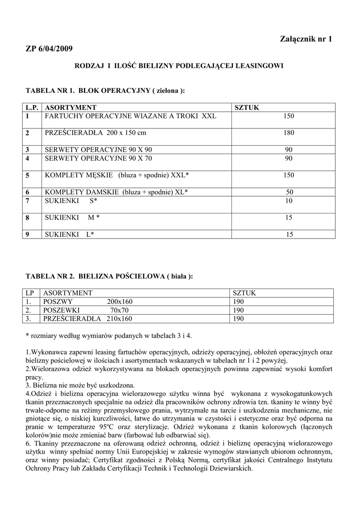 Załącznik nr 1 ZP 6/04/2009 RODZAJ I ILOŚĆ BIELIZNY PODLEGAJĄCEJ LEASINGOWI TABELA NR 1. BLOK OPERACYJNY ( zielona ): L.P. ASORTYMENT FARTUCHY OPERACYJNE WIAZANE A TROKI XXL 1 SZTUK 150 2 PRZEŚCIERADŁA 200 x 150 cm 180 3 4 SERWETY OPERACYJNE 90 X 90 SERWETY OPERACYJNE 90 X 70 90 90 5 KOMPLETY MĘSKIE (bluza + spodnie) XXL* 150 6 7 KOMPLETY DAMSKIE (bluza + spodnie) XL* SUKIENKI S* 50 10 8 SUKIENKI 15 9 SUKIENKI L* M* 15 TABELA NR 2. BIELIZNA POŚCIELOWA ( biała ): LP 1. 2. 3. ASORTYMENT POSZWY 200x160 POSZEWKI 70x70 PRZEŚCIERADŁA 210x160 SZTUK 190 190 190 * rozmiary według wymiarów podanych w tabelach 3 i 4. 1.Wykonawca zapewni leasing fartuchów operacyjnych, odzieŜy operacyjnej, obłoŜeń operacyjnych oraz bielizny pościelowej w ilościach i asortymentach wskazanych w tabelach nr 1 i 2 powyŜej. 2.Wielorazowa odzieŜ wykorzystywana na blokach operacyjnych powinna zapewniać wysoki komfort pracy. 3. Bielizna nie moŜe być uszkodzona. 4.OdzieŜ i bielizna operacyjna wielorazowego uŜytku winna być wykonana z wysokogatunkowych tkanin przeznaczonych specjalnie na odzieŜ dla pracowników ochrony zdrowia tzn. tkaniny te winny być trwałe-odporne na reŜimy przemysłowego prania, wytrzymałe na tarcie i uszkodzenia mechaniczne, nie gniotące się, o niskiej kurczliwości, łatwe do utrzymania w czystości i estetyczne oraz być odporna na pranie w temperaturze 95ºC oraz sterylizacje. OdzieŜ wykonana z tkanin kolorowych (łączonych kolorów)nie moŜe zmieniać barw (farbować lub odbarwiać się). 6. Tkaniny przeznaczone na oferowaną odzieŜ ochronną, odzieŜ i bieliznę operacyjną wielorazowego uŜytku winny spełniać normy Unii Europejskiej w zakresie wymogów stawianych ubiorom ochronnym, oraz winny posiadać; Certyfikat zgodności z Polską Normą, certyfikat jakości Centralnego Instytutu Ochrony Pracy lub Zakładu Certyfikacji Technik i Technologii Dziewiarskich. OdzieŜ winna spełniać wymagania norm zharmonizowanych PN-EN 13795-1:2006 i PN-EN 137952:2005 lub wymagania zapewniające równowaŜny poziom bezpieczeństwa. 7. Oferowany asortyment odzieŜy ochronnej i operacyjnej oraz bielizny operacyjnej wielorazowego uŜytku winien spełniać normy Unii Europejskiej w zakresie wymogów stawianych ubiorom ochronnym, tkaniny z których został wykonany winny posiadać; Certyfikat zgodności z Polską Normą, certyfikat jakości Centralnego Instytutu Ochrony Pracy lub Zakładu Certyfikacji Technik i Technologii Dziewiarskich, co naleŜy odpowiednio udokumentować. 8. Fartuch operacyjny posiada wzmocniony przód (podwójna tkanina) na całej długości oraz wzmocnione rękawy zakończone bawełnianym ściągaczem dzianinowym. 9. Góra spodni wykończona paskiem z tasiemką z tej samej tkaniny, słuŜącą do regulowania obwodu pasa. 10. Fartuch operacyjny wiązany na troki rozmiar XXL 11. Bluzy operacyjne, sukienki krótki rękaw 12. OdzieŜ i bielizna operacyjna nie mogą być zapylone 13. Rozliczanie sztuka za sztukę. Ilość bielizny wypranej w poszczególnych asortymentach musi odpowiadać ilości przekazanej do prania. 14. Wykonawca zapewni regularną kontrolę fartuchów operacyjnych, odzieŜy operacyjnej oraz obłoŜeń operacyjnych 15. Opakowanie i oznakowanie fartuchów operacyjnych, odzieŜy operacyjnej oraz obłoŜeń operacyjnych muszą spełniać wymagania dyrektywy medycznej MDD 93/42/EWG oraz normy PN-EN 868. TABELA NR 3. ROZMAIARY MĘSKIE Rozmiar S M L XL XXL XXXL Wzrost 164 170 176 182 188 188 Obwód klatki piersiowej 84-88 89-96 97-102 103-112 113-120 121-130 Obwód pasa 74-78 79-86 87-92 93-100 101-108 109-120 TABELA NR 3. ROZMAIARY DAMSKIE Rozmiar XS S M L XL XXL XXXL Wzrost 158 162 164 170 172 176 182 Obwód klatki piersiowej 74-81 82-89 90-96 97-106 107-116 117-128 129-138 Obwód bioder 84-91 92-98 99-104 105-112 113-124 125-134 135-142