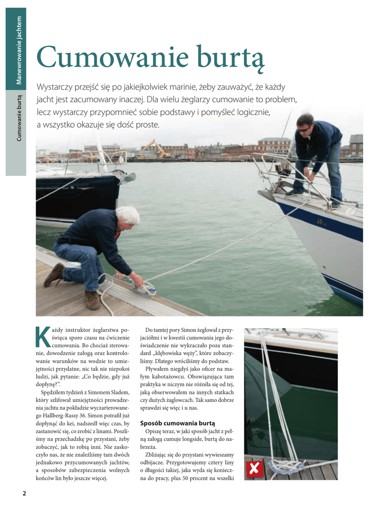 Manewrowanie jachtem Cumowanie burtą Cumowanie burtą Wystarczy przejść się po jakiejkolwiek marinie, żeby zauważyć, że każdy jacht jest zacumowany inaczej. Dla wielu żeglarzy cumowanie to problem, lecz wystarczy przypomnieć sobie podstawy i pomyśleć logicznie, a wszystko okazuje się dość proste. K ażdy instruktor żeglarstwa poświęca sporo czasu na ćwiczenie cumowania. Bo chociaż sterowanie, dowodzenie załogą oraz kontrolowanie warunków na wodzie to umiejętności przydatne, nic tak nie niepokoi ludzi, jak pytanie: „Co będzie, gdy już dopłynę?”. Spędziłem tydzień z Simonem Sladem, który szlifował umiejętności prowadzenia jachtu na pokładzie wyczarterowanego Hallberg-Rassy 36. Simon potrafił już dopłynąć do kei, nadszedł więc czas, by zastanowić się, co zrobić z linami. Poszliśmy na przechadzkę po przystani, żeby zobaczyć, jak to robią inni. Nie zaskoczyło nas, że nie znaleźliśmy tam dwóch jednakowo przycumowanych jachtów, a sposobów zabezpieczenia wolnych końców lin było jeszcze więcej. 2 Do tamtej pory Simon żeglował z przyjaciółmi i w kwestii cumowania jego doświadczenie nie wykraczało poza standard „kłębowiska węży”, które zobaczyliśmy. Dlatego wróciliśmy do podstaw. Pływałem niegdyś jako oficer na małym kabotażowcu. Obowiązująca tam praktyka w niczym nie różniła się od tej, jaką obserwowałem na innych statkach czy dużych żaglowcach. Tak samo dobrze sprawdzi się więc i u nas. Sposób cumowania burtą Opiszę teraz, w jaki sposób jacht z pełną załogą cumuje longside, burtą do nabrzeża. Zbliżając się do przystani wywieszamy odbijacze. Przygotowujemy cztery liny o długości takiej, jaka wyda się konieczna do pracy, plus 50 procent na wszelki ✘ Oto pierwsza łyżka dziegciu w beczce mojego idealnego świata. Znaleźliśmy się z Simonem w takiej sytuacji na pokładzie naszego Hallberga-Rassy’ego. Byłem szczerze zdumiony tym odkryciem, gdyż Hallberg-Rassy to renomowany jacht morski. Ale życie pełne jest drobnych rozczarowań. Na pokładzie nie było też kluz. W zamian zainstalowano cztery wielkie knagi w czterech narożnikach pokładu i dwie w okolicach śródokręcia. Z cumami nie mieliśmy kłopotów, ale cóż było począć ze szpringami? Bez wątpienia pan H lub pan R wyobrażali sobie, że użyjemy potężnej knagi na śródokręciu, lecz to oznaczałoby ✘ Tak robić nie należy: kilka lin na jednej knadze i bałagan na fordeku. ✘ Odpowiedź brzmi: najprościej jak to możliwe. › jedna lina, jedno zadanie › jedna lina, jedna knaga › końce na kei › luz wybrany na pokład i zamocowany › zwoje liny na pokładzie uporządkowane. Korzystaj z rad zawodowców I to wszystko! Nawet w idealnych warunkach (marina bez prądów i wiatru) na większym statku każda lina musi być dostępna osobno, tak by załoga mogła obsługiwać je pojedynczo. Jeśli zamocowany na nabrzeżu koniec cumy zostaje wykorzystany dodatkowo jako szpring lub nawet obłożony na tej samej knadze na pokładzie, dublując się z inną liną, to od razu powstaje dla jachtu zagrożenie. Gdy załoga musi poluzować cumę rufową, nie może tego zrobić, na przykład, bez oddania szpringu. A wtedy jacht może poruszyć się w niezamierzony sposób lub nawet „skoczyć” do przodu. Wykorzystanie jednej liny do wielu funkcji konieczność zaplątania na niej dwóch lin. Koszmar, którego nie można zaakceptować. Zgodnie bowiem z prawem Murphy’ego, zawsze okaże się, że ta lina, którą właśnie musimy poluzować albo wybrać, znajduje się pod spodem. O ile jeszcze ujdzie to w spokojnej marinie, to już nie przy kamiennym nabrzeżu. Ponadto szpring wydany z rufy przyciąga ją do nabrzeża. Analogicznie, szpring dziobowy przyciąga dziób do nabrzeża, mocno trzymając. Te wydane ze śródpokładu są znacznie mniej skuteczne. Ograniczają tylko przesuwanie się jachtu wzdłuż nabrzeża, gdy jest zbyt mało miejsca, żeby cumy dziobowa i rufowa, mogły spełnić swoje zadanie. I to prawie wszystko, co są w stanie zrobić. Simon wpadł na świetny pomysł, by wykorzystać knagi jako kluzy, poprowadzić przez nie szpringi i zamocować je na wolnych knagach na drugiej burcie. Metoda ta sprawdziła się całkiem dobrze. Nie byłem tym zachwycony, ale cóż, potrzeba jest matką wynalazku. Poza tym jacht nie wyglądał jak kocia kołyska. Do obsługi cum i szpringów zawsze można wykorzystać kabestany, ale w naszym przypadku uniemożliwił to brak kluz. Czasem można poprowadzić cumę naraz powoduje, że prosta czynność staje się koszmarem. Kiedy przedstawiłem Simonowi regułę „jedna lina – jedno zadanie”, stwierdził, że to ma sens, zadał jednak bardzo rozsądne pytanie: „Dlaczego więc na tych wszystkich jachtach dzieje się inaczej?”. Nie wiem, odpowiedziałem. Jedno jest pewne. Sposób stosowany na statkach jest znacznie łatwiejszy i bezpieczniejszy. A także pozwala wykonać pracę trochę szybciej. W ubiegłym roku wysłałem swoją córkę i jej chłopaka na brzeg, żeby przesunęli nieco jakiegoś trzydziestostopowca tak, bym mógł zmieścić się rufą przy nabrzeżu. Zajęło im to 10 minut, a gdyby jacht był zacumowany we właściwy sposób, uwinęliby się z tym w dwie, trzy minuty. Córka wróciła na pokład ciężko zdyszana. Cumowanie burtą Co zrobić, gdy mamy za mało knag? Jak cumują burtą statki i duże jachty? Manewrowanie jachtem wypadek, wyprowadzając ich końce przez kluzy lub pod relingiem. Nie ma szczególnego pośpiechu ze szpringami – mogą poczekać. Załoganci obsługujący cumy, dziobową i rufową, trzymają w pogotowiu zwinięte końce lin i ustawiają się przy wantach, żeby zejść na keję, gdy jacht dobije do niej burtą. Mocują liny cumownicze z dziobu i rufy na polerach, knagach lub kółkach cumowniczych w zależności od tego, jak uzbrojone jest nabrzeże. Następnie ich luz wybierany jest na pokład, gdzie mocowane s