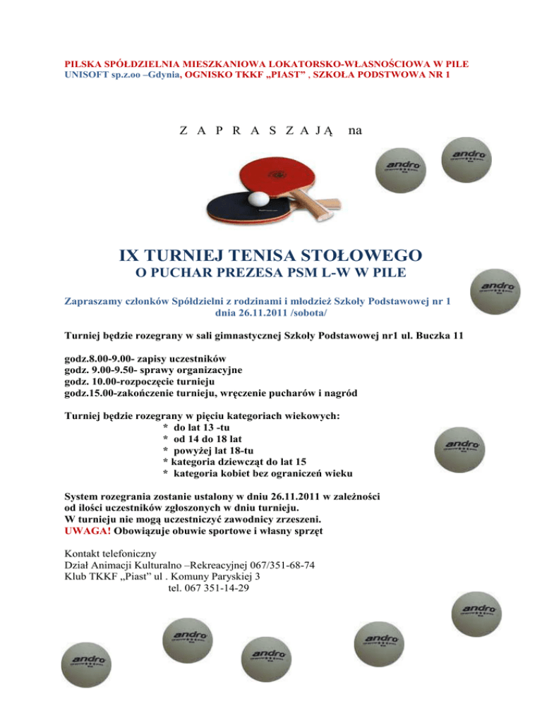 PILSKA SPÓŁDZIELNIA MIESZKANIOWA LOKATORSKO-WŁASNOŚCIOWA W PILE UNISOFT sp.z.oo –Gdynia, OGNISKO TKKF „PIAST” , SZKOŁA PODSTWOWA NR 1 Z A P R A S Z A JĄ na IX TURNIEJ TENISA STOŁOWEGO O PUCHAR PREZESA PSM L-W W PILE Zapraszamy członków Spółdzielni z rodzinami i młodzież Szkoły Podstawowej nr 1 dnia 26.11.2011 /sobota/ Turniej będzie rozegrany w sali gimnastycznej Szkoły Podstawowej nr1 ul. Buczka 11 godz.8.00-9.00- zapisy uczestników godz. 9.00-9.50- sprawy organizacyjne godz. 10.00-rozpoczęcie turnieju godz.15.00-zakończenie turnieju, wręczenie pucharów i nagród Turniej będzie rozegrany w pięciu kategoriach wiekowych: * do lat 13 -tu * od 14 do 18 lat * powyżej lat 18-tu * kategoria dziewcząt do lat 15 * kategoria kobiet bez ograniczeń wieku System rozegrania zostanie ustalony w dniu 26.11.2011 w zależności od ilości uczestników zgłoszonych w dniu turnieju. W turnieju nie mogą uczestniczyć zawodnicy zrzeszeni. UWAGA! Obowiązuje obuwie sportowe i własny sprzęt Kontakt telefoniczny Dział Animacji Kulturalno –Rekreacyjnej 067/351-68-74 Klub TKKF „Piast” ul . Komuny Paryskiej 3 tel. 067 351-14-29