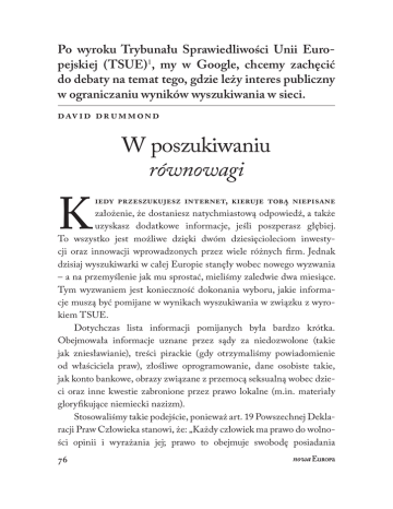Po wyroku Trybunału Sprawiedliwości Unii Europejskiej (TSUE)1, my w Google, chcemy zachęcić do debaty na temat tego, gdzie leży interes publiczny w ograniczaniu wyników wyszukiwania w sieci. dav id dru m mon d K W poszukiwaniu równowagi iedy przeszukujesz internet, kieruje tobą niepisane założenie, że dostaniesz natychmiastową odpowiedź, a także uzyskasz dodatkowe informacje, jeśli poszperasz głębiej. To wszystko jest możliwe dzięki dwóm dziesięcioleciom inwestycji oraz innowacji wprowadzonych przez wiele różnych firm. Jednak dzisiaj wyszukiwarki w całej Europie stanęły wobec nowego wyzwania – a na przemyślenie jak mu sprostać, mieliśmy zaledwie dwa miesiące. Tym wyzwaniem jest konieczność dokonania wyboru, jakie informacje muszą być pomijane w wynikach wyszukiwania w związku z wyrokiem TSUE. Dotychczas lista informacji pomijanych była bardzo krótka. Obejmowała informacje uznane przez sądy za niedozwolone (takie jak zniesławianie), treści pirackie (gdy otrzymaliśmy powiadomienie od właściciela praw), złośliwe oprogramowanie, dane osobiste takie, jak konto bankowe, obrazy związane z przemocą seksualną wobec dzieci oraz inne kwestie zabronione przez prawo lokalne (m.in. materiały gloryfikujące niemiecki nazizm). Stosowaliśmy takie podejście, ponieważ art. 19 Powszechnej Deklaracji Praw Człowieka stanowi, że: „Każdy człowiek ma prawo do wolności opinii i wyrażania jej; prawo to obejmuje swobodę posiadania 76 w poszukiwaniu równowagi niezależnej opinii, poszukiwania, otrzymywania i rozpowszechniania informacji i poglądów wszelkimi środkami, bez względu na granice”. Ale Trybunał doszedł do wniosku, że osoby fizyczne mają prawo poprosić o usunięcie z wyników wyszukiwania informacji zawierających ich imię i nazwisko, jeśli te dane są „niewłaściwe, (już) nieaktualne czy też nadmierne w stosunku do celów, dla których są one przetwarzane”. Decydując o tym, jakie informacje mają zostać usunięte, wyszukiwarki muszą także uwzględniać interes publiczny. Oczywiście są to kryteria bardzo niejasne i subiektywne. Ponadto Trybunał postanowił, że wyszukiwarki nie podlegają zasadzie „wyjątku dziennikarskiego”. To oznacza, że „The Guardian” może zamieścić na swojej witrynie internetowej artykuł na temat jakiejś osoby, co jest całkowicie legalne, ale my możemy nie mieć prawa do pokazania linków do tego artykułu w naszych wynikach wyszukiwania, jeśli stosujesz jako kryterium imię i nazwisko tej osoby. To trochę tak, jakby książka mogła znaleźć się w bibliotece, ale nie wolno było jej umieścić w bibliotecznym katalogu. I właśnie z tego powodu nie zgadzamy się z wyrokiem TSUE. Tym niemniej – oczywiście – uznajemy jego autorytet i robimy wszystko, co w naszej mocy, aby realizować sentencję wyroku szybko i odpowiedzialnie. To ogromne zadanie, ponieważ od maja otrzymaliśmy ponad 70.000 żądań usunięcia informacji odnoszących się do 250.000 stron internetowych. Zatem mamy obecnie zespół ludzi, którzy analizują każdy wniosek indywidualnie, w większości przypadków dysponując skąpymi informacjami oraz prawie nie znając kontekstu. Przykłady, z jakimi się dotąd zetknęliśmy, uwidoczniają trudność osądów wartościujących, przed jakimi stoją obecnie wyszukiwarki internetowe, a także społeczeństwo europejskie: znamy przypadki byłych polityków, którzy chcą usunięcia postów krytycznych wobec polityki, jaką prowadzili, kiedy sprawowali urząd; skazanych za ciężkie przestępstwo, którzy proszą o usunięcie artykułów na temat swoich zbrodni; architektów czy wykładowców pragnących, aby zniknęły niekorzystne 2 (18) / 2014 77 david drummond recenzje ich działalności; jeszcze inni chcą wycofania komentarzy, jakie sami umieścili i teraz tego żałują. W każdym przypadku ktoś chce ukryć informacje, które według innych powinny być powszechnie dostępne. Jeśli chodzi o określenie, co leży w interesie publicznym, uwzględniamy szereg czynników, między innymi to, czy informacja dotyczy polityka, celebryty lub innej postaci publicznej; czy materiał pochodzi z wiarygodnego źródła oraz na ile jest aktualny; czy zawiera przemówienie polityczne; omawia kwestie praktyki zawodowej, które mogą być istotne dla klientów; czy materiał dotyczy skazania za przestępstwo, które jeszcze nie uległo przedawnieniu, oraz czy informacja była publikowana przez rząd. Ale nasze osądy zawsze będą trudne i kontrowersyjne. Ponadto pilnujemy, aby nasza polityka usuwania informacji była przejrzysta: na przykład powiadamiamy witryny internetowe, gdy któraś z nich zostanie pozbawiona linków. Choć nie możemy powiedzieć, dlaczego konkretnie wyeliminowaliśmy dane informacje, ponieważ zgodnie z decyzją TSUE mogłoby to naruszyć prawa do prywatności danej osoby. Oczywiście zważywszy na to, , że od wyroku Trybunału minęły zawyszukiwarki muszą ledwie dwa miesiące, prace nad właściwym rozwiązaniem tych kwestii także uwzględniać są nadal w toku. To dlatego w ubieinteres publiczny. głym tygodniu niesłusznie usunęliśmy linki do pewnych artykułów (już zostały przywrócone). Ale dobre wiadomości są takie, że trwająca obecnie żywa debata pomoże nam w opracowywaniu naszych zasad, polityk oraz praktyk – w szczególności w dojściu do rozstrzygnięcia, jak wyważyć między prawem jednej osoby do prywatności a prawem innej do informacji. To dlatego ustanowiliśmy radę konsultacyjną złożoną z ekspertów, której ostateczny skład ogłosimy niebawem. Ci zewnętrzni eksperci Decydując o tym, jakie informacje mają zostać usunięte 78 w poszukiwaniu równowagi ze świata akademickiego, mediów, ochrony danych, przedstawiciele społeczeństwa obywatelskiego oraz sektora technologii są niezależnymi doradcami Google. Rada będzie prosić różne grupy o materiały dowodowe i rekomendacje, będzie również j