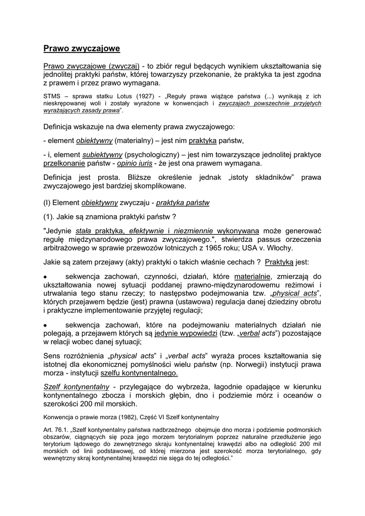 Prawo zwyczajowe Prawo zwyczajowe (zwyczaj) - to zbiór reguł będących wynikiem ukształtowania się jednolitej praktyki państw, której towarzyszy przekonanie, że praktyka ta jest zgodna z prawem i przez prawo wymagana. STMS – sprawa statku Lotus (1927) - „Reguły prawa wiążące państwa (...) wynikają z ich nieskrępowanej woli i zostały wyrażone w konwencjach i zwyczajach powszechnie przyjętych wyrażających zasady prawa”. Definicja wskazuje na dwa elementy prawa zwyczajowego: - element obiektywny (materialny) – jest nim praktyka państw, - i, element subiektywny (psychologiczny) – jest nim towarzyszące jednolitej praktyce przelkonanie państw - opinio iuris - że jest ona prawem wymagana. Definicja jest prosta. Bliższe określenie zwyczajowego jest bardziej skomplikowane. jednak „istoty składników” prawa (I) Element obiektywny zwyczaju - praktyka państw (1). Jakie są znamiona praktyki państw ? "Jedynie stała praktyka, efektywnie i niezmiennie wykonywana może generować regułę międzynarodowego prawa zwyczajowego.", stwierdza passus orzeczenia arbitrażowego w sprawie przewozów lotniczych z 1965 roku; USA v. Włochy. Jakie są zatem przejawy (akty) praktyki o takich właśnie cechach ? Praktyką jest: sekwencja zachowań, czynności, działań, które materialnie, zmierzają do ukształtowania nowej sytuacji poddanej prawno-międzynarodowemu reżimowi i utrwalania tego stanu rzeczy; to następstwo podejmowania tzw. „physical acts”, których przejawem będzie (jest) prawna (ustawowa) regulacja danej dziedziny obrotu i praktyczne implementowanie przyjętej regulacji; sekwencja zachowań, które na podejmowaniu materialnych działań nie polegają, a przejawem których są jedynie wypowiedzi (tzw. „verbal acts”) pozostające w relacji wobec danej sytuacji; Sens rozróżnienia „physical acts” i „verbal acts” wyraża proces kształtowania się istotnej dla ekonomicznej pomyślności wielu państw (np. Norwegii) instytucji prawa morza - instytucji szelfu kontynentalnego. Szelf kontynentalny - przylegające do wybrzeża, łagodnie opadające w kierunku kontynentalnego zbocza i morskich głębin, dno i podziemie mórz i oceanów o szerokości 200 mil morskich. Konwencja o prawie morza (1982), Część VI Szelf kontynentalny Art. 76.1. „Szelf kontynentalny państwa nadbrzeżnego obejmuje dno morza i podziemie podmorskich obszarów, ciągnących się poza jego morzem terytorialnym poprzez naturalne przedłużenie jego terytorium lądowego do zewnętrznego skraju kontynentalnej krawędzi albo na odległość 200 mil morskich od linii podstawowej, od której mierzona jest szerokość morza terytorialnego, gdy wewnętrzny skraj kontynentalnej krawędzi nie sięga do tej odległości.” Prawa państw nadbrzeżnych na szelfie normowane były, do 1958 roku - w dacie tej przyjęto konwencję o szelfie kontynentalnym (Genewa) - wyłącznie prawem zwyczajowym kształtowanym: - z jednej strony, przez inicjowaną stopniowo praktykę jego eksploatacji – limitowaną z uwagi na techniczne niedostatki i stopniowy dopiero rozwój technik eksploatacji szelfu; - z drugiej – niezwykle silnie - przez proklamację (verbal act właśnie) prezydenta USA Harry Trumana z dnia 28. 09. 1945 r., o prawie państwa nadbrzeżnego, ściślej USA, do zawłaszczenia bogactw szelfu przylegającego do ich wybrzeża. Proklamacja stanowiła, m.in., że “having concern for the urgency of conserving and prudently utilizing its natural resources, the Government of the United States regards the natural resources of the subsoil and sea-bed of the continental shelf beneath the high seas but contiguous to the coasts of the United States as appertaining to the United States, subject to its jurisdiction and control”. (2). Czyje zachowania są świadectwem praktyki państwa ? Przede wszystkim organów państwa, które są bezpośrednio zaangażowane w stosunki międzynarodowe - prezydenta, premiera, ministra spraw zagranicznych, służby zagraniczne (służby dyplomatyczne – misje stałe w państwach, misje ad hoc (specjalne), misje w organizacjach międzynarodowych). Są one efektem kontaktów dwustronnych, wielostronnych, realizowanych także na forach organizacji międzynarodowych. Ich wyrazem są m.in., deklaracje wspólne, jednostronne oświadczenia, dokumentacja konferencji i spotkań, korespondencja dyplomatyczna – opisujące, sygnalizujące (bądź nie) o ‘uprawianiu’ praktyki państw w danej dziedzinie obrotu (physical acts/verbal acts). Początkowo „praktykę suwerennych państw”, będącą materialnym fundamentem zwyczaju, łączono wyłącznie z ‘treścią’ wypowiedzi przedstawicieli – w/w organów – bezpośrednio zaangażowanych w służbę zagraniczną państwa. To restryktywne podejście w oglądzie ‘praktyki’ zostało zarzucone na przełomie XIX/XX wieku. Współcześnie świadectwem praktyki są obok sygnalizowanych wyżej, także zachowania innych organów państwa, nie uczestniczących bezpośrednio w obrocie międzynarodowym, m.in., - organów prawodawczych (ustawodawczych); - innych organów administracji państwowej (niezależnie od szczebla); - a także organów sądowych. Świadectwem tego rozszerzenia kręgu ‘praktykujących’ organów państwa jest sygnał płynący z orzeczenia Sądu Najwyższego Stanów Zjednoczonych w sprawie Paquete Habana – (1900). Sprawę tę wywołało zatrzymanie i zajęcie (1898) statku rybackiego (Paquete Habana) przez flotę wojenną Stanów Zjednoczonych blokującą Kubę należącą w tamtej dobie do Hiszpanii, z którą to Stany pozostawały w stanie wojny, a ustanowienie blokady było konsekwencją tego stanu. Zatrzymanie statku – zajmującego się wyłącznie połowem ryb - wywołało pytanie, czy jego zajęcie było zgodne z prawem międzynarodowym wojny morskiej, prawem zwyczajowym ?, czy istnieją podstawy, aby kwalifikować akt połowu ryb za akt wojenny przeciwnika, który uzasadnia z