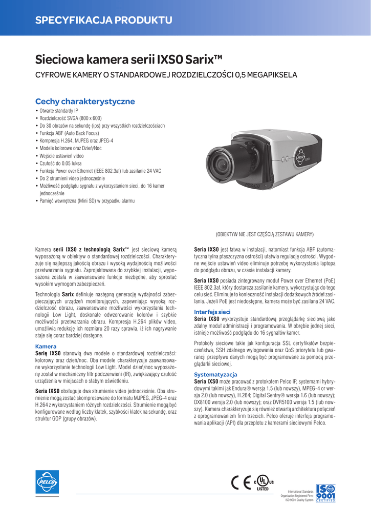 SPECYFIKACJA PRODUKTU Sieciowa kamera serii IXS0 Sarix™ CYFROWE KAMERY O STANDARDOWEJ ROZDZIELCZOŚCI 0,5 MEGAPIKSELA Cechy charakterystyczne • Otwarte standardy IP • Rozdzielczość SVGA (800 x 600) • Do 30 obrazów na sekundę (ips) przy wszystkich rozdzielczościach • Funkcja ABF (Auto Back Focus) • Kompresja H.264, MJPEG oraz JPEG-4 • Modele kolorowe oraz Dzień/Noc • Wejście ustawień video • Czułość do 0.05 luksa • Funkcja Power over Ethernet (IEEE 802.3af) lub zasilanie 24 VAC • Do 2 strumieni video jednocześnie • Możliwość podglądu sygnału z wykorzystaniem sieci, do 16 kamer jednocześnie • Pamięć wewnętrzna (Mini SD) w przypadku alarmu (OBIEKTYW NIE JEST CZĘŚCIĄ ZESTAWU KAMERY) Kamera serii IXS0 z technologią Sarix™ jest sieciową kamerą wyposażoną w obiektyw o standardowej rozdzielczości. Charakteryzuje się najlepszą jakością obrazu i wysoką wydajnością możliwości przetwarzania sygnału. Zaprojektowana do szybkiej instalacji, wyposażona została w zaawansowane funkcje niezbędne, aby sprostać wysokim wymogom zabezpieczeń. Technologia Sarix definiuje następną generację wydajności zabezpieczających urządzeń monitorujących, zapewniając wysoką rozdzielczość obrazu, zaawansowane możliwości wykorzystania technologii Low Light, doskonałe odwzorowanie kolorów i szybkie możliwości przetwarzania obrazu. Kompresja H.264 plików video, umożliwia redukcję ich rozmiaru 20 razy sprawia, iż ich nagrywanie staje się coraz bardziej dostępne. Kamera Serię IXS0 stanowią dwa modele o standardowej rozdzielczości: kolorowy oraz dzień/noc. Oba modele charakteryzuje zaawansowane wykorzystanie technologii Low Light. Model dzień/noc wyposażony został w mechaniczny filtr podczerwieni (IR), zwiększający czułość urządzenia w miejscach o słabym oświetleniu. Seria IXS0 obsługuje dwa strumienie video jednocześnie. Oba strumienie mogą zostać skompresowane do formatu MJPEG, JPEG-4 oraz H.264 z wykorzystaniem różnych rozdzielczości. Strumienie mogą być konfigurowane według liczby klatek, szybkości klatek na sekundę, oraz struktur GOP (grupy obrazów). Seria IXS0 jest łatwa w instalacji, natomiast funkcja ABF (automatyczna tylna płaszczyzna ostrości) ułatwia regulację ostrości. Wygodne wejście ustawień video eliminuje potrzebę wykorzystania laptopa do podglądu obrazu, w czasie instalacji kamery. Seria IXS0 posiada zintegrowany moduł Power over Ethernet (PoE) IEEE 802.3af, który dostarcza zasilanie kamery, wykorzystując do tego celu sieć. Eliminuje to konieczność instalacji dodatkowych źródeł zasilania. Jeżeli PoE jest niedostępne, kamera może być zasilana 24 VAC. Interfejs sieci Seria IXS0 wykorzystuje standardową przeglądarkę sieciową jako zdalny moduł administracji i programowania. W obrębie jednej sieci, istnieje możliwość podglądu do 16 sygnałów kamer. Protokoły sieciowe takie jak konfiguracja SSL certyfikatów bezpieczeństwa, SSH zdalnego wylogowania oraz QoS priorytetu lub gwarancji przepływu danych mogą być programowane za pomocą przeglądarki sieciowej. Systematyzacja Seria IXS0 może pracować z protokołem Pelco IP, systemami hybrydowymi takimi jak Endura® wersja 1.5 (lub nowszy), MPEG-4 or wersja 2.0 (lub nowszy), H.264; Digital Sentry® wersja 1.6 (lub nowszy); DX8100 wersja 2.0 (lub nowszy); oraz DVR5100 wersja 1.5 (lub nowszy). Kamera charakteryzuje się również otwartą architektura połączeń z oprogramowaniem firm trzecich. Pelco oferuje interfejs programowania aplikacji (API) dla przeplotu z kamerami sieciowymi Pelco. International Standards Organization Registered Firm; ISO 9001 Quality System SPECYFIKACJA TECHNICZNA INFORMACJE OGÓLNE INFORMACJE MECHANICZNE Typ matrycy Rodzaj matrycy Odczyt matrycy Rozdzielczość maksymalna Stosunek sygnał/szum Typ obiektywu Zakres elekt. migawki Szeroki zakres dynamiki Balans bieli Czułość Kolor (1x/33ms) Kolor SENS (15x/500ms) Mono (1x/33ms) Mono SENS (15x/500ms) 1/3-cala (efektywnie) CMOS Skanowanie progresywne 800 x 600 Mocowanie obiektywu Mocowanie kamery 50dB automatyczna przesłona Napęd DC 1~1/10000s 60dB 2000° do 10000°K f/1.2, 2800K, SNR >24dB 1.00 Luksa 0,20 Luksa Wymiary 0,20 Luksa 0,05 Luksa Mocowanie CS, regulowane 0.25-cala (0.64cm) śruba UNC-20, góra i dół obudowy kamery WŁAŚCIWOŚCI FIZYCZNE Waga (bez obiektywu) Waga z opakow. 5,4” dł. x 3,1” szer. x 3,0” wys. (13,7 x 7,9 x 7,6cm) 1.11 funta (0.5kg) 2 funty (0,9kg) INFORMACJE O ŚRODOWISKU PRACY Temperatura robocza Temperatura magazynowania Wilgotność magazynowania 14° do 122°F (-10° do 50°C) 14° do 158°F (-10° do 70°C) 20% do 90%, bez kondensacji INFORMACJE ELEKTRYCZNE Port Typ okablowania Moc wejściowa Pobór mocy Aktualny pobór mocy PoE 24 VAC Pamięć wewnętrzna Wejście alarmowe Wyjście alarmowe Złącze serwisowe 5.40 (13.67) Złącze RJ-45 dla 100Base-TX Auto MDI/MDI-X Cat5 lub lepszy dla 100Base-TX 24 VAC lub PoE (IEEE 802.3af klasa 3) <6W 1.95 (4.90) < 200mA maksymalnie < 295mA nominalnie; < 390mA maksymalnie Mini SD 10 VDC maksymalnie, 5mA maksymalnie 0 do 15 VDC maksymalnie, 75mA maksymalnie Zewnętrzne, 3 złącza, 2,5mm 3.00 (7.59) 3.12 (7.92) 3.37* (8.53) *PRZEDNIA POKRYWA OTWARTA UWAGA: wartości w nawiasach są podane w cm; wszystkie inne są podane w calach SPECYFIKACJA TECHNICZNA VIDEO Kodowanie video Strumienie video Liczba klatek H.264 standardowo, MPEG-4, MJPEG Do 2 strumieni jednocześnie; drugi strumień jest zmienny, zależnie od ustawień strumienia głównego Do 30, 25, 24, 15, 12.5, 12, 10, 8, 7. 5, 6, 5, 4, 3, 2, 1 (zależnie od kodowania, rozdzielczości i konfiguracji strumienia) Dostępne rozdzielczości Rozdzielczość MegaWSP. Szerokość Wysokość piksele obrazu 0.5 800 600 4:3 0.3 640 480 4:3 0.1 320 240 4:3 Rozdzielczości dodatkowe Obsługiwane protokoły Użytkownicy Unicast Multicast Zabezpieczenia Interfejs oprogramowania Integracja z systemami Pelco Maksymalna IPS H