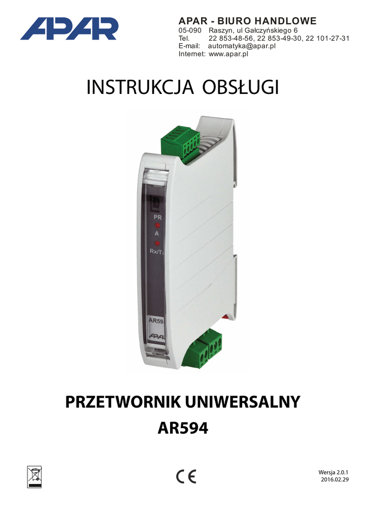 APAR - BIURO HANDLOWE 05-090 Tel. E-mail: Internet: Raszyn, ul Gałczyńskiego 6 22 853-48-56, 22 853-49-30, 22 101-27-31 [email protected] www.apar.pl INSTRUKCJA OBSŁUGI PRZETWORNIK UNIWERSALNY AR594 Wersja 2.0.1 2016.02.29 Dziękujemy za wybór naszego produktu. Niniejsza instrukcja ułatwi Państwu prawidłową obsługę, bezpieczne użytkowanie i pełne wykorzystanie możliwości przyrządu. Przed montażem i uruchomieniem prosimy o przeczytanie i zrozumienie niniejszej instrukcji. W przypadku dodatkowych pytań prosimy o kontakt z doradcą technicznym. SPIS TREŚCI 1. ZASADY BEZPIECZEŃSTWA ....................................................................................................................... 3 2. ZALECENIA MONTAŻOWE ......................................................................................................................... 3 3. OGÓLNA CHARAKTERYSTYKA PRZETWORNIKA.................................................................................... 3 4. ZAWARTOŚĆ ZESTAWU .............................................................................................................................. 4 5. DANE TECHNICZNE ..................................................................................................................................... 4 6. WYMIARY OBUDOWY I DANE MONTAŻOWE ......................................................................................... 5 7. OPIS LISTEW ZACISKOWYCH I POŁĄCZEŃ ELEKTRYCZNYCH ............................................................. 6 8. ROZMIESZCZENIE I OPIS ELEMENTÓW PANELU CZOŁOWEGO .......................................................... 6 9. USTAWIANIE PARAMETRÓW KONFIGURACYJNYCH ............................................................................. 7 10. KONFIGURACJA WYJŚCIA ALARMOWEGO ........................................................................................... 9 11. SYGNALIZACJA BŁĘDÓW POMIAROWYCH .......................................................................................... 9 12. INTERFEJS KOMUNIKACYJNY RS485 (wg EIA RS-485). ..................................................................... 10 13. INTERFEJS KOMUNIKACYJNY RS232C (wg EIA RS-232C) ................................................................. 10 14. PROTOKÓŁ TRANSMISJI SZEREGOWEJ MODBUS-RTU .................................................................... 10 15. PODŁĄCZANIE DO KOMPUTERA I DOSTĘPNE OPROGRAMOWANIE ............................................ 11 16. NOTATKI WŁASNE ................................................................................................................................... 12 ! Należy zwrócić szczególną uwagę na teksty oznaczone tym znakiem Producent zastrzega sobie prawo do dokonywania zmian w konstrukcji i oprogramowaniu urządzenia bez pogorszenia parametrów technicznych (niektóre funkcje mogą być niedostępne w starszych wersjach). 2 1. ZASADY BEZPIECZEŃSTWA ! przed rozpoczęciem użytkowania urządzenia należy dokładnie przeczytać niniejszą instrukcję w celu uniknięcia porażenia prądem elektrycznym bądź uszkodzenia urządzenia montaż mechaniczny oraz elektryczny należy zlecić wykwalifikowanemu personelowi przed włączeniem zasilania należy upewnić się, że wszystkie przewody zostały podłączone prawidłowo przed dokonaniem wszelkich modyfikacji przyłączeń przewodów należy wyłączyć napięcia doprowadzone do urządzenia zapewnić właściwe warunki pracy, zgodne z danymi technicznymi urządzenia (napięcie zasilania, wilgotność, temperatura, rozdział 5) 2. ZALECENIA MONTAŻOWE ! Przyrząd został zaprojektowany tak, aby zapewnić odpowiedni poziom odporności na większość zaburzeń, które mogą wystąpić w środowisku przemysłowym. W środowiskach o nieznanym poziomie zakłóceń zaleca się stosowanie następujących środków zapobiegających ewentualnemu zakłócaniu pracy przyrządu: nie zasilać urządzenia z tych samych linii co urządzenia wysokiej mocy bez odpowiednich filtrów sieciowych stosować ekranowanie przewodów zasilających, czujnikowych i sygnałowych, przy czym uziemienie ekranu powinno być jednopunktowe, wykonane jak najbliżej przyrządu unikać prowadzenia przewodów pomiarowych (sygnałowych) w bezpośrednim sąsiedztwie i równolegle do przewodów energetycznych i zasilających wskazane jest skręcanie parami przewodów sygnałowych dla czujników oporowych w połączeniu 3-przewodowym stosować jednakowe przewody unikać bliskości urządzeń zdalnie sterowanych, mierników elektromagnetycznych, obciążeń wysokiej mocy, obciążeń z fazową lub grupową regulacją mocy oraz innych urządzeń wytwarzających duże zakłócenia impulsowe uziemiać lub zerować metalowe szyny, na których montowane są przyrządy listwowe 3. OGÓLNA CHARAKTERYSTYKA PRZETWORNIKA liniowe przetwarzanie mierzonej temperatury lub innej wielkości fizycznej przetworzonej na sygnał cyfrowy wysoka dokładność, stabilność długoterminowa i odporność na zakłócenia uniwersalne wejście : - termorezystancyjne ...... Pt100, Ni100, Pt500, Pt1000 - termoparowe .................. J, K, S, B, R, T, E, N - analogowe ....................... 0/4÷20mA, 0÷10V, 0÷60mV, rezystancyjne 0÷2500ohm cyfrowy interfejs szeregowy (RS232 lub RS485, protokół MODBUS-RTU) potrójna separacja galwaniczna (wejście / wyjście / zasilanie) wąska obudowa do montażu na listwie TS35 (szyna DIN) zakres przetwarzania, typ wejścia i inne parametry konfigurowane za pomocą: - programu z serii ARSOFT-WZ i programatora AR956 - aplikacji użytkownika - autonomicznego programatora AR950 programowalny alarm przekroczenia zakresu przetwarzania lub wartości zadanej z histerezą (typu włącz-wyłącz, wyjście OC) sygnalizacja LED przekroczenia zakresu przetwarzania, błędu czujnika lub stanu wyjścia alarmowego (typu włącz-wyłącz) wysoka dokładność i odporność na zakłócenia dostępne oprogra