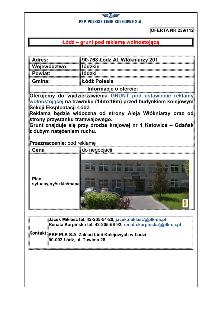 OFERTA NR 239/112 Łódź – grunt pod reklamę wolnostojącą 90-768 Łódź Al. Włókniarzy 201 łódzkie łódzki Łódź Polesie Informacje o ofercie: Oferujemy do wydzierżawienia GRUNT pod ustawienie reklamy wolnostojącej na trawniku (14mx19m) przed budynkiem kolejowym Sekcji Eksploatacji Łódź. Reklama będzie widoczna od strony Aleja Włókniarzy oraz od strony przystanku tramwajowego. Grunt znajduje się przy drodze krajowej nr 1 Katowice – Gdańsk z dużym natężeniem ruchu. Adres: Województwo: Powiat: Gmina: Przeznaczenie: pod reklamę Cena do negocjacji Plan sytuacyjny/szkic/mapa Jacek Mikłasz tel. 42-205-54-20, [email protected] Renata Karpińska tel. 42-205-56-92, [email protected] Kontakt: PKP PLK S.A. Zakład Linii Kolejowych w Łodzi 90-002 Łódź, ul. Tuwima 28