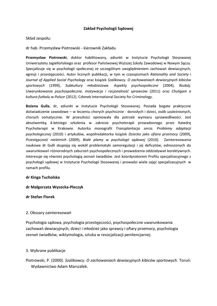 Zakład Psychologii Sądowej Skład zespołu: dr hab. Przemysław Piotrowski - kierownik Zakładu Przemysław Piotrowski, doktor habilitowany, adiunkt w Instytucie Psychologii Stosowanej Uniwersytetu Jagiellońskiego oraz profesor Państwowej Wyższej Szkoły Zawodowej w Nowym Sączu. Specjalizuje się w psychologii społecznej ze szczególnym uwzględnieniem zachowań dewiacyjnych, agresji i przestępczości. Autor licznych publikacji, w tym w czasopismach Rationality and Society i Journal of Applied Social Psychology oraz książek Szalikowcy. O zachowaniach dewiacyjnych kibiców sportowych (1999), Subkultury młodzieżowe. Aspekty psychospołeczne (2004), Rozbój. Uwarunkowania psychospołeczne, motywacja i racjonalność sprawców (2011) oraz Chuligani a kultura futbolu w Polsce (2012). Członek International Society for Criminology. Bożena Gulla, dr, adiunkt w Instytucie Psychologii Stosowanej. Posiada bogate praktyczne doświadczenie zawodowe – w leczeniu chorych psychicznie - dorosłych i dzieci, osób uzależnionych, chorych somatycznie. W przeszłości opiniowała dla potrzeb wymiaru sprawiedliwości. Jest absolwentką 4-letniego szkolenia w zakresie psychoterapii prowadzonego przez Katedrę Psychoterapii w Krakowie. Autorka monografii Transplantacja serca. Problemy adaptacji psychologicznej (2010) i artykułów, współredaktorka książek Dziecko jako ofiara przemocy (2009), Przestępczość nieletnich (2009), Białe plamy w psychologii sądowej (2010). Zainteresowania naukowe dr Gulli skupiają się wokół problematyki samoregulacji i jej deficytów, odnoszonych do uwarunkowań różnorodnych zaburzeń psychospołecznych i prowadzenia oddziaływań korektywnych. Interesuje się również psychologią zeznań świadków. Jest koordynatorem Profilu specjalizacyjnego z psychologii sądowej w Instytucie Psychologii Stosowanej i prowadzi wiele zajęć specjalizacyjnych w ramach profilu. dr Kinga Tucholska dr Małgorzata Wysocka-Pleczyk dr Stefan Florek 2. Obszary zainteresowań Psychologia sądowa, psychologia przestępczości, psychospołeczne uwarunkowania zachowań dewiacyjnych, dzieci i młodzież jako sprawcy i ofiary przemocy, psychologia zeznań świadków, wiktymologia, sztuka w resocjalizacji penitencjarnej. 3. Wybrane publikacje Piotrowski, P. (2000). Szalikowcy. O zachowaniach dewiacyjnych kibiców sportowych. Toruń: Wydawnictwo Adam Marszałek. Piotrowski, P. i Zajączkowski, K. (2003). Profilaktyka w gimnazjum. Projektowanie, realizacja i ewaluacja programów. Kraków: Impuls. Piotrowski, P. (2003). Subkultury młodzieżowe. Aspekty psychospołeczne. Warszawa: Wydawnictwo Akademickie "Żak". Piotrowski, P. (2011). Rozbój. Uwarunkowania psychospołeczne, motywacja i racjonalność sprawców. Warszawa: Wydawnictwo Akademickie „Żak”. Piotrowski, P. (2012). Chuligani a kultura futbolu w Polsce. Warszawa: Wydawnictwo Naukowe PWN. Wysocka-Pleczyk, M., Passowicz, P., Piotrowski, P. i Woźniak, U. (2004). Zagrożenia i poczucie bezpieczeństwa w opinii nauczycieli i uczniów szkół krakowskich. Kraków: IPS UJ. Piotrowski, P. (ed.)(2006). Understanding Problems of Social Pathology. Amsterdam-New York: Rodopi. Piotrowski, P. (2006). Coping with Football-Related Hooliganism: Healing Symptoms versus Causes Prevention. Journal of Applied Social Psychology, 36, 3, 629-643. Piotrowski, P. (2011). Kontrowersyjna dychotomia. Agresja wroga, agresja instrumentalna i zastosowanie reversal theory M.J. Aptera do analizy przestępczości. Czasopismo Psychologiczne, 17(1), 29-35. Piotrowski, P., Gulla, B. i Jaskułowski, M. (2011). Inteligencja emocjonalna sprawców przestępstw przeciwko mieniu. Czasopismo Psychologiczne, 17(2), 219-228. Piotrowski, P. (2011). Street robbery offenders. Shades of rationality and reversal theory perspective. Rationality and Society, 23(4), 461-485. Piotrowski, P., Wysocka-Pleczyk, M. i Passowicz, P. (2012). Social exclusion paradox in Poland. Global Journal of Community Psychology Practice, 4(3), 1-4. Piotrowski, P., Bajek, Z. i Florek, S. (2013). The Artistic Statements of Inmates about Freedom: the "Labyrinth of Freedom" Project and Its Possible Applications. Art Inquiry, 15, 215-230. Tucholska K., Gulla B. (2008). Psychologia pozytywna – krytyczna ocena koncepcji, Studia z Psychologii w KUL, 14, 109-133 Gulla B., Tucholska K. (2008). Cele naukowo - badawcze i aplikacyjne psychologii pozytywnej, Studia z Psychologii w KUL, 14, 135-154 Gulla B., Wysocka – Pleczyk M. (red.). (2009). Wydawnictwo dwutomowe Dziecko jako ofiara i sprawca przemocy, tom I Dziecko jako ofiara przemocy, tom II Przestępczość nieletnich. Kraków: WUJ Gulla B., Niewiadomska I., Wysocka-Pleczyk M.(red.). (2010). Białe plamy w psychologii sądowej. Kraków: Wyd. UJ Gulla B. (2010). Transplantacja serca. Problemy adaptacji psychologicznej. Kraków: Wyd. UJ Gulla B. (2012). Zachowania manipulacyjne wychowanków instytucji o charakterze resocjalizacyjnym. [W:] R. Szczepanik, J. Wawrzyniak (red.), Opieka i wychowanie w instytucjach wsparcia społecznego. Diagnoza i kierunki rozwoju. Łódź: Wyd. Akademii Humanistyczno-Ekonomicznej w Łodzi, s. 179-192 Gulla B. (2012). Rozwijanie funkcji samoopiekuńczej u dzieci jako element rodzinnych działań profilaktycznych, Problemy Higieny i Epidemiologii, 93 (4), 673-678 Gulla B. (2013). Oddziaływania psychologiczne w sieci. [w:] M. Wysocka-Pleczyk, B. Świeży (red.), Człowiek zalogowany. Od mowy nienawiści do integracji sieci. Kraków, Biblioteka Jagiellońska, 64-75 (ISBN 978-83-934926-4-0), http://jbc.bj.uj.edu.pl/dlibra/docmetadata?id=254812 Gulla B., Stosowanie leczniczych środków zabezpieczających wobec chorych psychicznie sprawców czynów zabronionych [w:] M. Szpitalak, K. Kasparek, Psychologia sądowa. Wybrane zagadnienia. Kraków, Wyd. UJ (w druku) 4. Współpraca: Zespół Zakładu Psychologii Sądowej współpracuje z: - International Academy of Investigative Psychology, University of Huddersfield - Zakładem K