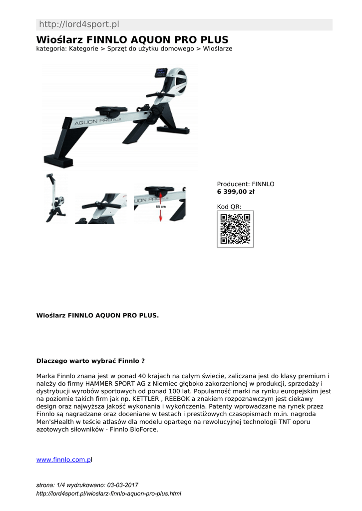 http://lord4sport.pl Wioślarz FINNLO AQUON PRO PLUS kategoria: Kategorie > Sprzęt do użytku domowego > Wioślarze Producent: FINNLO 6 399,00 zł Kod QR: Wioślarz FINNLO AQUON PRO PLUS. Dlaczego warto wybrać Finnlo ? Marka Finnlo znana jest w ponad 40 krajach na całym świecie, zaliczana jest do klasy premium i należy do firmy HAMMER SPORT AG z Niemiec głęboko zakorzenionej w produkcji, sprzedaży i dystrybucji wyrobów sportowych od ponad 100 lat. Popularność marki na rynku europejskim jest na poziomie takich firm jak np. KETTLER , REEBOK a znakiem rozpoznawczym jest ciekawy design oraz najwyższa jakość wykonania i wykończenia. Patenty wprowadzane na rynek przez Finnlo są nagradzane oraz doceniane w testach i prestiżowych czasopismach m.in. nagroda Men'sHealth w teście atlasów dla modelu opartego na rewolucyjnej technologii TNT oporu azotowych siłowników - Finnlo BioForce. www.finnlo.com.pl strona: 1/4 wydrukowano: 03-03-2017 http://lord4sport.pl/wioslarz-finnlo-aquon-pro-plus.html Wioślarz FINNLO Aquon Pro Plus Zmiana oporu na wiośle, dla wygodnej i szybkiej zmiany obciążenia bez przerywania treningu Odległość między podnóżkami tylko 9 cm Wysokość siedziska ok. 50 cm Dzięki długiej taśmie – 215 cm i długim szynom aluminiowym – 135 cm jest odpowiedni do użytkowników o wzroście od 1,5 do ponad 2 metrów 12 programów fitness zapewnia zróżnicowany trening od poziomu dla początkujących do poziomu dla zaawansowanych użytkowników 4 programy tętna – gwarantują wydajny i kontrolowany trening wioślarski 5 programów Pacer (programy do rywalizowania z komputerem), w tym jeden program z indywidualnym programowaniem. Komputer treningowy z wyświetlaczem o niebieskim podświetleniu Zakres mocy jest ustawiany komputerowo w zakresie od 30 do 300 Wattów Wyświetlane dane treningowe: czas, dystans, czas po 500m, intensywność, ilość wiosłowań na minutę, łączna ilość wiosłowań, program, tętno, spalone kalorie Do wyboru mamy m.in. 12 programów fitness, 2 programy Pacer, 2 programy czasowe, 4 programy tętna Najważniejsze informacje o produkcie: Ergonometr klasy SA (zgodnie z normą DIN EN 957-1/7), wykorzystywany do treningów przez profesjonalnych wioślarzy, zdobywców złotych medali i mistrzów świata Regulacja obciążenia: niezależna od liczby obrotów Intensywność: ustawiana w zakresie 30-300 Watt Zmiana obciążenia na wiośle, dla wygodnej i szybkiej zmiany bez przerywania treningu Odległość między podnóżkami tylko 9 cm Wysokośćsiedziska ok. 50 cm System hamowania – magnetyczno-powietrzny Wyświetlane informacje: czas / moc / poziom / ilość wiosłowań na minutę / program / tętno / łączna ilość wiosłowań / czas po 500m / dystans / spalone kalorie Wyświetlacz LCD z niebieskim podświetleniem 11 stałych wyświetlanych funkcji, 12 programów fitness, 2 programy czasowe, 4 programy tętna 5 programów Pacer (rywalizacja z komputerem), w tym jeden program z indywidualnym programowaniem Możliwość wprowadzenia danych treningowych Możliwość zapisania 4 użytkowników Zintegrowany odbiornik do pasa telemetrycznego Komputer treningowy na ekstra długim ramieniu możliwością regulacji położenia Długa taśma – 215 cm i długie szyny aluminiowe – 135 cm, Regulowane podpórki do stóp Wysokiej jakości aluminiowa płoza zapewnia maksymalną stabilność Komfortowe siodełko wyposażone w łożyska kulkowe dla szczególnie długich sekwencji strona: 2/4 wydrukowano: 03-03-2017 http://lord4sport.pl/wioslarz-finnlo-aquon-pro-plus.html wioślarskich Zintegrowane rolki transportowe Maksymalna waga ciała: 150 kg Zasilanie: 230 Volt Kolor: srebrny / czarny Główne zalety: Duży stabilny wioślarz, posiada solidą ramę Konstrukcja zbliżona do Concept 2 Mocne opory podczas wiosłowania System hamowania : powietrzno-magnetyczny Duży czytelny wyświetlacz Bardzo dobry stosunek jakość - cena Estetycznie wykonany Gwarancja 3 lata Funkcje komputera: Wyświetlane parametry: Dystans, Czas, Czas po 500 m, Ilość spalonych kalorii, Watt, Ilość wiosłowań na minutę, Puls Pomiar pulsu: pas telemetryczny (opcja) Zakres regulacji mocy: 30-300 Watt Programy treningowe Programy sterowane pulsem Wyświetlacz LCD: niebieski llość wyświetlanych funkcji jednocześnie: 11 Ilość użytkowników: 4 Dane techniczne: System hamowania : powietrzno-magnetyczny Regulacja oporu w rączce Rolki transportowe Możliwość złożenia Odległość między podnóżkami: 9 cm Odległość siedziska od podłogi: 50 cm Zakres obciążenia: RMP niezależny Zasilanie: 230 V Max.waga użytkownika: 150 kg System napędu: pas klinowy Wymiary po rozłożeniu: 249 x 51 x 98 cm Wymiary po złożeniu: 148 x 51 x 196 cm Kolor: srebrny / czarny strona: 3/4 wydrukowano: 03-03-2017 http://lord4sport.pl/wioslarz-finnlo-aquon-pro-plus.html Dodatkowe informacje: Towar na zamówienie - przed zakupem prosimy o kontakt Koszt transportu i montażu ustalamy indywidualnie Gwarancja domowa 36 miesięcy Gwarancja komercyjna 24 miesiące Numer katalogowy: 3704 Nie znalazłeś produktu który Cię interesuje ? Skontaktuj się z nami tel. 32-270-77-22 - postaramy się rozwiązać ten problem strona: 4/4 wydrukowano: 03-03-2017 http://lord4sport.pl/wioslarz-finnlo-aquon-pro-plus.html