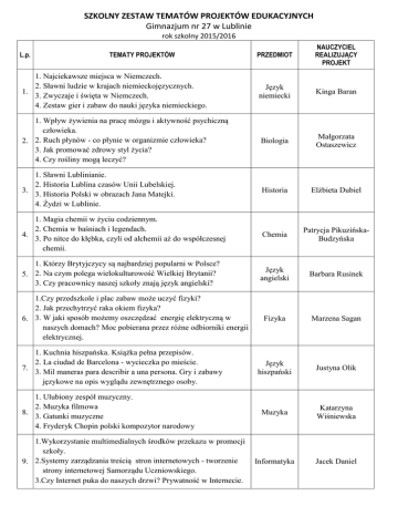 SZKOLNY ZESTAW TEMATÓW PROJEKTÓW EDUKACYJNYCH Gimnazjum nr 27 w Lublinie rok szkolny 2015/2016 PRZEDMIOT NAUCZYCIEL REALIZUJĄCY PROJEKT 1. Najciekawsze miejsca w Niemczech. 2. Sławni ludzie w krajach niemieckojęzycznych. 1. 3. Zwyczaje i święta w Niemczech. 4. Zestaw gier i zabaw do nauki języka niemieckiego. Język niemiecki Kinga Baran 1. Wpływ żywienia na pracę mózgu i aktywność psychiczną człowieka. 2. 2. Ruch płynów - co płynie w organizmie człowieka? 3. Jak promować zdrowy styl życia? 4. Czy rośliny mogą leczyć? Biologia Małgorzata Ostaszewicz 1. Sławni Lublinianie. 2. Historia Lublina czasów Unii Lubelskiej. 3. 3. Historia Polski w obrazach Jana Matejki. 4. Żydzi w Lublinie. Historia Elżbieta Dubiel 1. Magia chemii w życiu codziennym. 2. Chemia w baśniach i legendach. 4. 3. Po nitce do kłębka, czyli od alchemii aż do współczesnej chemii. Chemia Patrycja PikuzińskaBudzyńska 1. Którzy Brytyjczycy są najbardziej popularni w Polsce? 5. 2. Na czym polega wielokulturowość Wielkiej Brytanii? 3. Czy pracownicy naszej szkoły znają język angielski? Język angielski Barbara Rusinek Fizyka Marzena Sagan Język hiszpański Justyna Olik Muzyka Katarzyna Wiśniewska Informatyka Jacek Daniel L.p. TEMATY PROJEKTÓW 1.Czy przedszkole i plac zabaw może uczyć fizyki? 2. Jak przechytrzyć raka okiem fizyka? 6. 3. W jaki sposób możemy oszczędzać energię elektryczną w naszych domach? Moc pobierana przez różne odbiorniki energii elektrycznej. 1. Kuchnia hiszpańska. Książka pełna przepisów. 2. La ciudad de Barcelona - wycieczka po mieście. 7. 3. Mil maneras para describir a una persona. Gry i zabawy językowe na opis wyglądu zewnętrznego osoby. 1. Ulubiony zespół muzyczny. 2. Muzyka filmowa 8. 3. Gatunki muzyczne 4. Fryderyk Chopin polski kompozytor narodowy 1.Wykorzystanie multimedialnych środków przekazu w promocji szkoły. 2.Systemy zarządzania treścią stron internetowych - tworzenie 9. strony internetowej Samorządu Uczniowskiego. 3.Czy Internet puka do naszych drzwi? Prywatność w Internecie. SZKOLNY ZESTAW TEMATÓW PROJEKTÓW EDUKACYJNYCH Gimnazjum nr 27 w Lublinie rok szkolny 2015/2016 1. Miejsca w naszym mieście związane z literaturą (twórcami literatury). 2. Jak przedstawić „Zemstę” A. Fredry, aby nasi rówieśnicy chcieli ją oglądać? 10. 3. I ty możesz zostać pisarzem. Piszemy, ilustrujemy bajki dla dzieci. 4. Śmieszą, uczą i bawią-bajki Ignacego Krasickiego na scenie. 5. Sylwetki polskich laureatów literackiej nagrody Nobla. Język polski Bożenna Doktór 1. W świecie liczb. 11. 2. Wokół twierdzenia Pitagorasa. 3. Bryły platońskie. Matematyka Danuta Soboń Geografia Kamil Szpyt 1. Makieta szkoły. 2. Top 20 of Lublin. Przewodnik po 20 najciekawszych miejscach 12. w Lublinie. 3. Mieszkańcy Lubelszczyzny. 1. Makieta szkoły 2020. Zagospodarowanie sportowoprzestrzenne. 13. 2. Czy znamy lubelskich sportowców? Historia sportu na Lubelszczyźnie. 3.”Noc sportu”. Gry, turnieje klasowe, bieg na orientację. Kamil Stefaniak Wychowanie Przemysław Chudzik fizyczne Konrad Radecki Katarzyna Plewko