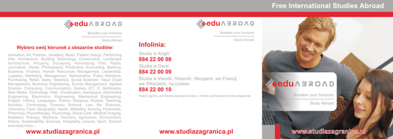 Free International Studies Abroad Broaden your horizons Broaden your horizons Study Abroad Study Abroad Wybierz swój kierunek z obszarów studiów: Animation, Art, Fashion, Jewellery, Music, Pattern Design, Performing Arts, Architecture, Building Technology, Construction, Landscape Architecture, Property, Surveying, Advertising, Film, Radio, Journalism, Media, Photography, Production, Accounting, Banking, Business, Finance, Human Resources Management, Leadership, Logistics, Marketing, Management, Mathematics, Public Relations, Purchasing, Retail, Sales, Statistics, Social Sciences, Value Chain Management, Business Engineering, Events Management, Applied Science, Computing, Communication, Games, ICT, IT, Multimedia, New Media, Technology, Web, Visualisation, Aerospace, Automotive Engineering, Electronics, Engineering, Mechanical Engineering, English, History, Languages, Politics, Religious Studies, Teaching, Nutrition, Criminology, Forensic Science, Law, Bio Sciences, Chemistry, Food, Geography, Health, Midwifery, Nursing, Paramedic, Pharmacy, Physiotherapy, Psychology, Social Care, Medical Imaging, Radiation Therapy, Medicine, Dentistry, Agriculture, Environment, Nature, Sustainability, Exercise, Hospitality, Leisure, Sport, Tourism and many more ... www.studiazagranica.pl Infolinia: test Studia w Anglii: 884 22 00 08 test Studia w Danii: 884 22 00 09 test Studia w Irlandii, Holandii, Hiszpanii, we Francji, we W³oszech, na £otwie: 884 22 00 10 test Koszt zgodny ze stawk¹ operatora sieci, z której wykonywane jest po³¹czenie. Broaden your horizons Study Abroad www.studiazagranica.pl www.studiazagranica.pl Broaden your horizons Broaden your horizons Broaden your horizons Study Abroad Study Abroad Study Abroad O Programie eduABROAD Program eduABROAD to szansa dla wszystkich pragn¹cych zdobywaæ wiedzê i doœwiadczenie na zagranicznych uczelniach wy¿szych. Program eduABROAD oferuje bezp³atn¹ pomoc przy wyborze odpowiedniego kraju, uczelni i kierunku studiów, a tak¿e zebraniu wszystkich dokumentów i przygotowaniu aplikacji. Program eduABROAD to oficjalne przedstawicielstwo zagranicznych uczelni wy¿szych w Polsce. W Programie eduABROAD aplikacjê na studia za granic¹ mo¿na z³o¿yæ bezpoœrednio i bez ¿adnych dodatkowych op³at. Wiêcej informacji na temat Programu eduABROAD oraz uczelni uczestnicz¹cych w Programie eduABROAD znajdziesz na stronie: www.studiazagranica.pl ANGLIA Studia s¹ odp³atne, wysokoœæ czesnego ustalaj¹ uczelnie. Mo¿na uzyskaæ po¿yczkê na op³acenie czesnego, sp³acan¹ w momencie podjêcia pracy po studiach. Istnieje równie¿ szansa zdobycia stypendiów. Studenci mog¹ legalnie pracowaæ w trakcie studiów. .. DANIA .. Studia s¹ bezp³atne, prowadzone w jêzyku angielskim. Certyfikaty jêzykowe nie s¹ wymagane. Studenci mog¹ legalnie pracowaæ w trakcie studiów, zarobki umo¿liwiaj¹ pokrycie kosztów ¿ycia i studiowania. .. IRLANDIA Studia s¹ odp³atne, prowadzone w jêzyku angielskim. Kandydaci, dla których s¹ to pierwsze studia nie ponosz¹ kosztów czesnego, studia s¹ bezp³atne. Mo¿na otrzymaæ stypendium lub grant. Studenci mog¹ legalnie pracowaæ w trakcie studiów. .. HOLANDIA Studia w jêzyku angielskim s¹ odp³atne, mo¿na jednak ubiegaæ siê o grant lub zdobyæ stypendium. Studenci mog¹ legalnie pracowaæ w trakcie studiów. www.studiazagranica.pl FRANCJA Studia na prywatnych uczelniach s¹ odp³atne. Studia prowadzone s¹ równie¿ w jêzyku angielskim. Prywatne uczelnie we Francji, to szko³y o du¿ym presti¿u, kszta³c¹ce specjalistów. Mo¿na otrzymaæ stypendium. Studenci mog¹ legalnie pracowaæ w trakcie studiów. www.studiazagranica.pl HISZPANIA Studia s¹ odp³atne. Studia prowadzone s¹ równie¿ w jêzyku angielskim. Mo¿na otrzymaæ stypendium lub grant. Studenci mog¹ legalnie pracowaæ w trakcie studiów. .. £OTWA Studia s¹ odp³atne, prowadzone w jêzyku angielskim. Studenci mog¹ legalnie pracowaæ w trakcie studiów bez ¿adnych ograniczeñ. .. W£OCHY Studia s¹ odp³atne. Studia prowadzone s¹ równie¿ w jêzyku angielskim. Mo¿na otrzymaæ stypendium. Studenci mog¹ legalnie pracowaæ w trakcie studiów. www.studiazagranica.pl