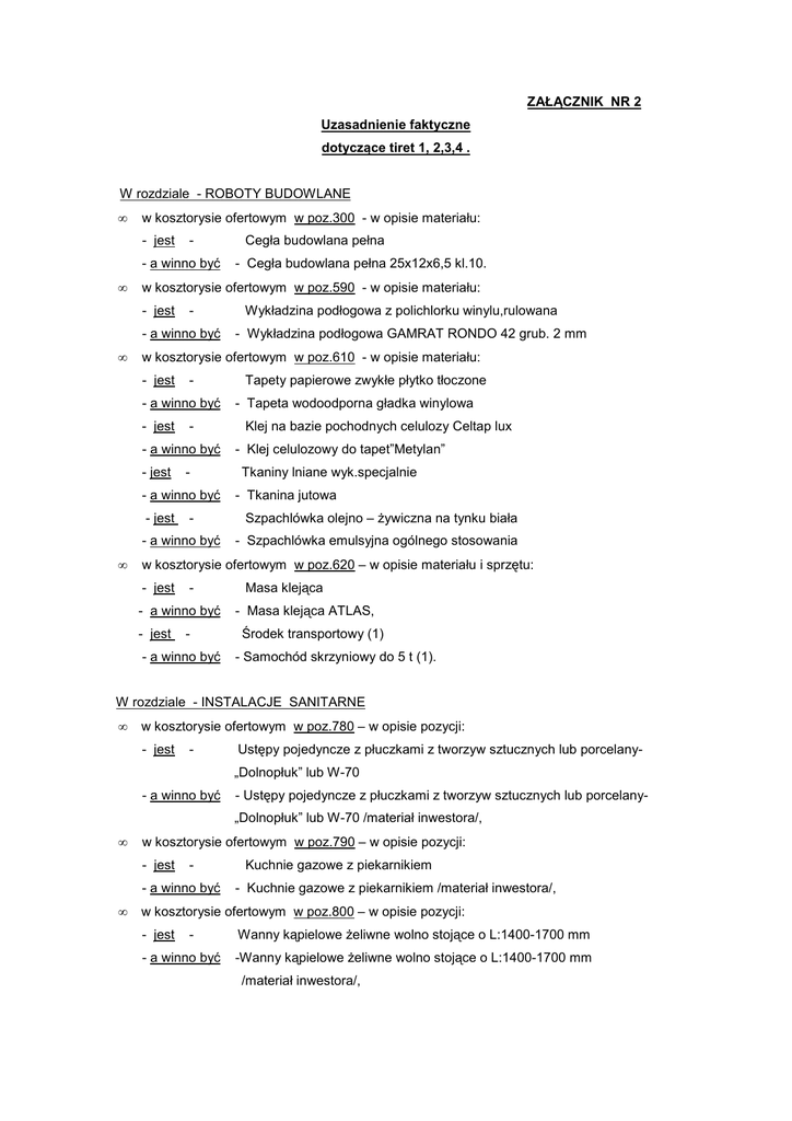 ZAŁĄCZNIK NR 2 Uzasadnienie faktyczne dotyczące tiret 1, 2,3,4 . W rozdziale - ROBOTY BUDOWLANE • w kosztorysie ofertowym w poz.300 - w opisie materiału: - jest - - a winno być • - - a winno być Wykładzina podłogowa z polichlorku winylu,rulowana - Wykładzina podłogowa GAMRAT RONDO 42 grub. 2 mm w kosztorysie ofertowym w poz.610 - w opisie materiału: - jest - - a winno być - jest - - a winno być - jest - - a winno być - jest - - a winno być • - Cegła budowlana pełna 25x12x6,5 kl.10. w kosztorysie ofertowym w poz.590 - w opisie materiału: - jest • Cegła budowlana pełna Tapety papierowe zwykłe płytko tłoczone - Tapeta wodoodporna gładka winylowa Klej na bazie pochodnych celulozy Celtap lux - Klej celulozowy do tapet”Metylan” Tkaniny lniane wyk.specjalnie - Tkanina jutowa Szpachlówka olejno – Ŝywiczna na tynku biała - Szpachlówka emulsyjna ogólnego stosowania w kosztorysie ofertowym w poz.620 – w opisie materiału i sprzętu: - jest - - a winno być - jest - - a winno być Masa klejąca - Masa klejąca ATLAS, Środek transportowy (1) - Samochód skrzyniowy do 5 t (1). W rozdziale - INSTALACJE SANITARNE • w kosztorysie ofertowym w poz.780 – w opisie pozycji: - jest - Ustępy pojedyncze z płuczkami z tworzyw sztucznych lub porcelany„Dolnopłuk” lub W-70 - a winno być - Ustępy pojedyncze z płuczkami z tworzyw sztucznych lub porcelany„Dolnopłuk” lub W-70 /materiał inwestora/, • w kosztorysie ofertowym w poz.790 – w opisie pozycji: - jest - - a winno być • Kuchnie gazowe z piekarnikiem - Kuchnie gazowe z piekarnikiem /materiał inwestora/, w kosztorysie ofertowym w poz.800 – w opisie pozycji: - jest - - a winno być Wanny kąpielowe Ŝeliwne wolno stojące o L:1400-1700 mm -Wanny kąpielowe Ŝeliwne wolno stojące o L:1400-1700 mm /materiał inwestora/, • w kosztorysie ofertowym w poz.810 – w opisie pozycji: - jest - - a winno być Baterie umywalkowe lub zmywakowe ścienne o średnicy nominalnej 15 mm -Baterie umywalkowe lub zmywakowe ścienne o średnicy nominalnej 15 mm /materiał inwestora/, • w kosztorysie ofertowym w poz.820 – w opisie pozycji: - jest - Dodatki za podejścia odpływowe z rur i kształtek z nieplastyfikowanego PCW, łączone metodą wciskową, o średnicy 110 mm - a winno być - Dodatki za podejścia odpływowe z rur i kształtek z nieplastyfikowanego PCW, łączone metodą wciskową, o średnicy 110 mm – do muszli ustępowej w łazience na parterze. W rozdziale - MODERNIZACJA INSTALACJI CO.- roboty demontaŜowe • w kosztorysie ofertowym w poz.840 : - jest - - a winno być KNNR 8 422 - 4 - KSNR 8 422 – 4. W rozdziale - ROBOTY MONTAśOWE • w kosztorysie ofertowym w poz.1040 – w opisie materiału i sprzętu: - jest - - a winno być - jest - - a winno być • - - a winno być - jest - - a winno być Środek transportowy (1) - Samochód dostawczy do 0,9t (1). Grzejnik stalowy 2- płytowy z kompletem zawieszeń - Grzejnik płytowy 22 KV 1400x500 z kompletem zawieszeń, Środek transportowy (1) - Samochód dostawczy do 0,9t (1). w kosztorysie ofertowym w poz.1060 – w opisie materiału i sprzętu: - jest - - a winno być - jest - - a winno być • - Grzejnik stalowy płytowy 22 KV 600x500 z kompletem zawieszeń, w kosztorysie ofertowym w poz.1050 – w opisie materiału i sprzętu: - jest • Grzejnik stalowy 2- płytowy z kompletem zawieszeń Grzejnik stalowy 2- płytowy z kompletem zawieszeń - Grzejnik płytowy 22 KV 520x500 z kompletem zawieszeń, Środek transportowy (1) - Samochód dostawczy do 0,9t (1). w kosztorysie ofertowym w poz.1070 – w opisie materiału i sprzętu: - jest - - a winno być - jest - - a winno być Grzejnik stalowy 2- płytowy z kompletem zawieszeń - Grzejnik płytowy 22 KV 800x500 z kompletem zawieszeń, Środek transportowy (1) - Samochód dostawczy do 0,9t (1). • w kosztorysie ofertowym w poz.1080 – w opisie materiału i sprzętu: - jest - - a winno być - jest - - a winno być • - - a winno być - jest - - a winno być - - a winno być - jest - - a winno być - - a winno być - jest - - a winno być - - a winno być - jest - - a winno być - Grzejnik płytowy 22 KV 920x500 z kompletem zawieszeń, Środek transportowy (1) - Samochód dostawczy do 0,9t (1). Grzejnik stalowy 3- płytowy z kompletem zawieszeń - Grzejnik płytowy 33 KV 1000x500 z kompletem zawieszeń, Środek transportowy (1) - Samochód dostawczy do 0,9t (1). Grzejnik stalowy 2- płytowy z kompletem zawieszeń - Grzejnik płytowy 22 KV 400x500 z kompletem zawieszeń, Środek transportowy (1) - Samochód dostawczy do 0,9t (1). Grzejnik stalowy 1- płytowy z kompletem zawieszeń - Grzejnik płytowy 11 KV 400x500 z kompletem zawieszeń, Środek transportowy (1) - Samochód dostawczy do 0,9t (1). w kosztorysie ofertowym w poz.1130 – w opisie materiału i sprzętu: - jest - - a winno być - jest - - a winno być • Grzejnik stalowy 2- płytowy z kompletem zawieszeń w kosztorysie ofertowym w poz.1120 – w opisie materiału i sprzętu: - jest • - Samochód dostawczy do 0,9t (1). w kosztorysie ofertowym w poz.1110 – w opisie materiału i sprzętu: - jest • Środek transportowy (1) w kosztorysie ofertowym w poz.1100 – w opisie materiału i sprzętu: - jest • - Grzejnik stalowy 33 KV 1600x500 z kompletem zawieszeń, w kosztorysie ofertowym w poz.1090 – w opisie materiału i sprzętu: - jest • Grzejnik stalowy 3- płytowy z kompletem zawieszeń Grzejnik stalowy 2- płytowy z kompletem zawieszeń - Grzejnik płytowy 22 KV 1200x500 z kompletem zawieszeń, Środek transportowy (1) - Samochód dostawczy do 0,9t (1). w kosztorysie ofertowym w poz.1140 – w opisie materiału : - jest - - a winno być Grzejnik stalowy 2- płytowy z kompletem zawieszeń - Grzejnik płytowy 22 KV 1000x500 z kompletem zawieszeń. W rozdziale - RUROCIĄGI INSTALACJI CO. • w kosztorysie ofertowym w poz.10 – w opisie materiału i sprzętu: - jest - - a winno być - jest - - a winno być Rura miedziana - 