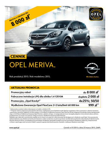 z riva e M do: m ate * rab ł z 0 0 0 8 Cennik OPEL MERIVA. Rok produkcji 2015 / Rok modelowy 2015. AKTUALNA PROMOCJA Promocyjny rabat Fabryczna instalacja LPG dla silnika 1.4 120 KM do 8 000 zł* dopłata 2 000 zł 4x25%; 50/50 Wydłużona Gwarancja Opel FlexCare 2+2 lata/limit 60 000 km 999 zł** Promocyjny „Opel Kredyt” * Maksymalna wysokość rabatu obowiązuje na modele z silnikiem LPG. ** Program ochrony pogwarancyjnej pojazdu oferowany i obsługiwany przez Dealerów marki Opel po wygaśnięciu okresu gwarancji o zakresie tożsamym z gwarancją, oferowany odpłatnie na okres podany w Certyfikacie Wydłużonej Gwarancji Opel FlexCare lub do osiągnięcia przebiegu maksymalnego podanego w Certyfikacie Wydłużonej Gwarancji Opel FlexCare, zależnie od tego, co nastąpi jako pierwsze. Szczegóły programu i inne warianty okresu ochrony przedstawiamy na stronie www.opel.pl / Usługi serwisowe / Wydłużona Gwarancja Opel FlexCare. Dokładny opis całej oferty promocyjnej znajduje się na stronie www.opel.pl w sekcji promocje lub dostępny jest u Dealerów marki Opel. Ceny promocyjne (rekomendowane ceny detaliczne brutto pomniejszone o rabat wymieniony na pierwszej stronie cennika) dotyczą klientów indywidualnych (detalicznych). Klientów flotowych (firmy i przedsiębiorstwa prowadzące działalność gospodarczą bądź instytucje prowadzące działalność społeczną, zarejestrowane w Polsce i rejestrujące auto na terenie Polski) w sprawie zapytań ofertowych prosimy o kontakt z wybranym Dealerem marki Opel. www.opel.pl Cennik nr 01/2015 z dnia 23 marca 2015, GMPL Cennik – Opel Meriva Rok produkcji 2015, rok modelowy 2015 Ceny promocyjne* Essentia Enjoy Design Edition Cosmo 1.4 (100 KM) M5 50 300 54 000 57 050 60 550 1.4 Turbo (120 KM) M5 54 150 57 850 60 900 64 400 1.4 Turbo (120 KM) Start/Stop M5 55 350 59 050 62 100 65 600 1.4 Turbo (120 KM) M6 55 050 58 750 61 800 65 300 1.4 Turbo (120 KM) A6 – 64 750 67 800 71 300 1.4 Turbo (120 KM) LPGTEC M5 – 59 850 62 900 66 400 1.4 Turbo (140 KM) M6 – 61 850 64 900 68 400 1.4 Turbo (140 KM) A6 – 68 750 71 800 75 300 1.6 CDTI (95 KM) ecoFLEX Start/Stop M5 62 700 66 400 69 450 72 950 1.6 CDTI (110 KM) Start/Stop M6 66 000 69 700 72 750 76 250 1.6 CDTI (136 KM) Start/Stop M6 74 100 77 150 80 650 – * Dokładny opis całej oferty promocyjnej znajduje się na stronie www.opel.pl w sekcji promocje lub dostępny jest u Dealerów marki Opel. Ceny promocyjne (rekomendowane ceny detaliczne brutto pomniejszone o rabat wymieniony na pierwszej stronie cennika) dotyczą klientów indywidualnych (detalicznych). Klientów flotowych (firmy i przedsiębiorstwa prowadzące działalność gospodarczą bądź instytucje prowadzące działalność społeczną, zarejestrowane w Polsce i rejestrujące auto na terenie Polski) w sprawie zapytań ofertowych prosimy o kontakt z wybranym Dealerem marki Opel. Ceny katalogowe Essentia Enjoy Design Edition Cosmo 1.4 (100 KM) M5 55 300 59 000 62 050 65 550 1.4 Turbo (120 KM) M5 59 150 62 850 65 900 69 400 1.4 Turbo (120 KM) Start/Stop M5 60 350 64 050 67 100 70 600 1.4 Turbo (120 KM) M6 60 050 63 750 66 800 70 300 1.4 Turbo (120 KM) A6 – 69 750 72 800 76 300 1.4 Turbo (120 KM) LPG M5 – 67 850 70 900 74 400 1.4 Turbo (140 KM) M6 – 66 850 69 900 73 400 1.4 Turbo (140 KM) A6 – 73 750 76 800 80 300 1.6 CDTI (95 KM) ecoFLEX Start/Stop M6 67 700 71 400 74 450 77 950 1.6 CDTI (110 KM) Start/Stop M6 71 000 74 700 77 750 81 250 1.6 CDTI (136 KM) Start/Stop M6 – 79 100 82 150 85 650 Cennik Opla Merivy, rok produkcji 2015, rok modelowy 2015, nr 01/2015 z dnia 23 marca 2015 1/4 Enjoy Design Edition Cosmo S S S S S S S S S S – S S S S S S S S S S S S S – – S S – S S S – S S S S S – – S S S S S S S S S S S S S S S S S S S S S S S S S S S S S S S S S S S S S 2 700 4 200 – – 700 – 1 500/P 1 400/P – – 750 500/P 850/P 500/P S S S S S – S S S S – 1 500/P 1 400/P – – 750 500/P 850/P 500/P S S S S S S 1 500 – – S S S S S S S S S S CFD D8G QN1 PWD RT1 N65 UGE 2 100 – – – – – – 400 – 2 100 – 2 950 3 200 700/P 5 700 – 400/P 1 000 2 100 500/P 2 950 3 200 – 1 500 2 000 400/P 1 000 2 100 – 2 950 3 200 – 3 000 3 500 400/P 1 000 TAAT – 6 500 6 500 6 500 J2O 800 800 800 800 J31 1 000 1 000 1 000 1 000 SR1 – 1 600 1 600 1 600 SRY – 2 100 2 100 2 100 KC8 DT4 – 50 100 50 100 50 100 50 Wyposażenie standardowe Essentia Tapicerka materiałowa czarna S TALE Układ stabilizacji toru jazdy ESP® z systemem Traction Control S FX3 System Hill Start Assist - wspomaganie ruszania na pochyłościach S KB5 Przednie poduszki powietrzne kierowcy i pasażera S AK5 Klimatyzacja sterowana ręcznie z układem recyrkulacji S C67 Radioodtwarzacz CD/MP3 300, 4 głośniki S UYB Elektrycznie sterowane szyby przednie S Elektrycznie sterowane i podgrzewane lusterka zewnętrzne S DLW/DG6 Zdalnie sterowany centralny zamek S Hamulec postojowy sterowany elektrycznie S Stalowe obręcze kół 15” (niedostępne z 1.6 CDTI) S/– PA7 –/S Stalowe obręcze kół 16” (w Essentia standard tylko z 1.6 CDTI) PY3 System monitorujący ciśnienie w oponach S UJM Tylne fotele z systemem składania i przesuwania FlexSpace® S Fotel kierowcy z regulacją w 6 kierunkach (wzdłużną, wysokości, pochylenia oparcia), fotel pasażera S AQ6 z regulacją w 4 kierunkach (wzdłużną, pochylenia oparcia) Kolumna kierownicy regulowana w pionie i poziomie S Tylne drzwi FlexDoors® z elektroniczną blokadą otwarcia w czasie jazdy S Uchwyty ISOFIX dla fotelików dziecięcych na tylnych zewnętrznych siedzeniach S Zderzaki w kolorze nadwozia S Boczne poduszki powietrzne kierowcy i pasażera 950 AJ7 Boczne poduszki powietrzne kierowcy i pasażera oraz kurtynowe poduszki powietrzne w obu rzędach 1 800/P AY0 siedzeń Aktywne zagłówki foteli przednich (w Essentii dostępne tylko z Pakietem Bezpieczeństwa) 400 AJF Komputer pokładowy (niedostępny z 1.4 Turbo LPG) – U68 Kieszenie z siatki oraz składane stoli