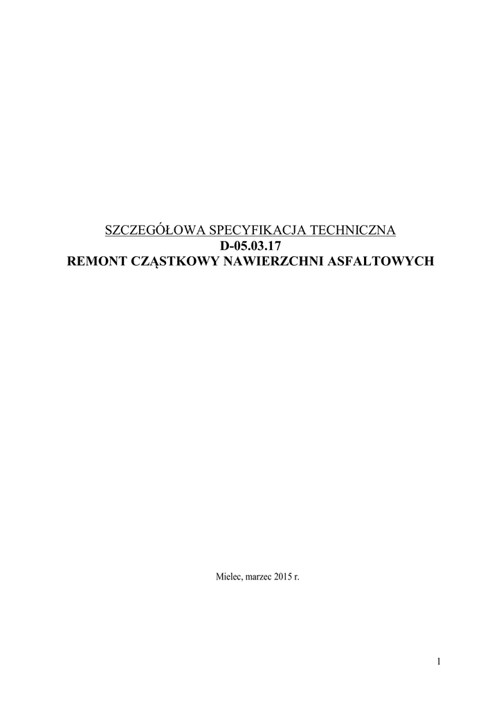 SZCZEGÓŁOWA SPECYFIKACJA TECHNICZNA D-05.03.17 REMONT CZĄSTKOWY NAWIERZCHNI ASFALTOWYCH Mielec, marzec 2015 r. 1 1. WSTĘP 1.1. Przedmiot SST Przedmiotem niniejszej szczegółowej specyfikacji technicznej (SST) są wymagania dotyczące wykonania i odbioru robót związanych z wykonywaniem remontu cząstkowego w ramach remontu nawierzchni asfaltowych na drogach gminnych na terenie Gminy Mielec. 1.2. Zakres stosowania specyfikacji Szczegółowa specyfikacja techniczna jest stosowana jako dokument przetargowy i kontraktowy przy zlecaniu i realizacji robót wymienionych w punkcie 1.1. 1.3. Zakres robót objętych specyfikacją Remont cząstkowy nawierzchni asfaltowych wykonywany jest na nawierzchniach asfaltowych wszystkich typów i rodzajów. 1.4. Określenia podstawowe 1.4.1 Remont cząstkowy nawierzchni asfaltowej – zbiorcze określenie obejmujące różne zabiegi techniczne do natychmiastowego wykonania związane z usuwaniem uszkodzeń zagrażających bezpieczeństwu ruchu, jak również zabiegi o małym zakresie (obejmujące małe powierzchnie) bez istotnego przywracania wartości użytkowych, lecz hamujące proces powiększania się pozostałych uszkodzeń bądź ich skutków. Przykłady: usuwanie głębokich powierzchniowych uszkodzeń (ubytków) nawierzchni (wybojów), uszczelnienie pojedynczych pęknięć, naprawa odłamanych krawędzi itp. 1.4.2 Ubytek – wykruszenie materiału mineralno-asfaltowego na głębokość nie większą niż grubość warstwy ścieralnej. 1.4.3 Wybój –wykruszenie materiału mineralno-asfaltowego na głębokość większą niż grubość warstwy ścieralnej. 1.4.4 Pozostałe określenia podstawowe są zgodne z obowiązującymi polskimi normami i definicjami podanymi w SST 05.03.05 i SST 05.07.15. 1.5. Ogólne wymagania dotyczące Robót Ogólne wymagania dotyczące robót podano w SST DM 00.00.00 „Wymagania ogólne” Wykonawca jest odpowiedzialny za jakość wykonania Robót oraz za ich zgodność z Umową, OPZ i SST i poleceniami Zamawiającego. Wprowadzenie jakichkolwiek odstępstw od tych dokumentów wymaga akceptacji Zamawiającego. 2. MATERIAŁY 2.1. Ogólne wymagania dotyczące materiałów Ogólne wymagania dotyczące materiałów, ich pozyskiwania i składowania, podano w D-M-00.00.00 „Wymagania ogólne” punkt 2. Wszystkie materiały składowe mma oraz pozostałe materiały stosowane do remontów cząstkowych winny posiadać deklaracje lub certyfikaty zgodności z Polską Normą. Dla materiałów, dla których nie ustalono Polskiej Normy deklaracje lub certyfikaty zgodności z Aprobatą Techniczną wydaną przez upoważnioną jednostkę. Do wytworzenia mieszanki do wykonania remontów cząstkowych z betonu asfaltowego, należy stosować materiały o odpowiednich właściwościach, stosownie do funkcji warstwy oraz założonej kategorii ruchu KR1 ÷ KR2, w której mma będzie wbudowywana, zgodne z normami. 2 Poszczególne rodzaje materiałów powinny pochodzić ze źródeł zatwierdzonych przez Przedstawiciela Zamawiającego Inżyniera/Inspektora Nadzoru. Należy dążyć do zaopatrzenia się w materiały z jednego źródła. W przypadku zmiany pochodzenia materiału należy, po wykonaniu odpowiednich badań, opracować skorygowaną receptę. Destrukt asfaltowy powstały podczas frezowania nawierzchni i/lub kora asfaltowa z rozbiórki nawierzchni w miejscu prowadzenia remontu cząstkowego nawierzchni, stanowi w całości własność Wykonawcy i należy go zagospodarować i zutylizować zgodnie z ustawą o odpadach i właściwymi przepisami ochrony środowiska. 2.2. Rodzaje materiałów do wykonywania cząstkowych remontów nawierzchni asfaltowych W zależności od wielkości i rodzaju uszkodzeń nawierzchni powinny być stosowane odpowiednie materiały i technologie usuwania tych uszkodzeń: a) Głębokie powierzchniowe uszkodzenia nawierzchni (ubytki i wyboje) oraz uszkodzenia krawędzi jezdni (obłamania) należy naprawiać jednym z niżej wymienionych materiałów: - mieszankami mineralno-bitumicznymi wytwarzanymi i wbudowywanymi na gorąco (z betonu asfaltowego), - techniką sprysku lepiszczem i natrysku pod ciśnieniem kruszywem lakierowanym o odpowiednim uziarnieniu wykonywaną remonterem do wykonywania napraw (remontów) cząstkowych nawierzchni grysem i modyfikowanym lepiszczem płynnym (modyfikowaną emulsją asfaltową) zapewniającym: oczyszczenie ubytku sprężonym powietrzem, spryskanie podgrzanym lepiszczem (emulsją asfaltową), otoczenie kruszywa (grysów) podgrzaną emulsją w głowicy roboczej, wypełnienie ubytku grysami lakierowanymi pod ciśnieniem zapewniającym ich wstępne zagęszczenie następnie pokrycie łaty warstwą suchego kruszywa (grysu). b) Powierzchniowe ubytki ziaren kruszywa lub zaprawy asfaltowej (lepiszcza) z warstwy ścieralnej powinny być naprawiane jednym z niżej wymienionych materiałów: - techniką spryskiwania lepiszczem i posypywania drobnoziarnistym kruszywem (zasada jednokrotnego powierzchniowego utrwalenia), - przy użyciu specjalnych maszyn (remonterów) natryskujących pod ciśnieniem jednocześnie kruszywo z modyfikowanym płynnym lepiszczem Remonty cząstkowe doraźne uszkodzeń nawierzchni zagrażających bezpieczeństwu, które trzeba usunąć pilnie w okresie zimy a nie ma możliwości wykonania remontu docelowego, wykonywane poprzez oczyszczenie ubytku z luźnych fragmentów nawierzchni i innych zanieczyszczeń oraz jego osuszenie, skropienie ubytku emulsją i wypełnienia mieszanką mineralno-asfaltową, wyrównanie i zagęszczenie. 2.2 Mieszanki mineralno-asfaltowe wytwarzane i wbudowywane na gorąco Projektowanie, wbudowywanie mieszanek mineralno-asfaltowych oraz kontrolę robót należy wykonywać zgodnie z SST D-05.03.05. Grubość układanych warstw nie powinna przekraczać 2,5 ÷ 3,0 krotności wymiaru największych ziaren mieszanki. Przy głębszych wybojach należy mieszankę wbudowywać warstwowo zgodnie z podaną wyżej zasadą lub naprawę na części głębokośc