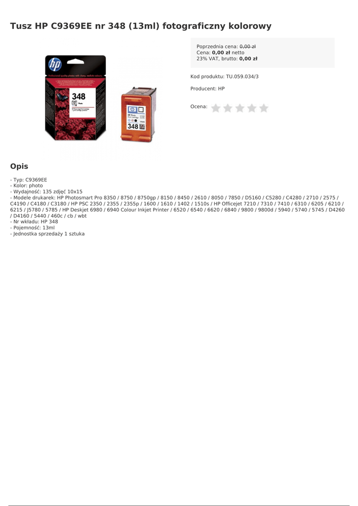 Tusz HP C9369EE nr 348 (13ml) fotograficzny kolorowy Poprzednia cena: 0,00 zł Cena: 0,00 zł netto 23% VAT, brutto: 0,00 zł Kod produktu: TU.059.034/3 Producent: HP Ocena: Opis - Typ: C9369EE - Kolor: photo - Wydajność: 135 zdjęć 10x15 - Modele drukarek: HP Photosmart Pro 8350 / 8750 / 8750gp / 8150 / 8450 / 2610 / 8050 / 7850 / D5160 / C5280 / C4280 / 2710 / 2575 / C4190 / C4180 / C3180 / HP PSC 2350 / 2355 / 2355p / 1600 / 1610 / 1402 / 1510s / HP Officejet 7210 / 7310 / 7410 / 6310 / 6205 / 6210 / 6215 / J5780 / 5785 / HP Deskjet 6980 / 6940 Colour Inkjet Printer / 6520 / 6540 / 6620 / 6840 / 9800 / 9800d / 5940 / 5740 / 5745 / D4260 / D4160 / 5440 / 460c / cb / wbt - Nr wkładu: HP 348 - Pojemność: 13ml - Jednostka sprzedaży 1 sztuka Powered by TCPDF (www.tcpdf.org)