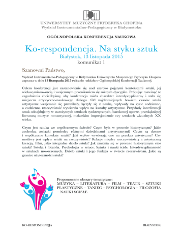 ! UNIWERSYTET MUZYCZNY FRYDERYKA CHOPINA Wydział Instrumentalno-Pedagogiczny w Białymstoku OGÓLNOPOLSKA KONFERENCJA NAUKOWA Ko-respondencja. Na styku sztuk Białystok, 13 listopada 2015 komunikat 1 Szanowni Państwo, Wydział Instrumentalno-Pedagogiczny w Białymstoku Uniwersytetu Muzycznego Fryderyka Chopina zaprasza w dniu 13 listopada 2015 roku do udziału w Ogólnopolskiej Konferencji Naukowej. Celem konferencji jest zastanowienie się nad szeroko pojętymi kontekstami sztuki, jej wielowymiarowością i wzajemnym przenikaniem się różnych dyscyplin. Próbując rozwinąć te zagadnienia chcielibyśmy, aby konferencja miała charakter interdyscyplinarny i stała się miejscem artystyczno-naukowego dialogu. Od najdawniejszych bowiem czasów sztuki artystyczne wzajemnie się przenikały, łączyły się z nauką, wpływały na życie codzienne, a codzienna rzeczywistość wywierała wpływ na kształty artystyczne. Przykłady interferencji sztuk odnajdujemy w starożytnych sztukach synkretycznych, barokowej operze, przesiąkniętej literaturą muzyce romantycznej, malarskim impresjonizmie czy sztukach wizualnych XX wieku. Czym jest sztuka we współczesnym świecie? Czym była w procesie historycznym? Jakie zachodzą związki pomiędzy różnymi dziedzinami artystycznymi? Czym są dawne i współczesne konteksty sztuki? Jaki wpływ wywierają one na przekaz artystyczny? Czy możliwy jest wpływ sztuki na rzeczywistość? Relacje między rzeczywistością a artystyczną kreacją. Film, jako integralne dzieło sztuki? Jak zmienia się w procesie historycznym etos sztuki? Sztuka i filozofia. Psychologia w sztuce. Sztuka i nauki ścisłe. Interdyscyplinarność w sztukach nowoczesnych. Dzieło sztuki i jego funkcja w świecie rzeczywistym. Jakie są granice użyteczności sztuki? Proponowane obszary tematyczne: MUZYKA – LITERATURA – FILM – TEATR – SZTUKI PLASTYCZNE – TANIEC – PSYCHOLOGIA – FILOZOFIA – NAUKI ŚCISŁE KO-RESPONDENCJA BIAŁYSTOK Proponowane bloki tematyczne: ¬ Omówienie szeroko pojętych kontekstów sztuki, ich wzajemnego przenikania się. ¬ Prezentacja sylwetek artystycznych oraz dorobku artystów, którzy wypowiadają się na styku różnych sztuk a ich dzieła powstają w wyniku inspiracji innymi dyscyplinami artystycznymi. ¬ Prezentacja oraz analiza interdyscyplinarnych dzieł sztuki. ¬ Sztuka i jej relacje z nauką. Socjologiczne, psychologiczne i filozoficzne aspekty sztuki. Przewiduje się także powstanie publikacji internetowej zawierającej poszczególne wykłady oraz przekazy dyskusji. Zgłoszenia uczestnictwa wraz z tematem wystąpienia i abstraktem prosimy nadsyłać na załączonej karcie udziału w konferencji do dnia 10 lipca 2015 roku na adres organizatorów: Uniwersytet Muzyczny Fryderyka Chopina Wydział Instrumentalno-Pedagogiczny w Białymstoku 15-324 Białystok, ul. Kawaleryjska 5 (z dopiskiem: Ko-respondencja, Ogólnopolska Konferencja Naukowa) oraz w formie elektronicznej na adres: [email protected] Informujemy, że kartę zgłoszeniową w formie elektronicznej można pobrać ze strony: chopin.man.bialystok.pl Opłata konferencyjna wynosi 250 zł i obejmuje: udział w konferencji, uroczystą kolację, materiały konferencyjne. Opłatę uczestnictwa należy przesłać najpóźniej do dnia 15 października 2015 roku na konto bankowe: Raiffeisen Bank Polska S. A. 72 1750 0009 0000 0000 1333 6202 dopiskiem: imię i nazwisko uczestnika, KO-RESPODNENCJA Ogólnopolska Konferencja Naukowa. Osoby, które chcą otrzymać fakturę, proszone są o podanie na adres [email protected] następujących danych: - imię i nazwisko - instytucja - NIP instytucji - adres instytucji Harmonogram Ogólnopolskiej Konferencji Naukowej: do 10.07.2015 - wstępne zgłoszenie uczestnictwa oraz tematu wystąpienia 15.07.2015 - kwalifikacja uczestników 5.10.2015 - kwalifikacja uzupełniająca do 15.10.2015 - wpłata opłaty konferencyjnej 30.10.2015 - komunikat nr 2 wraz z programem konferencji 13.11.2015 - pełny tekst wystąpienia (dwa egzemplarze, napisane w Word, rozmiar czcionki 12 i odstępy między wierszami 1,5 wraz z płytą CD) - w dniu obrad Gorąco zachęcamy do udziału i czekamy na Państwa zgłoszenia Kierownik Merytoryczny Konferencji dr Joanna Cieślik-Klauza KO-RESPODENCJA tel. 604 32 38 36 BIAŁYSTOK