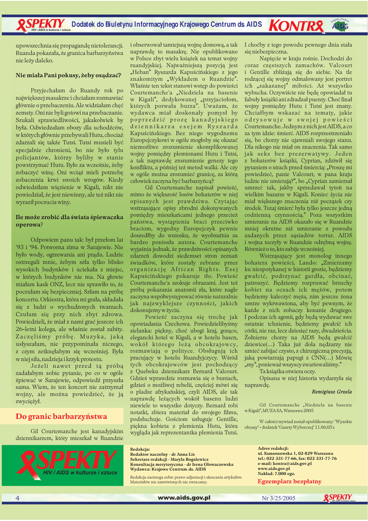 we Centrum ajo ds. Kr Dodatek do Biuletynu Informacyjnego Krajowego Centrum ds. AIDS HIV / AIDS w kulturze i sztuce upowszechnia się propagandę nietolerancji. Ruanda pokazała, że granica barbarzyństwa nie leży daleko. Nie miała Pani pokusy, żeby osądzać? Przyjechałam do Ruandy rok po największej masakrze i chciałam rozmawiać głównie o przebaczeniu. Ale widziałam chęć zemsty. Oni nie byli gotowi na przebaczanie. Szukali sprawiedliwości, jakakolwiek by była. Odwiedzałam obozy dla uchodźców, w których głównie przebywali Hutu, chociaż zdarzali się także Tutsi. Tutsi musieli być specjalnie chronieni, bo nie było tylu policjantów, którzy byliby w stanie powstrzymać Hutu. Było za wcześnie, żeby zobaczyć winę. Oni wciąż mieli potrzebę zobaczenia krwi swoich wrogów. Kiedy odwiedziłam więzienie w Kigali, nikt nie powiedział, że jest niewinny, ale też nikt nie wyraził poczucia winy. Ile może zrobić dla świata śpiewaczka operowa? Odpowiem panu tak: był przełom lat '93 i '94. Potworna zima w Sarajewie. Nie było wody, ogrzewania ani prądu. Ludzie ostrzegali mnie, żebym szła tylko blisko wysokich budynków i uciekała z miejsc, w których budynków nie ma. Na głowie miałam kask ONZ, lecz nie sprawiło to, że poczułam się bezpieczniej. Szłam na próbę koncertu. Orkiestra, która mi grała, składała się z ludzi o wychudzonych twarzach. Czułam się przy nich zbyt zdrowa. Powiedzieli, że miał z nami grać jeszcze ich 26-letni kolega, ale właśnie został zabity. Zaczęliśmy próbę. Muzyka, jaką usłyszałam, nie przypominała niczego, z czym zetknęłabym się wcześniej. Była w niej siła, nadzieja i krzyk protestu. Jeżeli nawet przed tą próbą zadałabym sobie pytanie, po co w ogóle śpiewać w Sarajewie, odpowiedź przyszła sama. Wiem, że ten koncert nie zatrzymał wojny, ale można powiedzieć, że ją zwyciężył. Do granic barbarzyństwa Gil Courtemanche jest kanadyjskim dziennikarzem, który mieszkał w Ruandzie HIV / AIDS w kulturze i sztuce i obserwował tamtejszą wojnę domową, a tak naprawdę to masakrę. Nie opublikowano w Polsce zbyt wielu książek na temat wojny ruandyjskiej. Najważniejszą pozycją jest „Heban” Ryszarda Kapuścińskiego z jego znakomitym „Wykładem o Ruandzie”. Właśnie ten tekst stanowi wstęp do powieści Courtemanche'a „Niedziela na basenie w Kigali”, dedykowanej „przyjaciołom, których porwała burza”. Uważam, że wydawca miał doskonały pomysł by poprzedzić prozę kanadyjskiego dziennikarza esejem Ryszarda Kapuścińskiego. Bez niego wygodnemu Europejczykowi w ogóle mogłoby się okazać niemożliwe zrozumienie skomplikowanej wojny pomiędzy plemionami Hutu i Tutsi, a tak naprawdę zrozumienie genezy tego konfliktu, a później też metod walki. Ale czy w ogóle można zrozumieć granicę, za którą człowiek zaczyna być barbarzyńcą? Gil Courtemanche napisał powieść, mimo że większość losów bohaterów w niej opisanych jest prawdziwa. Czytając wstrząsające opisy zbrodni dokonywanych pomiędzy mieszkańcami jednego przecież państwa, wystąpienia braci przeciwko braciom, wygodny Europejczyk pewnie doszedłby do wniosku, że wyobraźnia za bardzo poniosła autora. Courtemanche wyjaśnia jednak, że prawdziwości opisanych zdarzeń dowodzi siedemset stron zeznań świadków, które zostały zebrane przez organizację African Rights. Esej Kapuścińskiego pokazuje tło. Powieść Courtemanche'a szokuje obrazami. Jest też próbą pokazania anatomii zła, które nagle zaczyna współwystępować równie naturalnie jak najzwyklejsze czynności, jakich dokonujemy w życiu. Powieść zaczyna się trochę jak opowiadania Czechowa. Powiedzielibyśmy sielanka: piękny, choć ubogi kraj, gorąco, elegancki hotel w Kigali, a w hotelu basen, wokół którego leżą obcokrajowcy, rozmawiają o polityce. Obsługują ich pracujący w hotelu Ruandyjczycy. Wśród tych obcokrajowców jest pochodzący z Quebeku dziennikarz Bernard Valcourt. Gdzieś wprawdzie rozmawia się o buntach, gdzieś o możliwej rebelii, częściej mówi się o pladze afrykańskiej, czyli AIDS, ale tak naprawdę leżących wokół basenu ludzi niewiele to wszystko dotyczy. Bernard robi notatki, zbiera materiał do swojego filmu, podsłuchuje. Gościom usługuje Gentille, piękna kobieta z plemienia Hutu, która wygląda jak reprezentantka plemienia Tutsi. Redakcja: Redaktor naczelny - dr Anna Lis Sekretarz redakcji - Maryla Rogalewicz Konsultacja merytoryczna - dr Irena Głowaczewska Wydawca: Krajowe Centrum ds. AIDS Redakcja zastrzega sobie prawo adjustacji i skracania artykułów. Materiałów nie zamówionych nie zwracamy. 4 www.aids.gov.pl I choćby z tego powodu pewnego dnia stała się niebezpieczna. Napięcie w kraju rośnie. Dochodzi do coraz częstszych zamachów. Valcourt i Gentille zbliżają się do siebie. Na tle rodzącej się wojny odmalowany jest portret ich „zakazanej” miłości. Aż wszystko wybucha. Oczywiście nie będę opowiadał tu fabuły książki ani zdradzał puenty. Choć finał wojny pomiędzy Hutu i Tutsi jest znany. Chciałbym wskazać na tematy, jakie odrysowuje w swojej powieści Courtemanche. Jednym z nich jest AIDS, a co za tym idzie: śmierć. AIDS rozprzestrzeniało się, bo chorzy nie ujawniali swojego stanu. Dla nikogo nie miał on znaczenia. Tak samo jak seks bez prezerwatywy. Jeden z bohaterów książki, Cyprian, zdziwił się pytaniem o strach przed śmiercią: „Proszę mi powiedzieć, panie Valcourt, w pana kraju ludzie nie umierają?”, bo „Cyprian zamierzał umrzeć tak, jakby sprzedawał tytoń na wielkim bazarze w Kigali. Koniec życia nie miał większego znaczenia niż początek czy środek. Tutaj śmierć była tylko jeszcze jedną codzienną czynnością.” Poza wszystkim umieranie na AIDS okazało się w Ruandzie mniej okrutne niż umieranie z powodu zadanych przez sąsiadów tortur. AIDS i wojna toczyły w Ruandzie odrębną woj