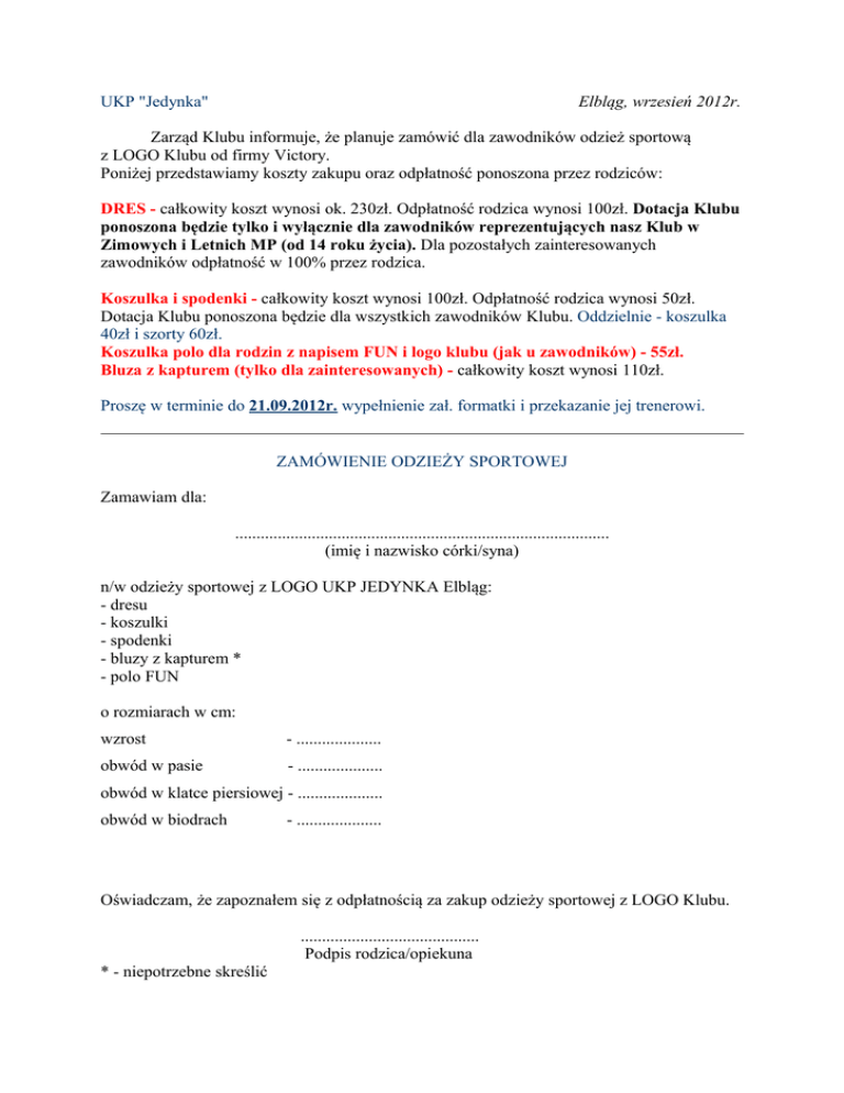 UKP "Jedynka" Elbląg, wrzesień 2012r. Zarząd Klubu informuje, że planuje zamówić dla zawodników odzież sportową z LOGO Klubu od firmy Victory. Poniżej przedstawiamy koszty zakupu oraz odpłatność ponoszona przez rodziców: DRES - całkowity koszt wynosi ok. 230zł. Odpłatność rodzica wynosi 100zł. Dotacja Klubu ponoszona będzie tylko i wyłącznie dla zawodników reprezentujących nasz Klub w Zimowych i Letnich MP (od 14 roku życia). Dla pozostałych zainteresowanych zawodników odpłatność w 100% przez rodzica. Koszulka i spodenki - całkowity koszt wynosi 100zł. Odpłatność rodzica wynosi 50zł. Dotacja Klubu ponoszona będzie dla wszystkich zawodników Klubu. Oddzielnie - koszulka 40zł i szorty 60zł. Koszulka polo dla rodzin z napisem FUN i logo klubu (jak u zawodników) - 55zł. Bluza z kapturem (tylko dla zainteresowanych) - całkowity koszt wynosi 110zł. Proszę w terminie do 21.09.2012r. wypełnienie zał. formatki i przekazanie jej trenerowi. ZAMÓWIENIE ODZIEŻY SPORTOWEJ Zamawiam dla: ........................................................................................ (imię i nazwisko córki/syna) n/w odzieży sportowej z LOGO UKP JEDYNKA Elbląg: - dresu - koszulki - spodenki - bluzy z kapturem * - polo FUN o rozmiarach w cm: wzrost - .................... obwód w pasie - .................... obwód w klatce piersiowej - .................... obwód w biodrach - .................... Oświadczam, że zapoznałem się z odpłatnością za zakup odzieży sportowej z LOGO Klubu. .......................................... Podpis rodzica/opiekuna * - niepotrzebne skreślić