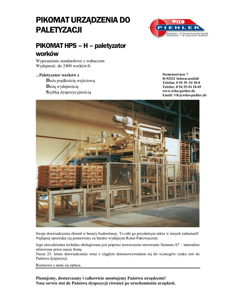 PIKOMAT URZĄDZENIA DO PALETYZACJI PIKOMAT HPS – H – paletyzator worków Wyposażenie standardowe z wahaczem Wydajność: do 2400 worków/h ...Paletyzator worków z Duża prędkością wejściową Dużą wydajnością Szybką dyspozycyjnością Siemensstrasse 7 D-92521 Schwarzenfeld Telefon: 0 94 35–54 18-0 Telefax: 0 94 35-54 18-49 www.wiko-piehler.de Email: [email protected] Swoje doświadczenia zbierał w branży budowlanej. To robi go przydatnym także w innych zadaniach! Najlepiej sprawdza się postawiony za bardzo wydajnym Rotor-Pakowaczem. Jego niecodzienna technika obsługiwana jest poprzez nowoczesne sterowanie Siemens-S7 – naturalnie oferowane przez nasza firmę. Nasze 25- letnie doświadczenie wraz z ciągłym dostosowywaniem się do wymogów rynku stoi do Państwa dyspozycji. Rozmowa z nami się opłaca. Planujemy, dostarczamy i całkowicie montujemy Państwa urządzenie! Nasz serwis stoi do Państwa dyspozycji również po uruchomieniu urządzeń. PIKOMAT HPS-HPaletyzator worków Wydajność: do 2400 worków/h Magazyn: 20/40/60 Europalet Szczególne cechy: Podwójna taśma Nacisk górny 1 t Sterowanie Siemens S7 Napędy sterowane częstotliwościowo Napęd pasami zębatymi Wygodna obsługa Żądajcie szczegółowych danych. WIKO-PIEHLER Palettier-& Fördertechnik GmbH Siemensstraße 7 D- 92521 Schwarzenfeld Telefon: (0 94 35) 54 18–0 Telefax: (0 94 35) 54 18–49 http://www.wiko-piehler.de Email: [email protected]