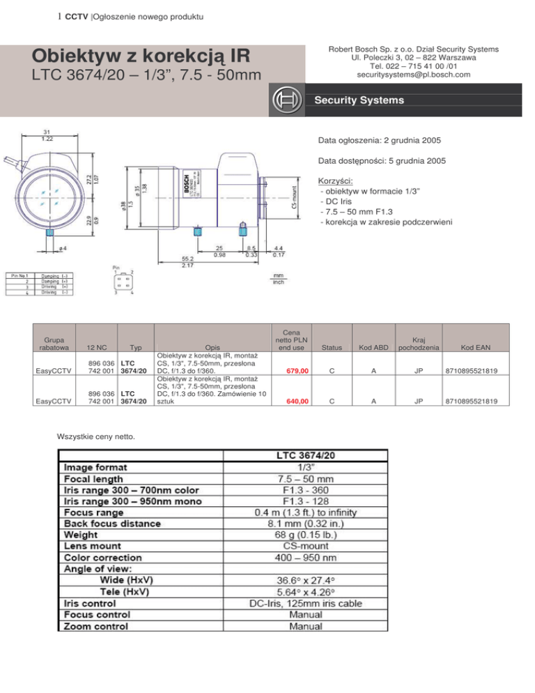 1 CCTV |Ogłoszenie nowego produktu Robert Bosch Sp. z o.o. Dział Security Systems Ul. Poleczki 3, 02 – 822 Warszawa Tel. 022 – 715 41 00 /01 [email protected] Obiektyw z korekcj IR LTC 3674/20 – 1/3”, 7.5 - 50mm Security Systems Data ogłoszenia: 2 grudnia 2005 Data dost pno ci: 5 grudnia 2005 Korzy ci: - obiektyw w formacie 1/3” - DC Iris - 7.5 – 50 mm F1.3 - korekcja w zakresie podczerwieni Grupa rabatowa 12 NC Typ EasyCCTV 896 036 LTC 742 001 3674/20 EasyCCTV 896 036 LTC 742 001 3674/20 Wszystkie ceny netto. Opis Obiektyw z korekcj IR, monta CS, 1/3", 7.5-50mm, przesłona DC, f/1.3 do f/360. Obiektyw z korekcj IR, monta CS, 1/3", 7.5-50mm, przesłona DC, f/1.3 do f/360. Zamówienie 10 sztuk Cena netto PLN end use Status Kod ABD Kraj pochodzenia 679,00 C A JP 8710895521819 640,00 C A JP 8710895521819 Kod EAN