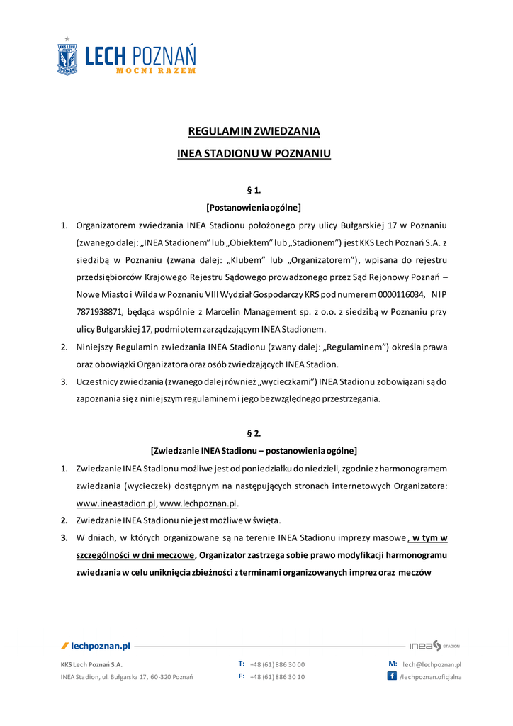 REGULAMIN ZWIEDZANIA INEA STADIONU W POZNANIU § 1. [Postanowienia ogólne] 1. Organizatorem zwiedzania INEA Stadionu położonego przy ulicy Bułgarskiej 17 w Poznaniu (zwanego dalej: „INEA Stadionem” lub „Obiektem” lub „Stadionem”) jest KKS Lech Poznań S.A. z siedzibą w Poznaniu (zwana dalej: „Klubem” lub „Organizatorem”), wpisana do rejestru przedsiębiorców Krajowego Rejestru Sądowego prowadzonego przez Sąd Rejonowy Poznań – Nowe Miasto i Wilda w Poznaniu VIII Wydział Gospodarczy KRS pod numerem 0000116034, NIP 7871938871, będąca wspólnie z Marcelin Management sp. z o.o. z siedzibą w Poznaniu przy ulicy Bułgarskiej 17, podmiotem zarządzającym INEA Stadionem. 2. Niniejszy Regulamin zwiedzania INEA Stadionu (zwany dalej: „Regulaminem”) określa prawa oraz obowiązki Organizatora oraz osób zwiedzających INEA Stadion. 3. Uczestnicy zwiedzania (zwanego dalej również „wycieczkami”) INEA Stadionu zobowiązani są do zapoznania się z niniejszym regulaminem i jego bezwzględnego przestrzegania. § 2. [Zwiedzanie INEA Stadionu – postanowienia ogólne] 1. Zwiedzanie INEA Stadionu możliwe jest od poniedziałku do niedzieli, zgodnie z harmonogramem zwiedzania (wycieczek) dostępnym na następujących stronach internetowych Organizatora: www.ineastadion.pl, www.lechpoznan.pl. 2. Zwiedzanie INEA Stadionu nie jest możliwe w święta. 3. W dniach, w których organizowane są na terenie INEA Stadionu imprezy masowe , w tym w szczególności w dni meczowe, Organizator zastrzega sobie prawo modyfikacji harmonogramu zwiedzania w celu uniknięcia zbieżności z terminami organizowanych imprez oraz meczów KKS Lech Poznań S.A. T: +48 (61) 886 30 00 M: [email protected] INEA Stadion, ul. Bułgarska 17, 60-320 Poznań F: +48 (61) 886 30 10 /lechpoznan.oficjalna 4. Zwiedzanie INEA Stadionu rozpoczyna się w Oficjalnym Sklepie Lecha Poznań – Stacji Kol e jorz, mieszczącym się na IV trybunie INEA Stadionu. Uczestnicy mogą pozostawić swoje pojazdy na bezpłatnym parkingu A z wjazdem od ulicy Ptasiej. 5. Wycieczki odbywają się dla co najmniej dwóch osób zainteresowanych. Maksymalna liczba zwiedzających w ramach jednej grupy to 50 (pięćdziesiąt) osób. 6. Organizator zastrzega sobie możliwość zmian dni dostępnych dla zwiedzających, godzin zwiedzania, jak również częstotliwości i sposobu organizacji wycieczek, trasy wycieczki, a także zamknięcia obiektu bez podania przyczyny. § 3. [Zasady zwiedzania INEA Stadionu] 1. Wszystkie osoby biorące udział w zwiedzaniu INEA Stadionu w Poznaniu zobowiązane są do podporządkowania się w trakcie zwiedzania poleceniom przewodnika i innych pracowników obiektu lub Klubu. 2. Zwiedzanie odbywa się po wyznaczonej trasie, zabrania się samodzielnego oddalania od grupy i przechodzenia w miejsca niedozwolone. 3. Na terenie obiektu zakazane jest palenie tytoniu oraz spożywanie napojów alkoholowych, a także wprowadzanie zwierząt (z wyłączeniem psów przewodników). Pracownicy Klubu mogą odmówić wstępu na Stadion lub usunąć osobę zwiedzającą z terenu Stadionu w przypadku naruszenia przez osobę zwiedzającą któregokolwiek z postanowień niniejszego Regulaminu l ub w innej uzasadnionej sytuacji, w tym z uwagi na konieczność zapewnienia bezpie czeństwa l ub porządku. W szczególności powyższe dotyczy osób: a) znajdujących się pod wpływem alkoholu, środków odurzających lub innych podobnie działających substancji; b) posiadających broń lub inne przedmioty, które w jakikolwiek sposób mogą zagrażać osobom przebywającym na Stadionie; c) zachowujących się agresywnie, prowokacyjnie lub w inny sposób stwarzających zagroże nie dla bezpieczeństwa lub porządku na Stadionie. 4. Organizator informuje, że INEA Stadion jest na bieżąco monitorowany przez system monitoringu wizyjnego (CCTV). KKS Lech Poznań S.A. T: +48 (61) 886 30 00 M: [email protected] INEA Stadion, ul. Bułgarska 17, 60-320 Poznań F: +48 (61) 886 30 10 /lechpoznan.oficjalna 5. Robienie zdjęć podczas wycieczki możliwe jest wyłącznie na niekomercyjny użytek własny, z zastrzeżeniem ust. 5 poniżej. Zabrania się filmowania i wykorzystania zrobionych fotografi i do celów komercyjnych. 6. Organizator może zarządzić całkowity zakaz filmowania i fotografowania Stadionu, bez podania przyczyny. 7. Dzieci do lat 13 mogą uczestniczyć w wycieczce tylko i wyłącznie pod opieką osób dorosłych. 8. O wszelkich nieprawidłowościach zauważonych w trakcie zwiedzania należy poinformować przewodnika. 9. Odwiedzający w trakcie zwiedzania zobowiązani są do wykonywania poleceń przewodnika również w sprawach nieobjętych niniejszym regulaminem, dotyczących bezpieczeństwa i organizacji zwiedzania. 10. Niestosowanie się do powyższych przepisów skutkować będzie usunięciem z wycieczki. 11. W przypadku przybycia grupy posiadającej rezerwacje grupową do 15 (piętnastu) minut późni ej niż planowana godzina rozpoczęcia zwiedzania przy jednoczesnym zgłoszeniu spóźnienia, zwiedzanie zostaje skrócone o czas spóźnienia. 12. W przypadku jeśli spóźnienie jest dłuższe niż 15 (piętnaście) minut termin zwiedzania zostaje anulowany i wycieczka nie odbywa się. 13. Zabrania się wchodzenia na murawę (płytę główną boiska) INEA Stadionu. W przypadku wejścia na płytę główną boiska INEA Stadionu organizator ma prawo nałożyć na wchodzącego karę w wysokości 4.000,00 (cztery tysiące) złotych. § 4. [Zasady sprzedaży i ceny biletów] 1. Sprzedaż biletów prowadzona jest przez Organizatora. 2. Zakup Biletu oznacza akceptację niniejszego Regulaminu, a także Regulaminu INEA Stadionu , dostępnego na oficjalnej stronie Organizatora. 3. Nabywcą Biletu może być osoba fizyczna posiadająca ograniczoną albo pełną zdolność do czynności prawnych, osoba prawna lub jednostka organizacyjna nieposiadająca osobowości prawnej ale posiadająca zdolność do czynności prawnych.