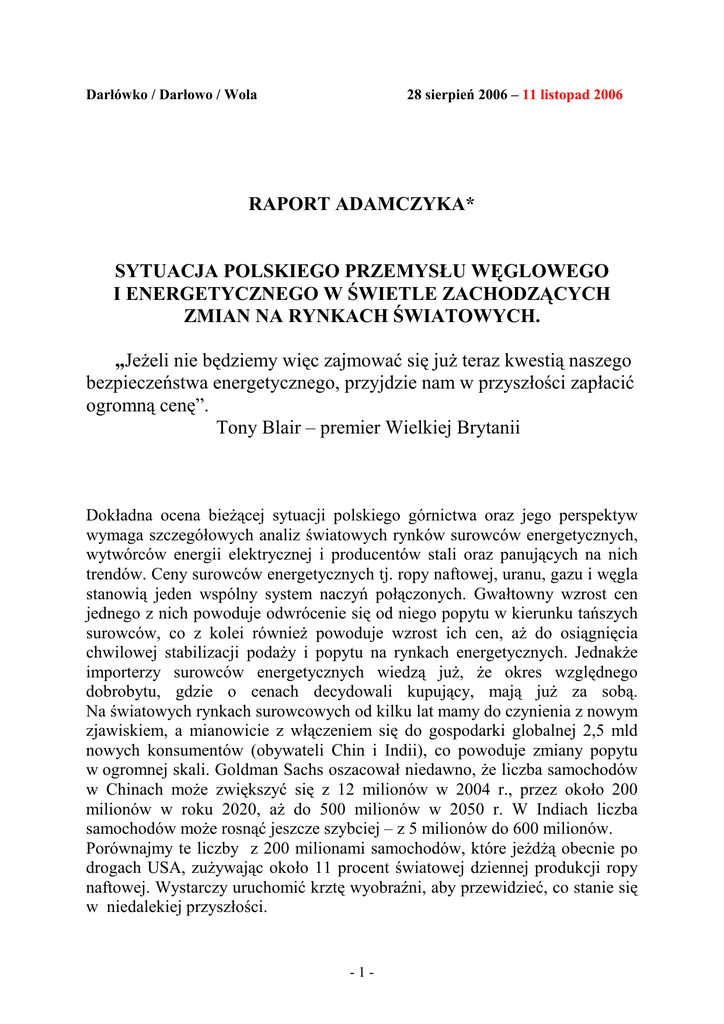 Darłówko / Darłowo / Wola 28 sierpień 2006 – 11 listopad 2006 RAPORT ADAMCZYKA* SYTUACJA POLSKIEGO PRZEMYSŁU WĘGLOWEGO I ENERGETYCZNEGO W ŚWIETLE ZACHODZĄCYCH ZMIAN NA RYNKACH ŚWIATOWYCH. „JeŜeli nie będziemy więc zajmować się juŜ teraz kwestią naszego bezpieczeństwa energetycznego, przyjdzie nam w przyszłości zapłacić ogromną cenę”. Tony Blair – premier Wielkiej Brytanii Dokładna ocena bieŜącej sytuacji polskiego górnictwa oraz jego perspektyw wymaga szczegółowych analiz światowych rynków surowców energetycznych, wytwórców energii elektrycznej i producentów stali oraz panujących na nich trendów. Ceny surowców energetycznych tj. ropy naftowej, uranu, gazu i węgla stanowią jeden wspólny system naczyń połączonych. Gwałtowny wzrost cen jednego z nich powoduje odwrócenie się od niego popytu w kierunku tańszych surowców, co z kolei równieŜ powoduje wzrost ich cen, aŜ do osiągnięcia chwilowej stabilizacji podaŜy i popytu na rynkach energetycznych. JednakŜe importerzy surowców energetycznych wiedzą juŜ, Ŝe okres względnego dobrobytu, gdzie o cenach decydowali kupujący, mają juŜ za sobą. Na światowych rynkach surowcowych od kilku lat mamy do czynienia z nowym zjawiskiem, a mianowicie z włączeniem się do gospodarki globalnej 2,5 mld nowych konsumentów (obywateli Chin i Indii), co powoduje zmiany popytu w ogromnej skali. Goldman Sachs oszacował niedawno, Ŝe liczba samochodów w Chinach moŜe zwiększyć się z 12 milionów w 2004 r., przez około 200 milionów w roku 2020, aŜ do 500 milionów w 2050 r. W Indiach liczba samochodów moŜe rosnąć jeszcze szybciej – z 5 milionów do 600 milionów. Porównajmy te liczby z 200 milionami samochodów, które jeŜdŜą obecnie po drogach USA, zuŜywając około 11 procent światowej dziennej produkcji ropy naftowej. Wystarczy uruchomić krztę wyobraźni, aby przewidzieć, co stanie się w niedalekiej przyszłości. -1- Czy mają tę wyobraźnię obecnie rządzący polscy decydenci, czy teŜ wolą postępować jak ich niechlubni poprzednicy i pozwolą sprywatyzować sektor energetyczno – węglowy w przededniu jego wielkiego wzrostu wartości ? Tę wyobraźnię posiadał Hindus Lakshmi Mittal ( obecnie jeden z najbogatszych ludzi na świecie ), kiedy w przededniu nastania koniunktury na stal kupował za bezcen od rządu Leszka Milera „PHS” SA ( Polskie Huty Stali ) zarabiając na tym kilka miliardów złotych w ciągu roku. Tę wyobraźnię posiadają równieŜ potencjalni inwestorzy zainteresowani przejęciem polskich kopalń ( w tym równieŜ tych nieczynnych ) w sytuacji, gdy Ministerstwo Gospodarki twierdzi, Ŝe perspektywy dla węgla są nie najlepsze ( patrz najnowsza strategia ). To wielki paradoks. Problem wystarczalności światowych zasobów podstawowych nośników energii pierwotnej węgiel brunatny węgiel kamienny gaz ziemny ropa naftowa uran 0 50 100 150 200 250 300 lata JuŜ obecnie za popytem na surowce energetyczne nie nadąŜa podaŜ, a świadomość, Ŝe kończą się zasoby ropy naftowej (30-40 lat), uranu (ok.40 lat), gazu (ok.60 lat)[1], podbija ceny tych surowców do nie notowanych do tej pory poziomów, np. ropy naftowej pow. 70 $ / baryłkę. Doskonale ten problem obrazuje „Krzywa Hubberta” zamieszczona na wykresie usytuowanym poniŜej: pokazuje ona, Ŝe wydobycie ropy naftowej osiągnie w pewnym momencie swoje apogeum, po czym następować będzie stały spadek ilości ropy naftowej pojawiającej się na rynkach światowych. Mniejsza podaŜ, przy stale rosnącym popycie, spowoduje oczywiście trwałe wzrosty cen tego surowca. Punkt zwrotny, czyli spadek produkcji ropy, ma nastąpić około roku 2010. Według Financial Times ropa naftowa do roku 2030 w wartościach realnych zdroŜeje o ok.100 %. -2- Z analizy obydwu wykresów wynika, Ŝe światowy szczyt odkryć miał miejsce na początku lat 60-tych, a aktualne odkrycia stanowią jedynie nikły fragment tych z przeszłości. Według artykułu Colina Campbella i Jean Laherrere „Koniec taniej ropy”( 1998, Scientific American), około 80% ropy produkowanej dziś pochodzi z pól odkrytych ponad 30 lat temu i większość z nich jest juŜ dość daleko za swoim -3- szczytem produkcji. Obecnie 54 spośród 65 państw-producentów ropy przekroczyło lub znajduje się w fazie szczytu wydobycia. Co jakiś czas z grona organizacji państw- producentów ropy naftowej OPEC wypada kolejne państwo, które z producenta-eksportera staje się importerem (ostatnio była to Indonezja) PowyŜsze dane skłoniły światowych decydentów gospodarczych do podjęcia decyzji czyniących węgiel podstawowym surowcem energetycznym. I tak w krajach Azji Pd.- wsch. do 2015 roku wybuduje się aŜ 500 elektrowni węglowych spalających corocznie ok. 1 mld ton węgla. W samych Chinach wydobycie węgla wzrośnie z około 2,2 mld ton w 2005 roku do 3,2 mld ton w 2020 roku. W krótkim czasie tj. do 2010 roku Chiny wybudują nowe elektrownie węglowe wymagające dodatkowych dostaw rzędu 200 mln ton węgla w skali roku, a Indie wybudują elektrownie węglowe o mocy 35 tys. MW spalające rocznie ponad 70 mln ton węgla. Z kolei w Stanach Zjednoczonych do 2025 roku wybuduje się ponad 135 elektrowni węglowych. RównieŜ nasi sąsiedzi Niemcy nie siedzą z załoŜonymi rękoma i podjęli juŜ decyzje o budowie do 2025 roku elektrowni węglowych o mocy 40 tys MW.[2] W Europie podjęto decyzje o budowie nowych elektrowni węglowych w Niemczech, Holandii i we Włoszech, a ostatnio takŜe w Anglii i „atomowej” Francji. Na Węgrzech buduje się 2 nowe kopalnie węgla kamiennego, a Zdenek Bakala (najbogatszy Czech), współwłaściciel OKD wobec niemoŜności kupna Jastrzębskiej Spółki Węglowej SA i kopalni „Budryk” w „akcie rozpaczy” kupił starą kopalnię na Węgrzech i ją reaktywuje. Jesteśmy chyba jedynym krajem na świecie, który w obliczu niezaprzeczalnych faktów gospodarczych wskazujących na wzrost 