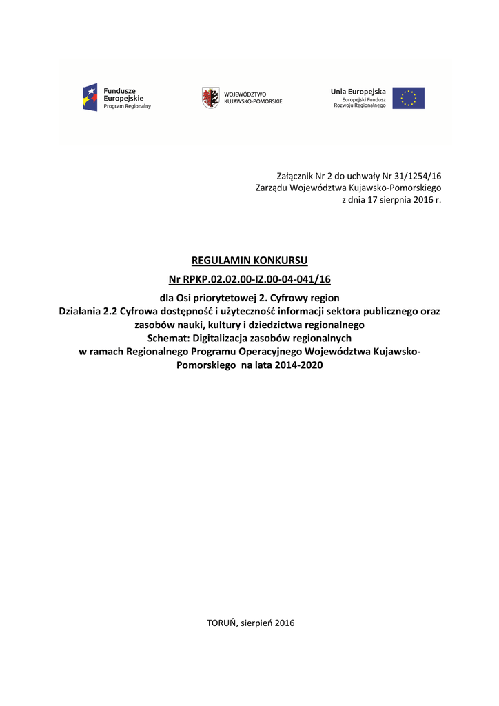 Załącznik Nr 2 do uchwały Nr 31/1254/16 Zarządu Województwa Kujawsko-Pomorskiego z dnia 17 sierpnia 2016 r. REGULAMIN KONKURSU Nr RPKP.02.02.00-IZ.00-04-041/16 dla Osi priorytetowej 2. Cyfrowy region Działania 2.2 Cyfrowa dostępność i użyteczność informacji sektora publicznego oraz zasobów nauki, kultury i dziedzictwa regionalnego Schemat: Digitalizacja zasobów regionalnych w ramach Regionalnego Programu Operacyjnego Województwa KujawskoPomorskiego na lata 2014-2020 TORUŃ, sierpień 2016 Wykaz stosowanych skrótów EFRR Europejski Fundusz Rozwoju Regionalnego GWD Generator Wniosków o Dofinansowanie Instytucja Zarządzająca RPO/ IZ RPO Instytucja Zarządzająca Regionalnym Programem Operacyjnym Województwa Kujawsko-Pomorskiego na lata 2014-2020 IOK Instytucja Organizująca Konkurs KOP Komisja Oceny Projektów MIiR Minister Infrastruktury i Rozwoju (obecnie Minister Rozwoju) RPO WK-P 2014-2020 Regionalny Program Operacyjny Województwa KujawskoPomorskiego na lata 2014-2020 System oceny projektów System oceny projektów w ramach Regionalnego Programu Operacyjnego Województwa Kujawsko-Pomorskiego na lata 2014-2020 SzOOP Szczegółowy Opis Osi Priorytetowych Regionalnego Programu Operacyjnego Województwa Kujawsko-Pomorskiego na lata 2014-2020 Wniosek o dofinansowanie projektu Wniosek o dofinansowanie projektu z Europejskiego Funduszu Rozwoju Regionalnego w ramach Regionalnego Programu Operacyjnego Województwa Kujawsko-Pomorskiego na lata 2014-2020 Zarząd Województwa Zarząd Województwa Kujawsko-Pomorskiego 2 SPIS TREŚCI Rozdział 1. Czym jest Regulamin konkursu? .................................................................................... 4 Rozdział 2. Podstawa prawna, dokumenty programowe oraz kwalifikowalność wydatków w ramach projektu ............................................................................................................................... 4 Rozdział 3. Podstawowe informacje dotyczące konkursu ............................................................... 8 Podrozdział 3.1. Nazwa i adres instytucji organizującej konkurs ............................................. 8 Podrozdział 3.2. Przedmiot konkursu....................................................................................... 9 Podrozdział 3.3. Typy projektów .............................................................................................. 9 Podrozdział 3.4. Typ beneficjenta ............................................................................................ 9 Podrozdział 3.5. Kwota przeznaczona na dofinansowanie projektów w konkursie ................ 9 Podrozdział 3.6. Limity dotyczące wartości projektu oraz wysokości dofinansowania ......... 10 Podrozdział 3.8. Planowany termin rozstrzygnięcia konkursu .............................................. 10 Podrozdział 3.9. Wskaźniki produktu i rezultatu.................................................................... 10 Podrozdział 3.10. Anulowanie konkursu ................................................................................ 13 Rozdział 4. Termin, miejsce i forma składania wniosków o dofinansowanie projektu. ................ 13 Rozdział 5. Kryteria wyboru projektów wraz z podaniem ich znaczenia ....................................... 16 Podrozdział 5.1. Odniesienie wnioskodawcy do wybranych kryteriów wyboru projektów .. 16 Podrozdział 5.2. Wyjaśnienie dotyczące wybranych kryteriów wyboru projektów .............. 17 Rozdział 6. Etapy weryfikacji i wybór projektów do dofinansowania ............................................ 17 Podrozdział 6.1. Badanie wymogów formalnych ................................................................... 18 Podrozdział 6.2. Etap oceny formalno-merytorycznej ........................................................... 19 Podrozdział 6.3. Rozstrzygnięcie konkursu ............................................................................ 21 Podrozdział 6.4. Lista rezerwowa ........................................................................................... 22 Rozdział 7. Środki odwoławcze przysługujące wnioskodawcy....................................................... 23 Rozdział 8. Umowa o dofinansowanie projektu ............................................................................ 24 Rozdział 9. Forma i sposób udzielania wnioskodawcy wyjaśnień w kwestiach dotyczących konkursu ......................................................................................................................................... 25 Rozdział 10. Załączniki do Regulaminu konkursu ........................................................................... 26 3 Rozdział 1. Czym jest Regulamin konkursu? Regulamin konkursu określa zakres konkursu, zasady jego organizacji, warunki uczestnictwa, kryteria i sposób wyboru projektów, a także pozostałe informacje niezbędne podczas przygotowywania dokumentacji projektowej. W sprawach nieuregulowanych w niniejszym Regulaminie1 zastosowanie mają odpowiednie zasady wynikające z RPO WK-P 2014-2020, SzOOP, Systemu oceny projektów (dostępnych na stronie internetowej www.rpo.kujawsko-pomorskie.pl w zakładce: „zapoznaj się z prawem i dokumentami” oraz pod ogłoszeniem o konkursie), a także z odpowiednich przepisów prawa unijnego i krajowego. Rozdział 2. Podstawa prawna, dokumenty programowe oraz kwalifikowalność wydatków w ramach projektu 1. Podstawa prawna, w szczególności: 1) Rozporządzenie Parlamentu Europejskiego i Rady (UE) nr 1303/2013 z dnia 17 grudnia 2013 r. ustanawiające wspólne przepisy dotyczące Europejskiego Funduszu Rozwoju Regionalnego, Europejskiego Funduszu Społecznego, Funduszu Spójności, Europejskiego Funduszu Rolnego na rzecz Rozwoju Obszarów Wiejskich oraz Europejskiego Funduszu Morskiego i Rybackiego oraz ustanawiające przepisy ogólne dotyczące Europejskiego Funduszu Rozwoju Regionalnego, Europejskiego Funduszu Społ
