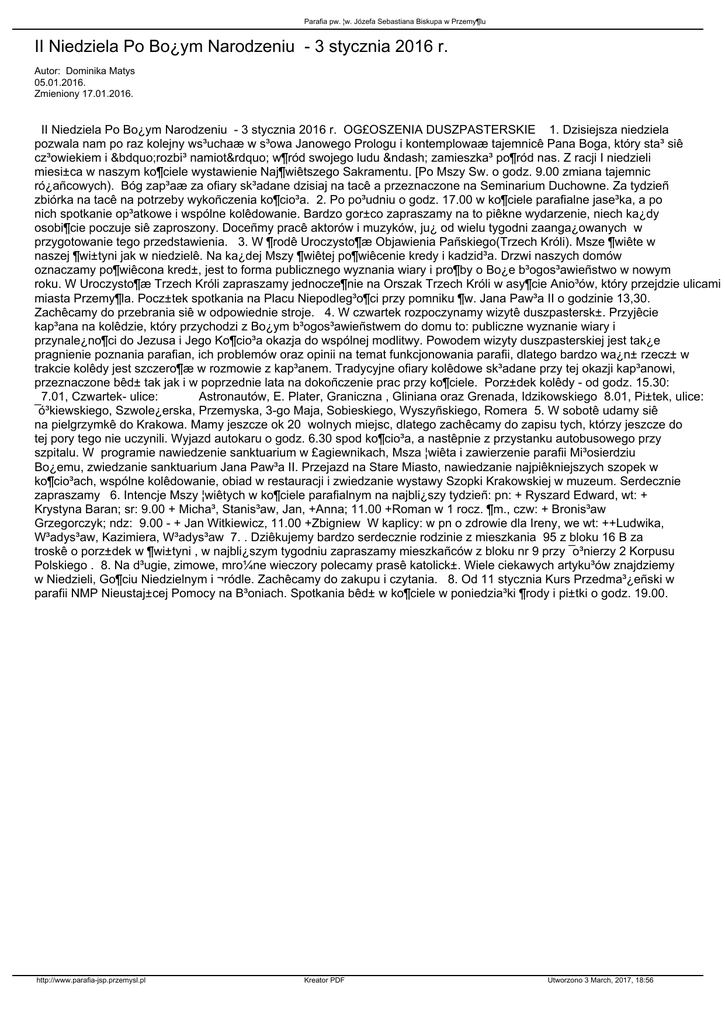 Parafia pw. ¦w. Józefa Sebastiana Biskupa w Przemy¶lu II Niedziela Po Bo¿ym Narodzeniu - 3 stycznia 2016 r. Autor: Dominika Matys 05.01.2016. Zmieniony 17.01.2016. II Niedziela Po Bo¿ym Narodzeniu - 3 stycznia 2016 r. OG£OSZENIA DUSZPASTERSKIE 1. Dzisiejsza niedziela pozwala nam po raz kolejny ws³uchaæ w s³owa Janowego Prologu i kontemplowaæ tajemnicê Pana Boga, który sta³ siê cz³owiekiem i „rozbi³ namiot” w¶ród swojego ludu – zamieszka³ po¶ród nas. Z racji I niedzieli miesi±ca w naszym ko¶ciele wystawienie Naj¶wiêtszego Sakramentu. [Po Mszy Sw. o godz. 9.00 zmiana tajemnic ró¿añcowych). Bóg zap³aæ za ofiary sk³adane dzisiaj na tacê a przeznaczone na Seminarium Duchowne. Za tydzieñ zbiórka na tacê na potrzeby wykoñczenia ko¶cio³a. 2. Po po³udniu o godz. 17.00 w ko¶ciele parafialne jase³ka, a po nich spotkanie op³atkowe i wspólne kolêdowanie. Bardzo gor±co zapraszamy na to piêkne wydarzenie, niech ka¿dy osobi¶cie poczuje siê zaproszony. Doceñmy pracê aktorów i muzyków, ju¿ od wielu tygodni zaanga¿owanych w przygotowanie tego przedstawienia. 3. W ¶rodê Uroczysto¶æ Objawienia Pañskiego(Trzech Króli). Msze ¶wiête w naszej ¶wi±tyni jak w niedzielê. Na ka¿dej Mszy ¶wiêtej po¶wiêcenie kredy i kadzid³a. Drzwi naszych domów oznaczamy po¶wiêcona kred±, jest to forma publicznego wyznania wiary i pro¶by o Bo¿e b³ogos³awieñstwo w nowym roku. W Uroczysto¶æ Trzech Króli zapraszamy jednocze¶nie na Orszak Trzech Króli w asy¶cie Anio³ów, który przejdzie ulicami miasta Przemy¶la. Pocz±tek spotkania na Placu Niepodleg³o¶ci przy pomniku ¶w. Jana Paw³a II o godzinie 13,30. Zachêcamy do przebrania siê w odpowiednie stroje. 4. W czwartek rozpoczynamy wizytê duszpastersk±. Przyjêcie kap³ana na kolêdzie, który przychodzi z Bo¿ym b³ogos³awieñstwem do domu to: publiczne wyznanie wiary i przynale¿no¶ci do Jezusa i Jego Ko¶cio³a okazja do wspólnej modlitwy. Powodem wizyty duszpasterskiej jest tak¿e pragnienie poznania parafian, ich problemów oraz opinii na temat funkcjonowania parafii, dlatego bardzo wa¿n± rzecz± w trakcie kolêdy jest szczero¶æ w rozmowie z kap³anem. Tradycyjne ofiary kolêdowe sk³adane przy tej okazji kap³anowi, przeznaczone bêd± tak jak i w poprzednie lata na dokoñczenie prac przy ko¶ciele. Porz±dek kolêdy - od godz. 15.30: 7.01, Czwartek- ulice: Astronautów, E. Plater, Graniczna , Gliniana oraz Grenada, Idzikowskiego 8.01, Pi±tek, ulice: ¯ó³kiewskiego, Szwole¿erska, Przemyska, 3-go Maja, Sobieskiego, Wyszyñskiego, Romera 5. W sobotê udamy siê na pielgrzymkê do Krakowa. Mamy jeszcze ok 20 wolnych miejsc, dlatego zachêcamy do zapisu tych, którzy jeszcze do tej pory tego nie uczynili. Wyjazd autokaru o godz. 6.30 spod ko¶cio³a, a nastêpnie z przystanku autobusowego przy szpitalu. W programie nawiedzenie sanktuarium w £agiewnikach, Msza ¦wiêta i zawierzenie parafii Mi³osierdziu Bo¿emu, zwiedzanie sanktuarium Jana Paw³a II. Przejazd na Stare Miasto, nawiedzanie najpiêkniejszych szopek w ko¶cio³ach, wspólne kolêdowanie, obiad w restauracji i zwiedzanie wystawy Szopki Krakowskiej w muzeum. Serdecznie zapraszamy 6. Intencje Mszy ¦wiêtych w ko¶ciele parafialnym na najbli¿szy tydzieñ: pn: + Ryszard Edward, wt: + Krystyna Baran; sr: 9.00 + Micha³, Stanis³aw, Jan, +Anna; 11.00 +Roman w 1 rocz. ¶m., czw: + Bronis³aw Grzegorczyk; ndz: 9.00 - + Jan Witkiewicz, 11.00 +Zbigniew W kaplicy: w pn o zdrowie dla Ireny, we wt: ++Ludwika, W³adys³aw, Kazimiera, W³adys³aw 7. . Dziêkujemy bardzo serdecznie rodzinie z mieszkania 95 z bloku 16 B za troskê o porz±dek w ¶wi±tyni , w najbli¿szym tygodniu zapraszamy mieszkañców z bloku nr 9 przy ¯o³nierzy 2 Korpusu Polskiego . 8. Na d³ugie, zimowe, mro¼ne wieczory polecamy prasê katolick±. Wiele ciekawych artyku³ów znajdziemy w Niedzieli, Go¶ciu Niedzielnym i ¬ródle. Zachêcamy do zakupu i czytania. 8. Od 11 stycznia Kurs Przedma³¿eñski w parafii NMP Nieustaj±cej Pomocy na B³oniach. Spotkania bêd± w ko¶ciele w poniedzia³ki ¶rody i pi±tki o godz. 19.00. http://www.parafia-jsp.przemysl.pl Kreator PDF Utworzono 3 March, 2017, 18:56