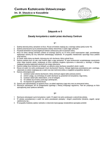 Centrum Kształcenia Ustawicznego im. St. Staszica w Koszalinie Załącznik nr 5 Zasady korzystania z szatni przez słuchaczy Centrum §1 1. 2. 3. 4. Szatnię stanowią boksy zamykane na klucz. Klucze od boksów znajdują się u woźnego szkoły (pokój numer 16). Szatnie przeznaczone są do przechowywania odzieży wierzchniej w czasie zajęć szkolnych. Przydział semestrów do poszczególnych boksów umieszczony jest na drzwiach boksu. Klucz do boksu danego semestru pobiera od woźnego dyżurny na 10 minut przed rozpoczęciem zajęć, pozostawiając legitymacje szkolną lub inny dokument stwierdzający tożsamość. W przypadku nieobecności dyżurnego klucz pobiera drugi dyżurny. 5. W czasie, kiedy boksy są otwarte, dyżurują przy nich słuchacze, którzy pobrali klucz. 6. Dyżurny pobiera klucz na cały czas trwania zajęć w jego semestrze. W razie konieczności wcześniejszego opuszczenia przez niego budynku szkoły, przekazuje on klucz osobiście drugiemu dyżurnemu w obecności p. woźnego, u którego następuje wymiana legitymacji szkolnych lub innego dokumentu. 7. Dyżurny oddaje klucz woźnemu po lekcjach, po zabraniu przez słuchaczy wszystkich ubrań z szatni. 8. Klucza od szatni nie wolno przekazywać innym słuchaczom! Dyżurny, którego legitymacja pozostawiona jest u woźnego, odpowiada za odzież znajdującą się w szatni oraz stan techniczny boksu (z wyjątkiem przypadków włamań.). 9. Dyżurny zobowiązany jest: 1) osobiście wydać ubrania słuchaczom, którzy skończyli zajęcia (tylko podczas przerw), 2) zwrócić uwagę, czy wchodzący do szatni słuchacze są uprawnieni do korzystania z tego boksu, 3) wydawać odzież tylko właścicielom, a nie ich kolegom, 4) nie oddalać się od boksu przed jego zamknięciem, 5) nie dopuścić do zgubienia klucza. 10. Dyżurny jest odpowiedzialny za zgubiony klucz, za odzież zaginioną z jego winy oraz za zniszczenia boksu. 11. Słuchacze zobowiązani SA do postępowania zgodnego z treścią niniejszego regulaminu. Fakt ten podpisują na liście sporządzonej przez opiekuna semestru. §2 1. 2. 3. Słuchacze zobowiązani są do korzystania z szatni. W salach nie wolno przebywać w wierzchniej odzieży. W odzieży pozostawionej w szatni nie wolno pozostawiać pieniędzy i drogich przedmiotów (biżuteria, zegarki, sprzęt radiofoniczny itp.). W przypadku kradzieży opiekun semestru w obecności dyżurującego wicedyrektora sporządza protokół.