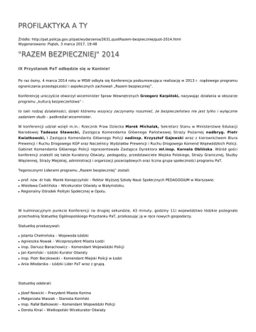 PROFILAKTYKA A TY Źródło: http://pat.policja.gov.pl/pat/wydarzenia/2631,quotRazem-bezpieczniejquot-2014.html Wygenerowano: Piątek, 3 marca 2017, 19:48 "RAZEM BEZPIECZNIEJ" 2014 IX Przystanek PaT odbędzie się w Koninie! Po raz ósmy, 4 marca 2014 roku w MSW odbyła się Konferencja podsumowująca realizację w 2013 r. rządowego programu ograniczania przestępczości i aspołecznych zachowań „Razem bezpieczniej”. Konferencję uroczyście otworzył wiceminister Spraw Wewnętrznych Grzegorz Karpiński, nazywając działania w obszarze programu „kulturą bezpieczeństwa” : to taki rodzaj działalności, dzięki któremu wszyscy zaczynamy rozumieć, że bezpieczeństwo nie jest tylko i wyłącznie zadaniem służb – podkreślał wiceminister. W konferencji udział wzięli m.in.: Rzecznik Praw Dziecka Marek Michalak, Sekretarz Stanu w Ministerstwie Edukacji Narodowej Tadeusz Sławecki, Zastępca Komendanta Głównego Państwowej Straży Pożarnej nadbryg. Piotr Kwiatkowski, I Zastępca Komendanta Głównego Policji nadinsp. Krzysztof Gajewski wraz z kierownictwem Biura Prewencji i Ruchu Drogowego KGP oraz Naczelnicy Wydziałów Prewencji i Ruchu Drogowego Komend Wojewódzkich Policji. Gabinet Komendanta Głównego Policji reprezentowała Zastępca Dyrektora mł.insp. Kornela Oblińska. Wśród gości konferencji znaleźli się także Kuratorzy Oświaty, pedagodzy, przedstawiciele Wojska Polskiego, Straży Granicznej, Służby Więziennej, Straży Miejskiej, administracji i organizacji pozarządowych oraz liczna grupa społeczności programu PaT. Tegorocznymi Liderami programu „Razem bezpieczniej” zostali: ● prof. nzw. dr hab. Marek Konopczyński – Rektor Wyższej Szkoły Nauk Społecznych PEDAGOGIUM w Warszawie. ● Wiesława Ćwiklińska – Wicekurator Oświaty w Białymstoku. ● Regionalny Ośrodek Polityki Społecznej w Opolu. W kulminacyjnym punkcie Konferencji (w drugiej sekundzie, 43 minuty, godziny 11) województwo łódzkie pożegnało przechodnią Statuetkę Ogólnopolskiego Przystanku PaT, przekazując ją w ręce nowych gospodarzy. Statuetkę przekazywali: ● Jolanta Chełmińska – Wojewoda Łódzki ● Agnieszka Nowak – Wiceprezydent Miasta Łodzi ● insp. Dariusz Banachowicz – Komendant Wojewódzki Policji ● Jan Kamiński – Łódzki Kurator Oświaty ● insp. Piotr Beczkowski – Komendant Miejski Policji w Łodzi ● Ania Włodarska – Łódzki Lider PaT wraz z grupą. Statuetkę odebrali: ● Józef Nowicki – Prezydent Miasta Konina ● Małgorzata Waszak – Starosta Koniński ● insp. Rafał Batkowski – Komendant Wojewódzki Policji ● Dorota Kinal – Wielkopolski Wicekurator Oświaty ● mł. insp. Sławomir Jądrzak – Komendant Miejski Policji w Koninie ● Patrycja Szkudlarek – Lider PaT województwa wielkopolskiego wraz z liderami i grupami PaT z Wielkopolski. Tym samym miasto Konin zostało gospodarzem IX Ogólnopolskiego Przystanku PaT. Gratulujemy! Dla społeczności PaT, a mamy nadzieję, że również dla wszystkich uczestników Konferencji dużym przeżyciem artystycznym był spektakl „Heysel” zagrany przez aktorów Chojnickiego Studia Rapsodycznego przy Domu Kultury w Chojnicach. Spektakl w reżyserii Grzegorza Szlangi przygotowany w ramach powiatowego programu „Kibicuję bezpiecznie” otrzymał II nagrodę w konkursie MSW. Tytułowe "Heysel" to nazwa stadionu w Brukseli, na którym 29 maja 1985 roku, podczas finałowego meczu o piłkarski Puchar Europy doszło do tragicznego w skutkach starcia kibiców dwóch przeciwnych drużyn FC Liverpool i Juventus Turyn. Multimedialna forma spektaklu pokazuje archiwalne nagrania tej tragedii. Tytuł ten zobaczą uczestnicy IX Ogólnopolskiego Przystanku PaT w Koninie w dniu otwarcia Akcji. Udział społeczności PaT w corocznych konferencja programu „Razem bezpieczniej” jest także formą uznania i podziękowania dla wszystkich wolontariuszy zaangażowanych w prowadzenie grup PaT i promowanie idei mody na życie bez uzależnień. Zdjęcia: Monika Kaiser-Maciejczak Zainstaluj wtyczkę Flash, aby zobaczyć odtwarzacz. pobierz film - 11.81 MB Ocena: 3/5 (8) Tweetnij