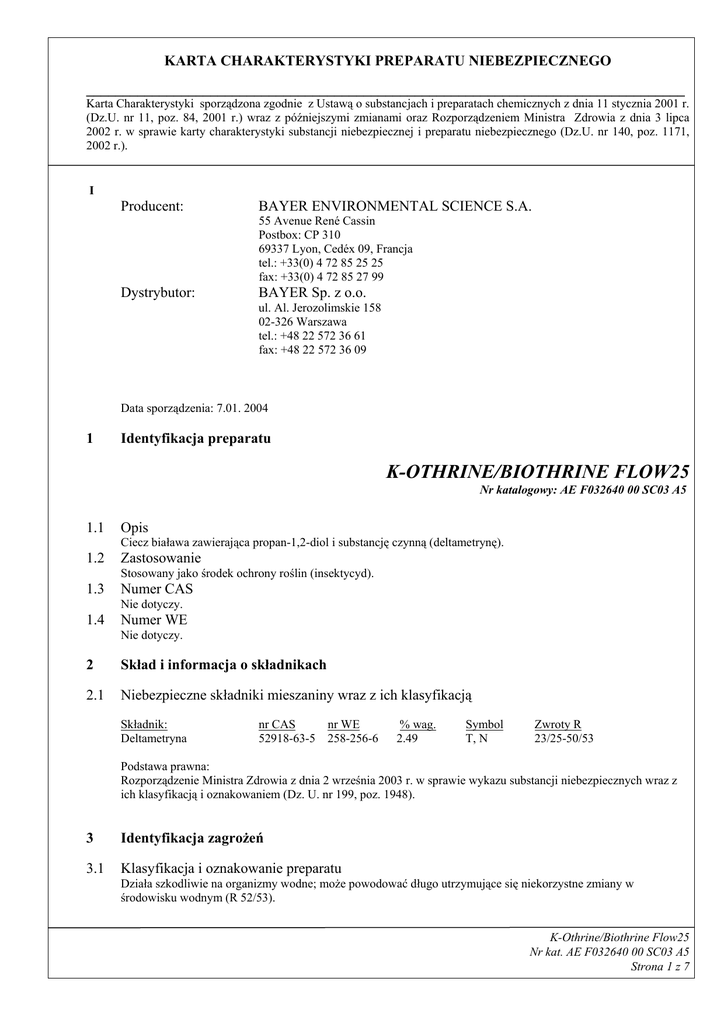 KARTA CHARAKTERYSTYKI PREPARATU NIEBEZPIECZNEGO __________________________________________________________________________________ Karta Charakterystyki sporządzona zgodnie z Ustawą o substancjach i preparatach chemicznych z dnia 11 stycznia 2001 r. (Dz.U. nr 11, poz. 84, 2001 r.) wraz z późniejszymi zmianami oraz Rozporządzeniem Ministra Zdrowia z dnia 3 lipca 2002 r. w sprawie karty charakterystyki substancji niebezpiecznej i preparatu niebezpiecznego (Dz.U. nr 140, poz. 1171, 2002 r.). I Producent: BAYER ENVIRONMENTAL SCIENCE S.A. 55 Avenue René Cassin Postbox: CP 310 69337 Lyon, Cedéx 09, Francja tel.: +33(0) 4 72 85 25 25 fax: +33(0) 4 72 85 27 99 Dystrybutor: BAYER Sp. z o.o. ul. Al. Jerozolimskie 158 02-326 Warszawa tel.: +48 22 572 36 61 fax: +48 22 572 36 09 Data sporządzenia: 7.01. 2004 1 Identyfikacja preparatu K-OTHRINE/BIOTHRINE FLOW25 Nr katalogowy: AE F032640 00 SC03 A5 1.1 Opis Ciecz biaława zawierająca propan-1,2-diol i substancję czynną (deltametrynę). 1.2 Zastosowanie Stosowany jako środek ochrony roślin (insektycyd). 1.3 Numer CAS Nie dotyczy. 1.4 Numer WE Nie dotyczy. 2 Skład i informacja o składnikach 2.1 Niebezpieczne składniki mieszaniny wraz z ich klasyfikacją Składnik: Deltametryna nr CAS nr WE 52918-63-5 258-256-6 % wag. 2.49 Symbol T, N Zwroty R 23/25-50/53 Podstawa prawna: Rozporządzenie Ministra Zdrowia z dnia 2 września 2003 r. w sprawie wykazu substancji niebezpiecznych wraz z ich klasyfikacją i oznakowaniem (Dz. U. nr 199, poz. 1948). 3 Identyfikacja zagrożeń 3.1 Klasyfikacja i oznakowanie preparatu Działa szkodliwie na organizmy wodne; może powodować długo utrzymujące się niekorzystne zmiany w środowisku wodnym (R 52/53). K-Othrine/Biothrine Flow25 Nr kat. AE F032640 00 SC03 A5 Strona 1 z 7 KARTA CHARAKTERYSTYKI PREPARATU NIEBEZPIECZNEGO __________________________________________________________________________________ Karta Charakterystyki sporządzona zgodnie z Ustawą o substancjach i preparatach chemicznych z dnia 11 stycznia 2001 r. (Dz.U. nr 11, poz. 84, 2001 r.) wraz z późniejszymi zmianami oraz Rozporządzeniem Ministra Zdrowia z dnia 3 lipca 2002 r. w sprawie karty charakterystyki substancji niebezpiecznej i preparatu niebezpiecznego (Dz.U. nr 140, poz. 1171, 2002 r.). Podstawa prawna: Rozporządzenie Ministra Zdrowia z dnia 2 września 2003 r. w sprawie kryteriów i sposobu klasyfikacji substancji i preparatów chemicznych (Dz.U nr 171, poz. 1666, 2003). 4 Pierwsza pomoc 4.1 Instrukcje postępowania w zależności od drogi narażenia Wdychanie: Kontakt z oczami: Kontakt ze skórą: Połknięcie: Ogólne zalecenia: Wskazówki dla lekarza wyprowadzić poszkodowanego na świeże powietrze. Zapewnić ciepło i odpoczynek. W przypadku utraty przytomności zastosować sztuczne oddychanie i wezwać lekarza. usunąć szkła kontaktowe, natychmiast płukać dużą ilością wody przez 15 minut. Jeżeli wystąpią jakiekolwiek podrażnienia skonsultować się z lekarzem. natychmiast zdjąć zanieczyszczoną odzież; skażoną skórę dokładnie zmywać wodą, a następnie posmarować kremem z witaminą E. Jeżeli wystąpią jakiekolwiek podrażnienia, skontaktować się z lekarzem. jeżeli nastąpi połknięcie, nie powodować wymiotów ponieważ istnieje ryzyko zachłyśnięcia się i przedostania się substancji do płuc. Zapewnić natychmiastową pomoc lekarską. powinny być przestrzegane zwykłe środki ostrożności jak przy pracy z chemikaliami. Jeżeli wystąpią jakiekolwiek niepokojące objawy, wezwać lekarza. stosować leczenie objawowe. 5 Postępowanie w przypadku pożaru 5.1 Zalecane środki gaśnicze Produkt trudno zapalny. Stosować środki gaśnicze odpowiednie do mediów palących się w otoczeniu. 5.2 Zabronione środki gaśnicze Silny strumień wody. 5.3 5.4 Niebezpieczne produkty rozkładu W czasie pożaru mogą powstawać tlenki węgla (CO, CO2), tlenki azotu. Specjalistyczny sprzęt przeciwpożarowy Odzież gazoszczelna w wersji antyelektrostatycznej, izolujący sprzęt ochrony układu oddechowego. 6 Postępowanie w przypadku niezamierzonego uwolnienia do środowiska 6.1 Zagrożenia dla zdrowia i środki ochrony ludzi Środki ostrożności: 6.2 Nakładać odzież ochronną i rękawice. Nie wdychać oparów, stosować sprzęt osłaniający drogi oddechowe. Unikać kontaktu ze skórą i oczami. W czasie pracy z produktem nie jeść, nie pić i nie palić. Po zakończeniu pracy należy całe ciało umyć w ciepłej wodzie z użyciem mydła i kilkakrotnie przepłukać jamę ustną wodą Zagrożenia dla środowiska i środki ochrony środowiska Zabezpieczyć przed wprowadzeniem do miejskiego systemu wodno-kanalizacyjnego i cieków wodnych. Usunąć ludzi i zwierzęta. Jeżeli produkt przedostanie się do kanalizacji lub wody, natychmiast powiadomić odpowiednie władze. 6.3 Metody unieszkodliwiania, zbierania i oczyszczania środowiska Rozlany produkt zaabsorbować w chemicznie obojętny materiał wiążący (piasek, ziemia okrzemkowa), zebrać do szczelnie zamykanych pojemników i przekazać od uprawnionego odbiorcy odpadów. Skażone powierzchnie i sprzęty zmyć wodą z dodatkiem detergentów. 7 7.1 Postępowanie z preparatem i jego magazynowanie Postępowanie z preparatem - środki ostrożności Stosować tylko w dobrze wentylowanych pomieszczeniach. Trzymać z daleka od źródeł wysokiej temperatury i źródeł zapłonu. Wskazane jest podejmowanie środków ostrożności, aby podczas pracy z produktem unikać kontaktu K-Othrine/Biothrine Flow25 Nr kat. AE F032640 00 SC03 A5 Strona 2 z 7 KARTA CHARAKTERYSTYKI PREPARATU NIEBEZPIECZNEGO __________________________________________________________________________________ Karta Charakterystyki sporządzona zgodnie z Ustawą o substancjach i preparatach chemicznych z dnia 11 stycznia 2001 r. (Dz.U. nr 11, poz. 84, 2001 r.) wraz z późniejszymi zmianami oraz Rozporządzeniem Ministra Zdrowia z dnia 3 lipca 2002 r. w sprawie karty charakterystyki substancj