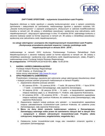 ZAPYTANIE OFERTOWE – wyżywienie Uczestników/-czek Projektu Zapytanie ofertowe w trybie zgodnym z zasadą konkurencyjności wraz z opisem przedmiotu zamówienia i załącznikami do zamówienia, realizowanego zgodnie z zapisami rozdziału VIII. „Zasada konkurencyjności” (i zapisami powiązanymi) „Wytycznych w zakresie kwalifikowalności kosztów w ramach art. 36 ustawy o rehabilitacji zawodowej i społecznej oraz zatrudnianiu osób niepełnosprawnych”, dotyczących ogłoszonego w dniu 15 września 2014r. piętnastego konkursu o zlecenie realizacji zadań (w formie wsparcia) w ramach art. 36 ustawy o rehabilitacji zawodowej i społecznej oraz zatrudnianiu osób niepełnosprawnych, na usługi cateringowe i powiązane dla niepełnosprawnych Uczestników/-czek Projektu „Kontynuacja prowadzenia placówki wsparcia i rozwoju osobistego osób niepełnosprawnych w okresie 2016 - 2018”, realizowanego w ramach XXIV konkursu Państwowego Funduszu Rehabilitacji Osób Niepełnosprawnych o zlecenie realizacji zadań (w formie wsparcia) w ramach art. 36 ustawy o rehabilitacji zawodowej i społecznej oraz zatrudnianiu osób niepełnosprawnych, (dalej „Projekt”), realizowanego przez Fundację Instytut Rozwoju Regionalnego. Nr postępowania: 1/PFRON/PLAC2016/2016/4, data: 15.05.2016r. 1. 2. NAZWA I ADRES ZAMAWIAJĄCEGO Fundacja Instytut Rozwoju Regionalnego 31-261 Kraków, ul. Wybickiego 3A Adres strony internetowej: http://www.firr.org.pl OPIS PRZEDMIOTU ZAMÓWIENIA Przedmiotem niniejszego zapytania jest wykonanie usługi cateringowej (dwudaniowy obiad + kolacja) podczas szkoleń grupowych realizowanych w ramach Projektu: 1. Zapewnienie obiadów podczas szkoleń: • 05 czerwca 2016r – 10 czerwca 2016r. – 7 osób, 26 czerwca 2016r. – 1 lipca 2016r. – 7 osób – w siedzibie Zamawiającego, salę zapewnia Zamawiający, • 16 sierpnia 2016r. – 26 sierpnia 2016r. – 10 osób – w bezpośrednim sąsiedztwie miejsca realizacji zajęć, tj. ul. Stradomska 11, Kraków, salę zapewnia Wykonawca, • 04 września 2016r. – 09 września 2016r. – 10 osób – w bezpośrednim sąsiedztwie miejsca realizacji zajęć (centrum Krakowa; do ustalenia przez Zamawiającego), salę zapewnia Wykonawca. 2. Zapewnienie ciepłych kolacji podczas w/w szkoleń - w bezpośrednim sąsiedztwie miejsca zakwaterowania Uczestników/-czek (centrum Krakowa; do ustalenia przez Zamawiającego), salę zapewnia Wykonawca. 3. Menu na dany dzień zostanie każdorazowo ustalone z Zamawiającym. Zamawiający zastrzega sobie prawo do zamówienia różnych dań w danym dniu – związanych z dietami zdrowotnymi Uczestników/-czek Projektu (dieta cukrzycowa, bezglutenowa, wegetariańska, wegańska itp.). 4. Ostateczna liczba Uczestników/-czek mogą ulec niewielkim zmianom zgodnie z potrzebami Zamawiającego. 3. WSPÓLNY SŁOWNIK ZAMÓWIEŃ (CPV) 55000000-0 - Usługi hotelarskie, restauracyjne i handlu detalicznego. 4. ZADANIA PO STRONIE WYKONAWCY Wykonawca będzie odpowiedzialny za realizację zamówienia, zgodnie z pkt. 2 niniejszego Zapytania.. 5. ZADANIA PO STRONIE ZAMAWIAJĄCEGO 1. Współpraca w zakresie obsługi Uczestników/-czek. 2. Obsługa organizacyjno-księgowa prowadzonego Projektu. 6. TERMIN I MIEJSCE WYKONANIA ZAMÓWIENIA 1. Okres wykonania usługi: od 05.06.2016 roku do 10.09.2016 roku. 2. Zamawiający przewiduje wykonanie zamówienia w Krakowie. 7. WARUNKI UDZIAŁU W POSTĘPOWANIU 1. Prowadzenie działalności gospodarczej przez Wykonawcę w zakresie objętym Zapytaniem ofertowym. 2. Złożenie oferty zgodnej z Załącznikiem 1 do Zapytania ofertowego oraz oświadczenia, zgodnego z Załącznikiem 2 do Zapytania ofertowego, w sposób i terminie określonych w pkt 12 Zapytania ofertowego. 3. Wykonawca nie może być powiązany osobowo lub kapitałowo z Zamawiającym. Przez powiązania kapitałowe lub osobowe rozumie się wzajemne powiązania między Zamawiającym lub osobami upoważnionymi do zaciągania zobowiązań w jego imieniu, lub osobami wykonującymi w jego imieniu czynności związane z przygotowaniem i przeprowadzeniem procedury wyboru Wykonawcy a Wykonawcą, polegające w szczególności na: • uczestniczeniu w spółce jako wspólnik spółki cywilnej lub spółki osobowej; • posiadaniu co najmniej 10 % udziałów lub akcji; • pełnieniu funkcji członka organu nadzorczego lub zarządzającego, prokurenta, pełnomocnika; • pozostawaniu w związku małżeńskim, w stosunku pokrewieństwa lub powinowactwa w linii prostej, pokrewieństwa lub powinowactwa w linii bocznej do drugiego stopnia lub w stosunku przysposobienia, opieki lub kurateli. Ocena spełnienia przedstawionych w pkt. 7 warunków zostanie dokonana według formuły „spełnia / nie spełnia”. Zleceniobiorca, który nie spełni któregokolwiek z warunków, zostanie odrzucony w postępowaniu. 8. DOKUMENTY WYMAGANE W CELU POTWIERDZENIA SPEŁNIENIA WARUNKÓW Zamawiający w celu potwierdzenia warunków udziału w postępowaniu wymaga przedłożenia następujących dokumentów: 1. Formularza ofertowego, zgodnie z wzorem z załącznika nr 1. 2. Oświadczenia o braku powiązań kapitałowych lub osobowych z Zamawiającym, zgodnie ze wzorem z załącznika nr 2; 9. OPIS SPOSOBU PRZYGOTOWANIA OFERTY a. Wymagania podstawowe: a. Oferta powinna być sporządzona wg wzoru FORMULARZ OFERTOWY- wycena przedmiotu zamówienia (załącznik nr 1). b. Oferta i oświadczenie powinny być podpisane przez osobę upoważnioną. c. Wykonawca ponosi wszelkie koszty związane z opracowaniem i złożeniem oferty, niezależnie od wyniku postępowania. b. Cena: Cena przedstawiona w ofercie (cena jednego zestawu obiad + kolacja) powinna przedstawiać pełny koszt usługi opisanej w niniejszym Zapytaniu. c. Forma oferty: a. Oferta powinna być sporządzona w języku polskim. b. Dopuszczalne formy to forma pisemna i forma elektroniczna. c. W przypadku formy elektronicznej należy pocztą elektroniczną przesłać skan wypełnionych i podpisanych załąc