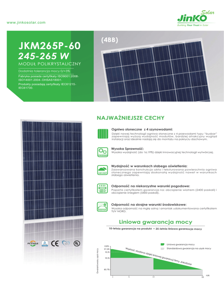 www.jinkosolar.com (4BB) JKM265P-60 245-265 W MODUŁ POLIKRYSTALICZNY Dodatnia tolerancja mocy 0/+3% Fabryka posiada certyfikaty ISO9001:2008、 ISO14001:2004、OHSAS18001. Produkty posiadają certyfikaty IEC61215、 IEC61730. NAJWAŻNIEJSZE CECHY Ogniwo słoneczne z 4 szynowodami: Dzięki nowej technologii ogniwa słoneczne z 4 przewodami typu “busbar” zapewniają wyższą wydajność modułów, bardziej atrakcyjny wygląd instalacji oraz idealnie nadają się do montażu na pokryciu dachowym. Wysoka Sprawność: Wysoka wydajność (do 16,19%) dzięki innowacyjnej technologii wytwórczej. Wydajność w warunkach słabego oświetlenia: Zaawansowana konstrukcja szkła i teksturowana powierzchnia ogniwa słonecznego zapewniają doskonałą wydajność nawet w warunkach słabego oświetlenia. Odporność na niekorzystne warunki pogodowe: Poparta certyfikatem gwarancja na: obciążenie wiatrem (2400 paskali) i obciążenie śniegiem (5400 paskali). Odporność na skrajne warunki środowiskowe: Wysoka odporność na mgłę solną i amoniak udokumentowana certyfikatem TUV NORD. Liniowa gwarancja mocy 10-letnia gwarancja na produkt 25-letnia liniowa gwarancja mocy Liniowa gwarancja mocy MCS Gwarantowany uzysk mocy 100% War tość 97.5% 95.% dod Standardowa gwarancja na uzysk mocy ana dzię ki lin iowe 90.% j gw aran cji fir my J inko Sola r 80.7% 1 5 12 25 rok Wydajność elektryczna i związek z temperaturą Wymiary 942 40 A Charakterystyka prądowo-napięciowa (260 W) Ⅱ 100 Rozgałęźnik XXXXXXXXXXXXXXXXXXXX Ⅲ Ⅰ 400 W/m² 180 160 280 9 L 1650 600 W/m² 800 W/m² 10 240 4 8 1360 860 Ø 200 7 + Anoda Złącze A 6 160 5 120 4 3 Moc (W) Katoda - Natężenie (A) Otwory do uziemienia A 1000 W/m² Etykieta Otwory montażowe 2- Zależność temperatury od Isc,Voc,Pmax 80 2 40 Normalized Isc,Voc,Pmax(%) 992 140 120 Isc 100 0 Przód Bok Pmax 60 40 20 1 A Voc 80 0 5 10 20 15 25 30 35 45 40 0 -50 Tył -25 0 25 50 75 100 Temperatura ogniwa (℃) Napięcie (V) XXXXXXXXXXXXXXXXXXXX Ⅰ Ⅲ 5.5 70 Cechy mechaniczne 9 40 3 4.5 Typogniwa Polikrystaliczne156×156mm(6cali) Liczbaogniw 14 70 8 60(6×10) Wymiary 35 Ⅱ 1650×992×40mm(65,00×39,05×1,57cala) Waga 19,0kg(41,9lb) 3,2mm,Wysokaprzepuszczalność, Przedniawarstwaszklana Niskazawartośćżelaza,Szkłohartowane Anodyzowanystopaluminium Rama Konfiguracja opakowania (Dwakartony=Jednapaleta) zestandardemIP67 RozgałęźnikZgodny 25szt./karton,50sztuk/paleta,700szt./kontenerwysokości40stóp Przewodywyjściowe TÜV1×4.0mm2,Długość:900mm SPECYFIKACJE JKM245P Typmodułu STC NOCT JKM250P STC NOCT JKM255P STC NOCT JKM260P JKM265P STC NOCT STC NOCT 197Wp Maksymalnamoc(Pmax) 245Wp 181Wp 250Wp 184Wp 255Wp 189 Wp 260Wp 193Wp 265Wp Maksymalnenapięcieprądu(Vmp) 30.1V 27.8V 30.5V 28.0V 30.8V 28.5V 31.1V 28.7V 31.4V 29.0V Maksymalnenatężenieprądu(Imp) 8.14A 6.50A 8.20A 6.56A 8.28A 6.63A 8.37A 6.71A 8.44A 6.78A Napięcieobwoduotwartego(Voc) 37.5V 34.8V 37.7V 34.9V 38.0V 35.2V 38.1V 35.2V 38.6V 35.3V Prądzwarciowy(Isc) 8.76A 7.16A 8.85A 7.21A 8.92A 7.26A 8.98A 7.31A 9.03A 7.36A Wydajnośćmodułu(%) 14.97% Temperaturapracy(℃) Maksymalnenapięciesystemu Maksymalnawartośćprąduznamionowegobezpiecznika 15.27% 15.58% 1000VDC (IEC) 15A 0~+3% Tolerancjamocy WspółczynniktemperaturowyPmax -0.41%/℃ WspółczynniktemperaturowyVoc -0.31%/℃ WspółczynniktemperaturowyIsc 0.06%/℃ Znamionowatemperaturapracyogniw(NOCT) 45±2℃ STC : NOCT: 16.19% 15.89% -40℃~+85℃ Natężeniepromieniowaniasłonecznego wwarunkachtestowych1000W/m2 Natężeniepromieniowaniasłonecznego wwarunkachtestowych800W/m2 Temperaturamodułu25°C Temperaturamodułu20°C AM=1,5 AM=1,5 Prędkośćwiatru1m/s * Tolerancjapomiarumocy:±3% Firma zastrzega sobie ostateczne prawo do objaśniania wszelkich informacji zawartych w niniejszym dokumencie. PO-MKT-265P_v1.0_rev2015