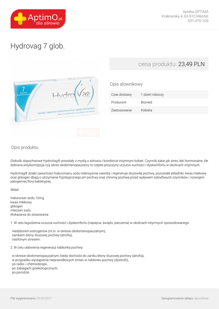 Apteka OPTIMA Krakowska 4, 63-510 Mikstat 531-470-109 Hydrovag 7 glob. cena produktu: 23,49 PLN Opis słownikowy Czas dostawy 1 dzień roboczy Producent Biomed Zastosowanie Kobieta Opis produktu Globulki dopochwowe HydroVag® powstały z myślą o zdrowiu i komforcie intymnym kobiet. Czynniki takie jak stres, leki hormonalne, źle dobrana antykoncepcja czy okres okołomenopauzalny to częste przyczyny uczucia suchości i dyskomfortu w okolicach intymnych. HydroVag® dzięki zawartości hialuronianu sodu intensywnie nawilża i regeneruje śluzówkę pochwy, pozostałe składniki: kwas mlekowy oraz glikogen dbają o utrzymanie fizjologicznego pH pochwy oraz chronią pochwę przed wpływem szkodliwych czynników i rozwojem patogennej flory bakteryjnej. Skład hialuronian sodu 10mg kwas mlekowy glikogen mleczan sodu Wskazania do stosowania 1. W celu łagodzenia uczucia suchości i dyskomfortu (napięcia, świądu, pieczenia) w okolicach intymnych spowodowanego: niedoborem estrogenów (m.in. w okresie okołomenopauzalnym), zanikiem błony śluzowej pochwy (atrofia), nasilonym stresem. 2. W celu ułatwienia regeneracji nabłonka pochwy: w okresie okołomenopauzalnym, kiedy dochodzi do zaniku błony śluzowej pochwy (atrofia), w przypadku wystąpienia nieprawidłowych zmian w nabłonku pochwy (dystrofii), po radio- i chemioterapii, po zabiegach ginekologicznych, po porodzie. Plik wygenerowano: 03-03-2017 Oprogramowanie sklepu: AptusShop Apteka OPTIMA Krakowska 4, 63-510 Mikstat 531-470-109 3. W celu łagodzenia bólu w przypadku bolesnych stosunków (dyspareunia). 4. W celu łagodzeni dyskomfortu związanego z obrzękiem, zaczerwienieniem, świądem okolic sromu oraz pojawieniem się nieprawidłowej wydzieliny. Przeciwwskazania nie stosować w przypadku nadwrażliwości na którykolwiek ze składników wyrobu; w przypadku ostrych infekcji pochwy zalecane jest stosowanie globulek pod nadzorem lekarza; ze względu na brak odpowiednich badań, w czasie ciąży i karmienia piersią preparat stosować po konsultacji z lekarzem; nie stosować równocześnie z innymi preparatami podawanymi dopochwowo; preparat stosowany z lekami miejscowo znieczulającymi, ze względu na zawartość w składzie hialuronianu sodu, może wydłużać okres znieczulenia; nie stosować w trakcie menstruacji; bezpośrednio po aplikacji globulki nie podejmować współżycia płciowego; nie stosować łącznie z prezerwatywami i wkładkami antykoncepcyjnymi wykonanymi z lateksu ze względu na obecność w składzie preparatu modyfikowanych tłuszczów; nie stosować po upływie daty ważności umieszczonej na opakowaniu; nie stosować w przypadku uszkodzenia blistra; nie połykać; wyrób przechowywać w miejscu niewidocznym i niedostępnym dla dzieci. Jeśli po zastosowaniu preparatu pojawią się objawy niepożądane tj. nasilenie świądu, pieczenia, wysypka itp. należy zaprzestać stosowania preparatu i skonsultować się z lekarzem. W celu zabezpieczenia bielizny przed ewentualnym zabrudzeniem w trakcie kuracji należy stosować wkładki higieniczne. Każdą globulkę należy stosować jednorazowo. Ponowne użycie tej samej globulki niesie ze sobą ryzyko wprowadzenia zanieczyszczeń. Dawkowanie Kuracja podstawowa: 1 globulka dopochwowa na noc przez 7 kolejnych dni lub zgodnie z zaleceniem lekarza. Kuracja podtrzymująca: 1 globulka dopochwowa na noc co 2-3 dni do uzyskania trwałej poprawy lub zgodnie z zaleceniem lekarza. W przypadku uzupełnienia kuracji podstawowej kuracją podtrzymującą, łączny czas terapii może wynieść do 30 dni. Po tym czasie należy przerwać kurację na okres 7 dni. Plik wygenerowano: 03-03-2017 Powered by TCPDF (www.tcpdf.org) Oprogramowanie sklepu: AptusShop