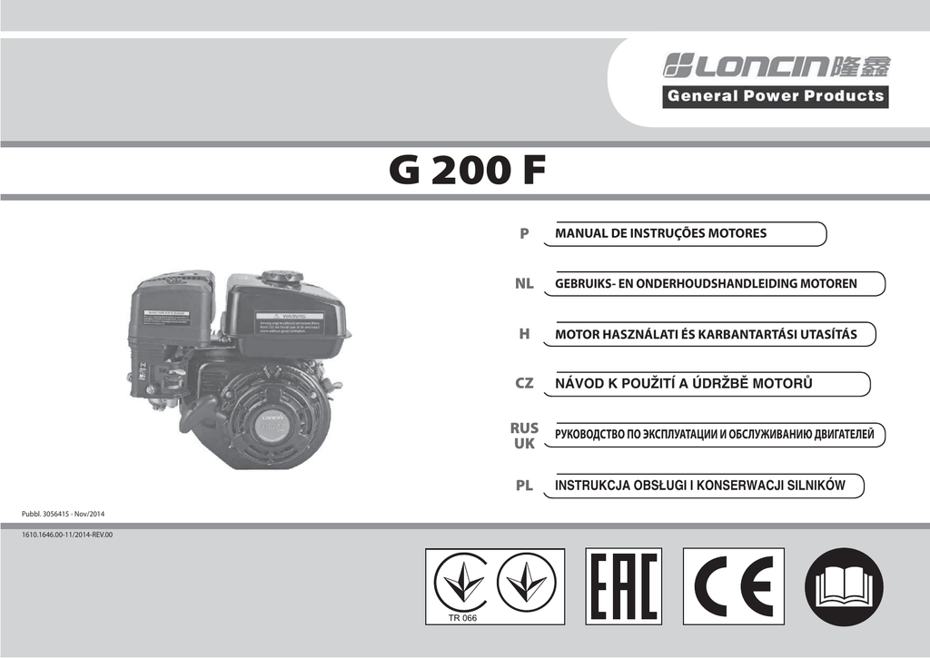 G 200 F P MANUAL DE INSTRUÇÕES MOTORES NL GEBRUIKS- EN ONDERHOUDSHANDLEIDING MOTOREN H MOTOR HASZNÁLATI ÉS KARBANTARTÁSI UTASÍTÁS CZ NÁVOD K POUÎITÍ A ÚDRÎBù MOTORÒ RUS UK PL РУКОВОДСТВО ПО ЭКСПЛУАТАЦИИ И ОБСЛУЖИВАНИЮ ДВИГАТЕЛЕЙ INSTRUKCJA OBS¸UGI I KONSERWACJI SILNIKÓW Pubbl. 3056415 - Nov/2014 1610.1646.00-11/2014-REV.00 45 Português Nederlands Magyar INTRODUÇÃO INLEIDING BEVEZETà CAUTELA – Antes de ligar o motor: • Leia com atenção o manual de instruções do motor e as instruções relativas ao equipamento accionada por este motor. • Se não se seguirem as instruções podem-se vir a criar situações de perigo com lesões, e até mesmo com casos de morte. As instruções para o uso e a manutenção contêm normas de segurança para: • se aperceber dos riscos relacionados com os motores; • informar-vos dos riscos de acidentes relacionados com tais riscos e • aconselhar-vos a como evitar ou reduzir o risco de acidentes. O manual do operador O presente manual de instruções contém informações para a proteção pessoal do seu utilizador. LEIA-O. Guarde-o num local seguro para futuras consultas. É importante saber o que fazer antes de começar a utilizar o aparelho. Uma preparação e uma manutenção adequadas permitem obter os rendimentos mais satisfatórios do próprio motor, e garantem a própria segurança. Contacte o seu revendedor ou o distribuidor local se não compreender as instruções neste manual. Para além das instruções de funcionamento, este manual contém informações que requerem a sua especial atenção. Estas informações estão assinaladas com os seguintes símbolos: AVISO: quando existe o risco de acidentes ou lesões pessoais ou graves danos a coisas. ATENÇÃO: quando existe o risco de danos no aparelho ou a a cada uma das componentes do mesmo. ATENÇÃO – Para garantir um uso seguro e correcto do motor, guarde o presente manual de instruções sempre perto do aparelho. Não empreste ou alugue o seu motor sem o manual de instruções. ATENÇÃO – permita o uso do motor apenas a pessoas capazes de compreenderem o conteúdo do presente manual. 46 LET OP – Voordat u de motor inschakelt: • Lees de gebruiks- en onderhoudsinstructies van de motor en de instructies van apparatuur die aangedreven wordt door deze motor zorgvuldig door. • Als u de instructies niet opvolgt, kunnen er gevaarlijke situaties of zelfs dodelijk letsel ontstaan. De gebruiks- en onderhoudsinstruc ties bevatten veiligheidsnormen ten behoeve van het volgende: • U bewust te maken van de risico's die samenhangen met de motoren • U te informeren over de risico's op ongevallen die samenhangen met dergelijke risico's en • U te adviseren over hoe u de risico's op ongevallen kunt voorkomen of verminderen. Gebruiks- en onderhoudshandleiding Deze gebruiks- en onderhoudshandleiding bevat informatie voor de persoonlijke bescherming van de bediener. LEES HEM ZORGVULDIG DOOR. Bewaar deze handleiding op een veilige plaats voor toekomstige raadpleging. Het is belangrijk om te weten wat u moet doen voordat u de motor gaat gebruiken. Door een goede voorbereiding en een juist onderhoud verkrijgt u bevredigende prestaties van de motor, en wordt de veiligheid gegarandeerd. Neem contact op met uw plaatselijke dealer als u instructies in deze handleiding niet begrijpt. Naast de gebruiks- en onderhoudsinstructies bevat deze handleiding informatie die uw speciale aandacht vraagt. Deze informatie is aangegeven met de volgende symbolen: WAARSCHUWING: wanneer er risico bestaat op ongelukken of persoonlijk letsel of ernstige schade aan voorwerpen. LET OP: wanneer er risico bestaat op schade aan de motor of onderdelen ervan. WAARSCHUWING – Om een veilig en correct gebruik van de motor te garanderen dient u deze gebruiks- en onderhoudshandleiding altijd in de buurt van de motor te bewaren. Leen de motor niet uit en verhuur hem niet zonder de gebruiks- en onderhoudshandleiding. WAARSCHUWING – het gebruik van de motor is uitsluitend toegestaan aan personen die in staat zijn om de inhoud van deze handleiding te begrijpen. ÓVINTÉZKEDÉS - A motor beindítása elŒtt: • Figyelmesen olvassa el a motor használati és karbantartási utasítását, valamint a jelen motor által mıködtetett felszerelések utasításait. • Ha nem követik az utasításokat, sérüléssel vagy akár halállal fenyegetŒ helyzetek alakulhatnak ki. A használati és karbantartási utasítás az alábbiakra vonatkozó biztonsági elŒírásokat tartalmaz: • Ismerteti a motorral kapcsolatos kockázatokat • Leírja az ezen kockázatokkal kapcsolatos balesetek kockázatát, és • Tanácsokat tartalmaz a balesetek kockázatának elkerülésére, illetve csökkentésére. Használati és karbantartási utasítás A jelen használati és karbantartási utasítás a gépkezelŒ személyes védelmére vonatkozó információkat tartalmaz. OLVASSA EL. Tartsa biztonságos helyen iránymutató dokumentumként. Fontos tudni, mit kell tenni az egység használatának megkezdése elŒtt. A helyes elŒkészítés és karbantartás lehetŒvé teszi, hogy a motor megfelelŒen mıködjön, és garantálja a biztonságot. Ha a jelen kézikönyvben található utasítások valamelyike nem egyértelmı, forduljon a helyi terjesztŒhöz vagy viszonteladóhoz. A használati és karbantartási utasításokon túl a jelen kézikönyv olyan információkat is tartalmaz, amelyek különös figyelmet igényelnek. Ezeket az információkat az alábbiakban leírt szimbólumok jelzik: FIGYELEM: ha baleset vagy személyi sérülés, illetve súlyos anyagi kár kockázata áll fönn. ÓVINTÉZKEDÉS: ha az egység vagy egyes részegységei károsodásának veszélye áll fenn. FIGYELEM - A motor biztonságos és helyes használatának biztosítására a jelen tárolja mindig az egység közelében a jelen használati és karbantartási utasítást. A használati és ka